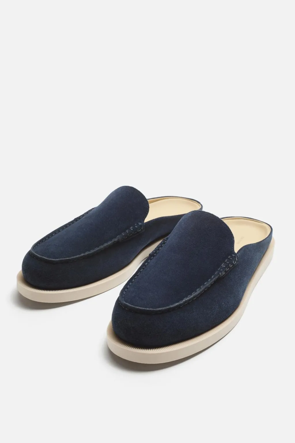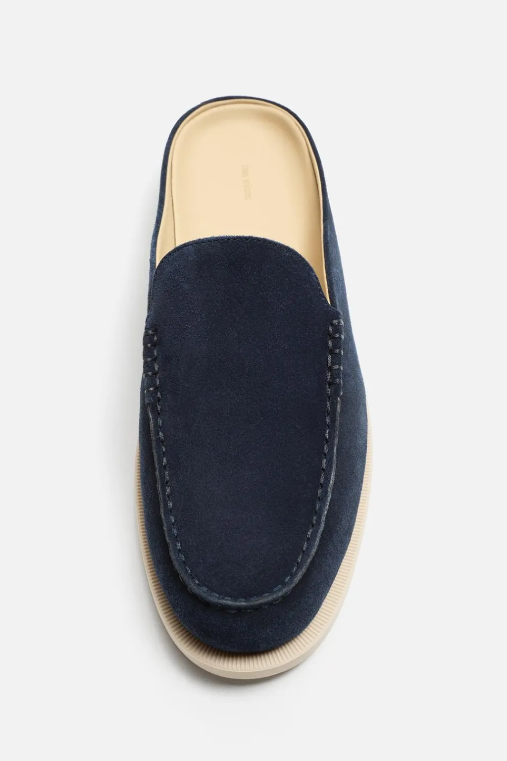 Mocasín destalonado. Parte superior fabricada en piel con acabado serraje. Corte liso con detalle de bordón. Horma redonda. Suela plana..