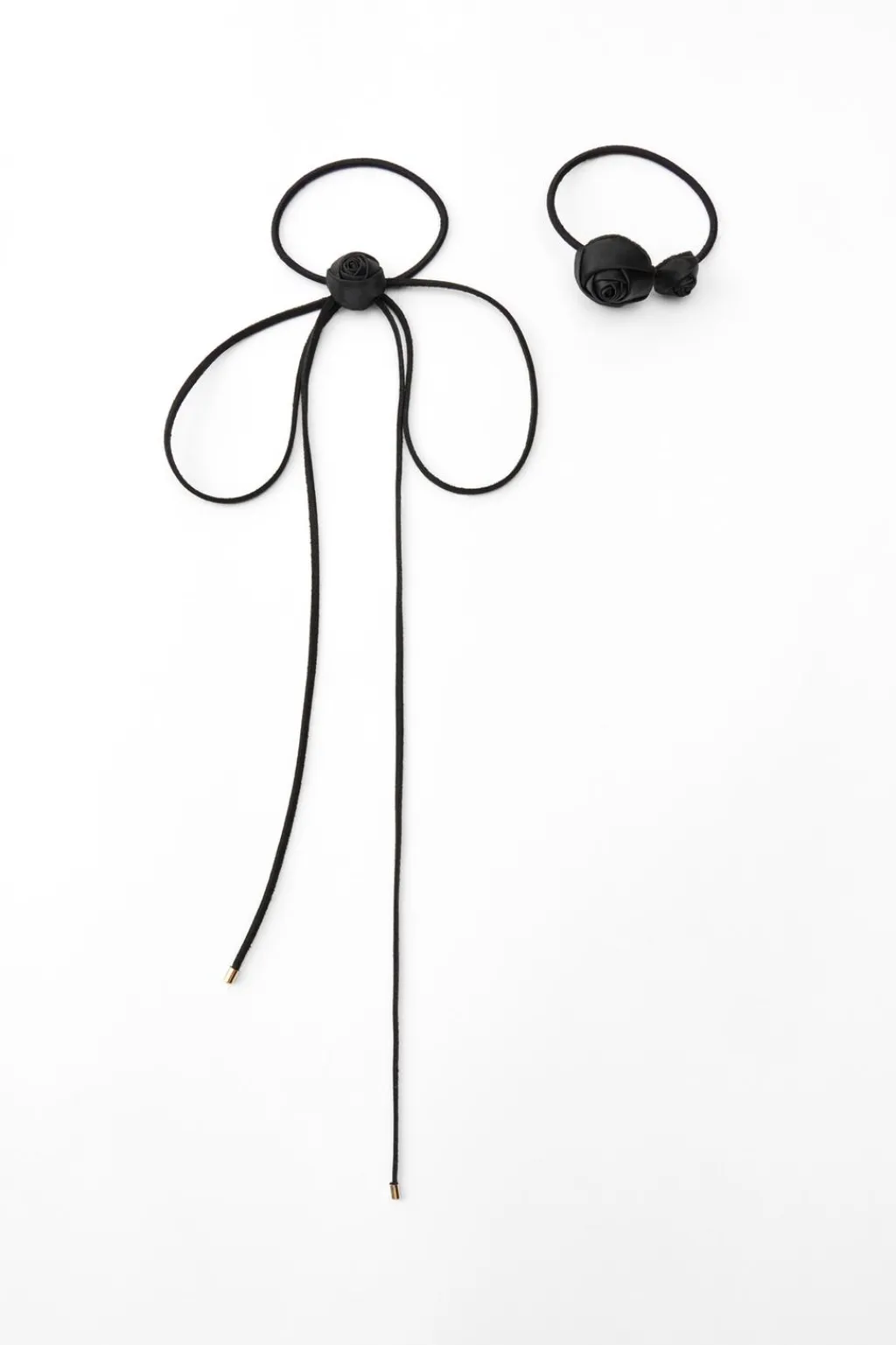 – Goma para el pelo en forma de lazo con aplicación de flor en tejido. Acabados con pieza metálica.