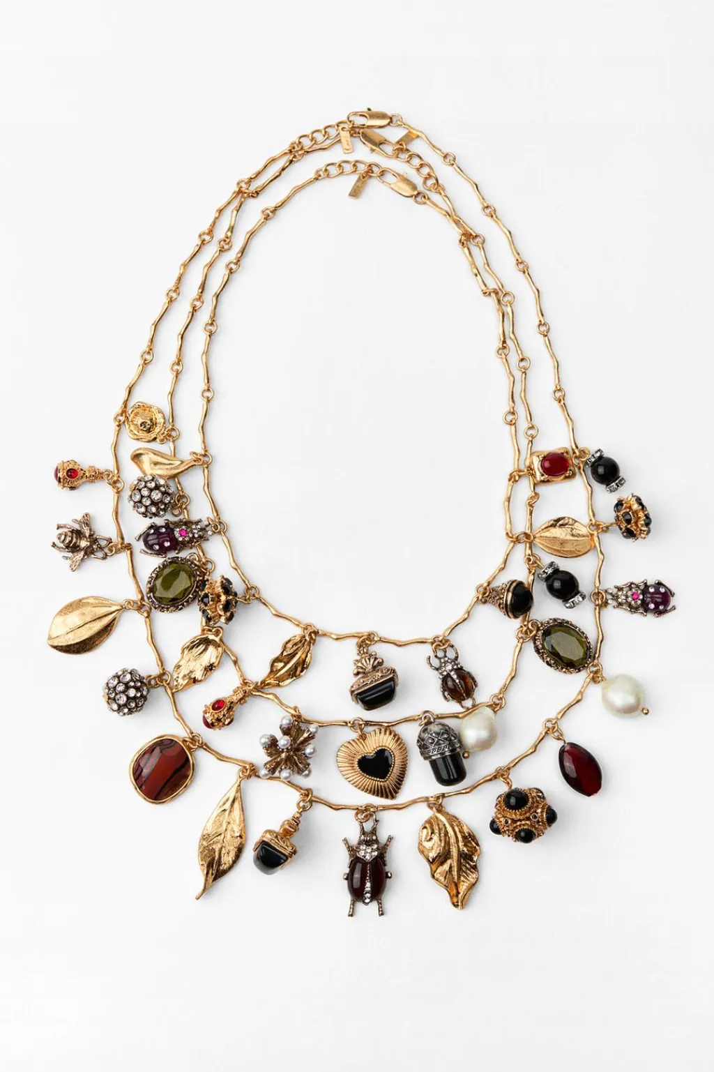Pack de tres collares metálicos de diferente longitud. Colgantes de charms en diferentes formas, tamaños y materiales. Cierre con mosquetón.