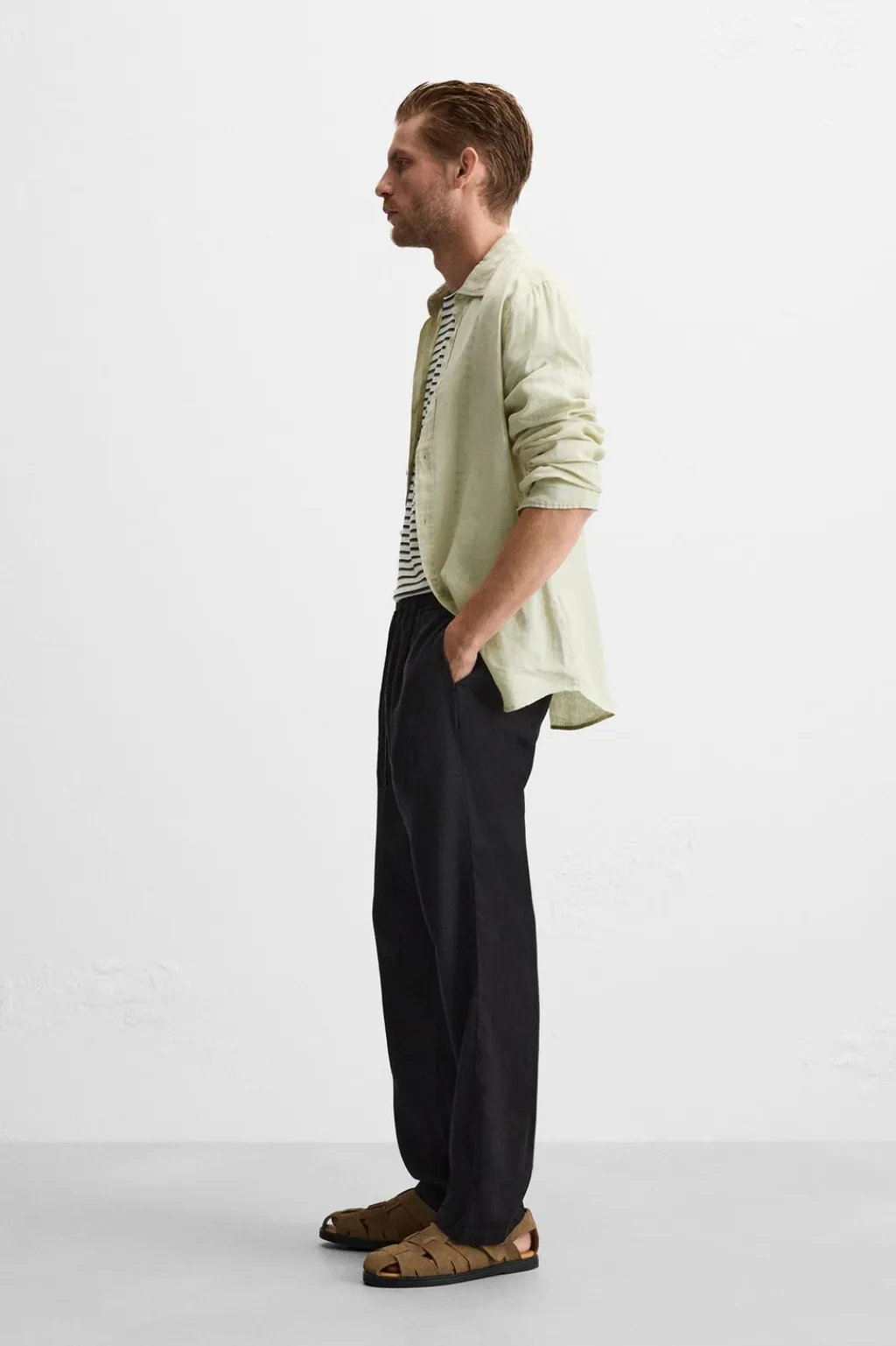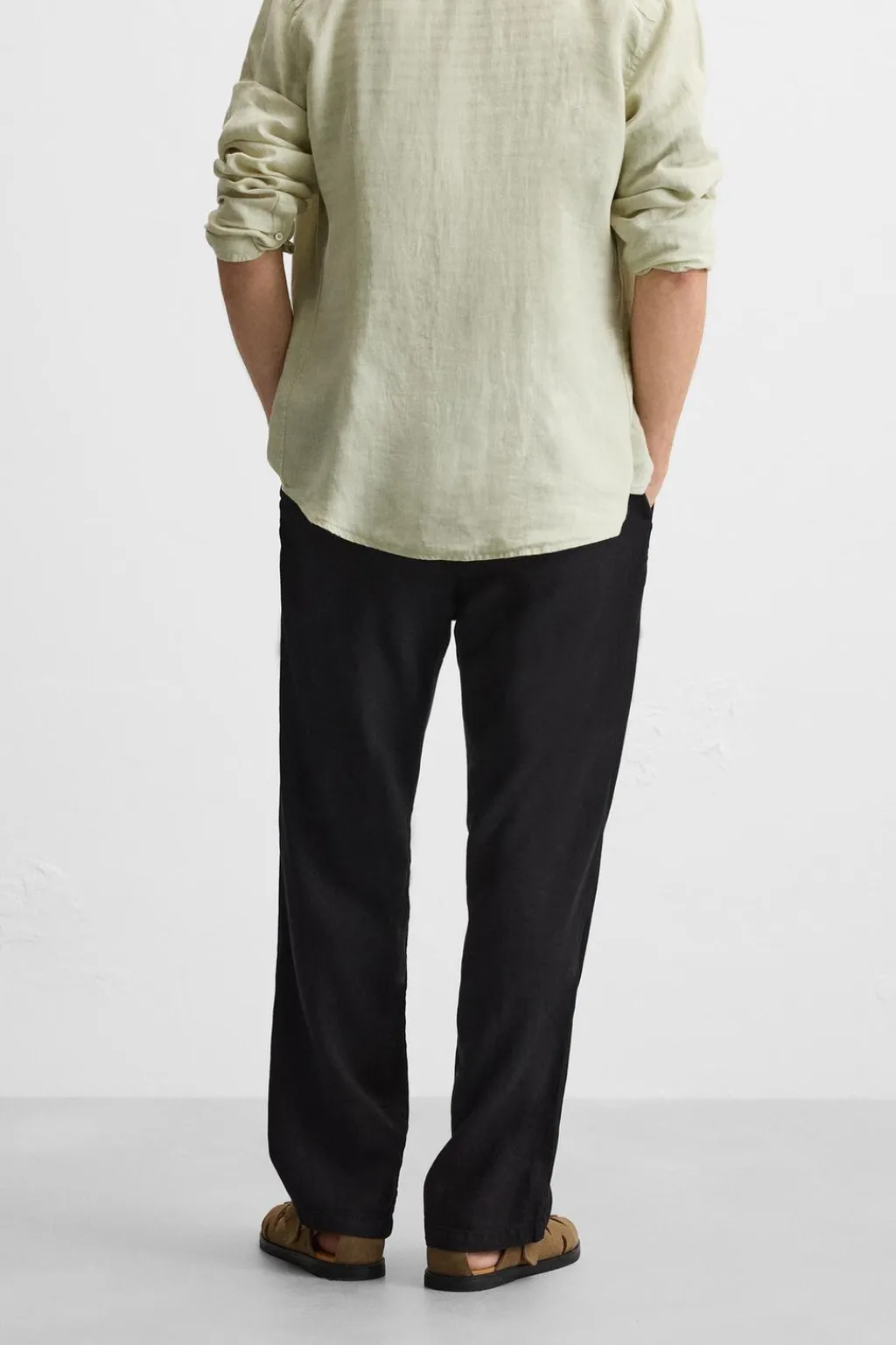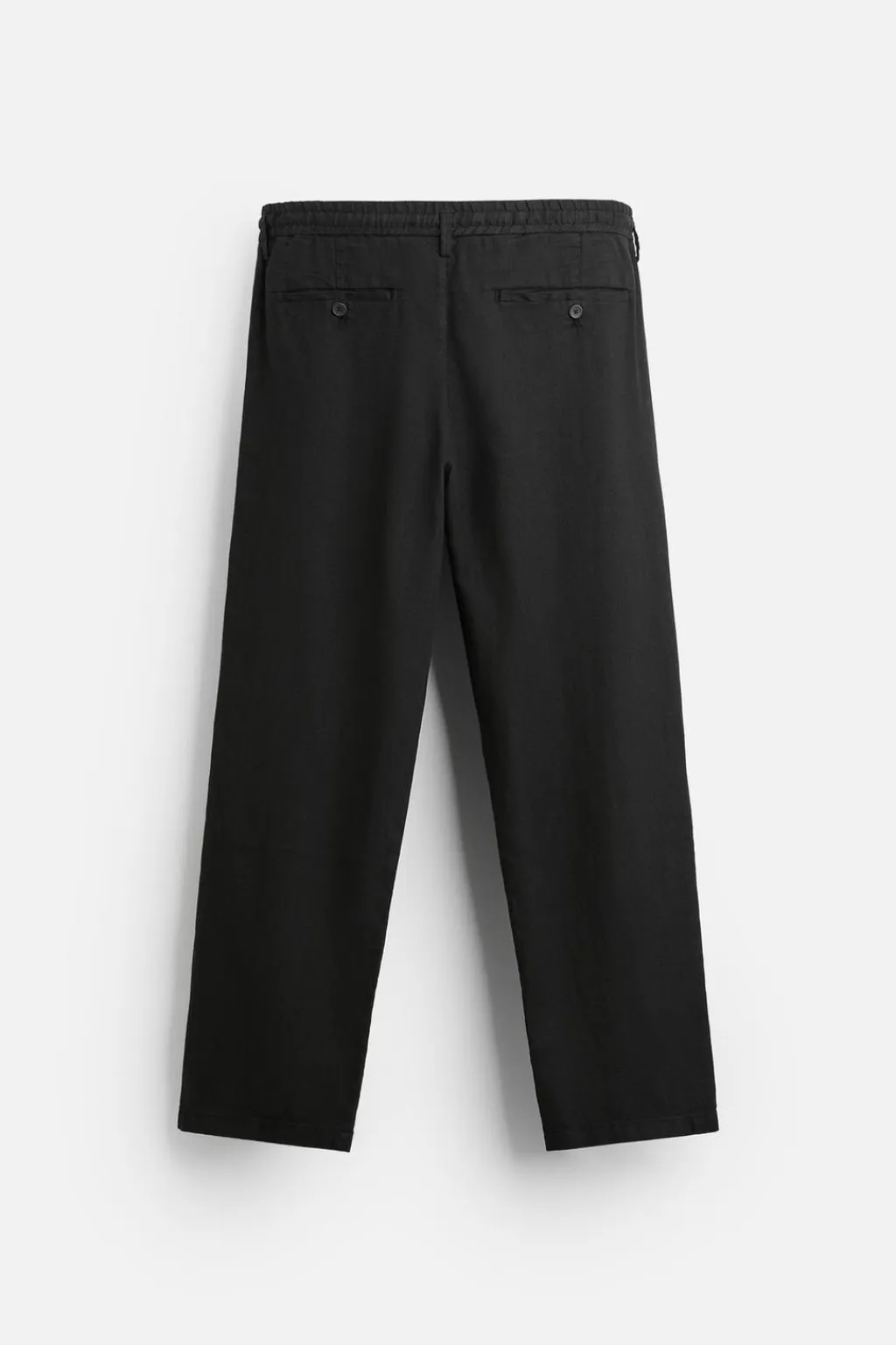 Pantalón straight fit confeccionado en tejido con mezcla de algodón y lino. Cintura elástica ajustable con cordón y detalle de pliegues frontales. Bolsillos en delantero y detalle de bolsillos de vivo con botón en espalda.