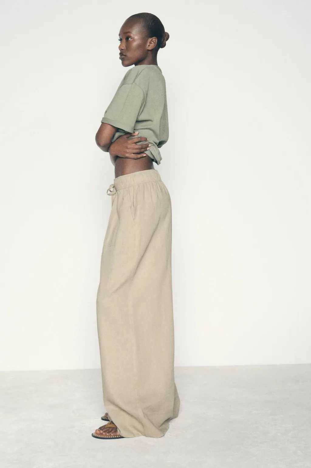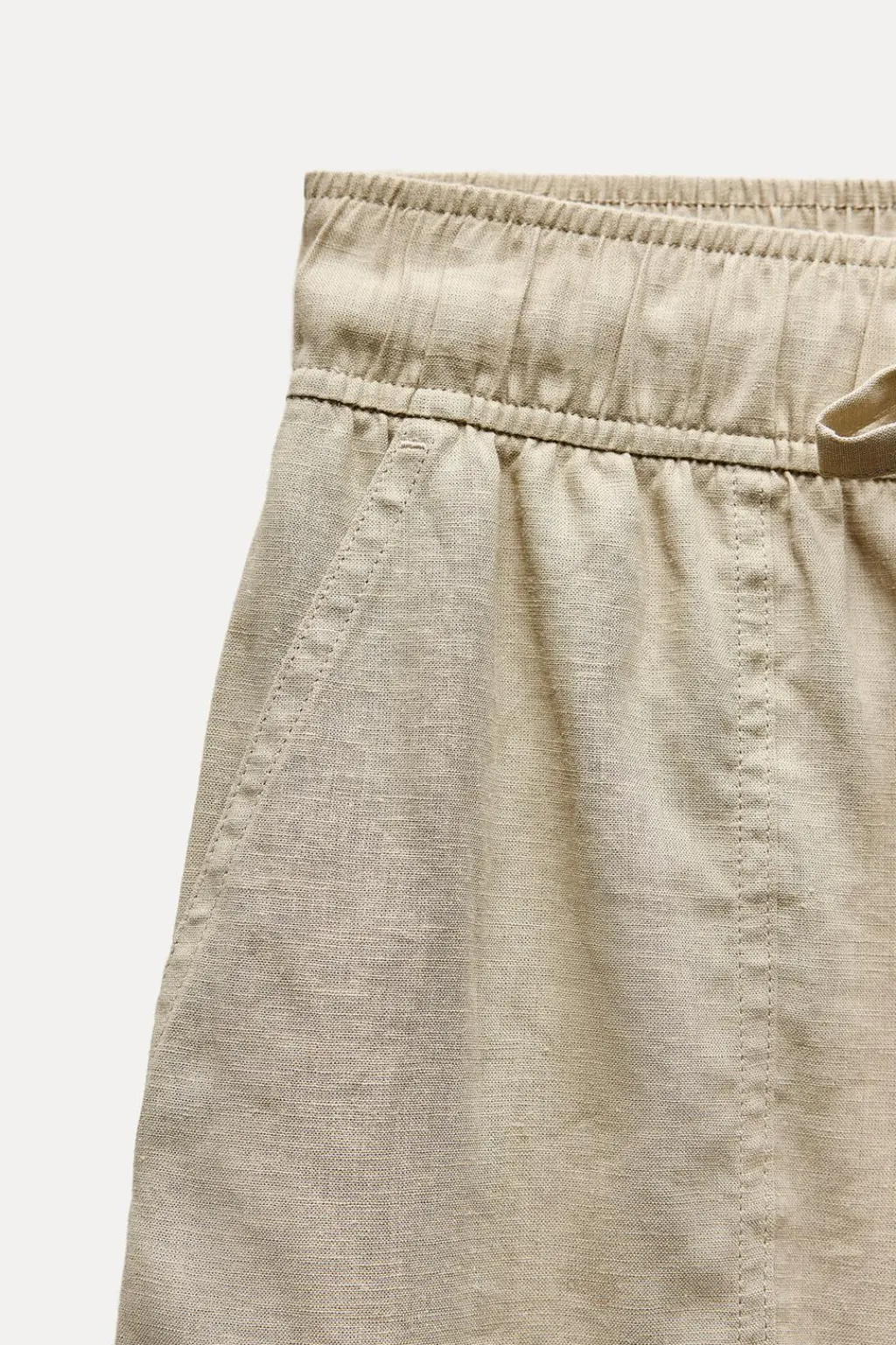 Pantalón confeccionado con lino. Tiro alto con cintura elástica ajustable con cordón. Bolsillos delanteros. Pernera muy ancha.