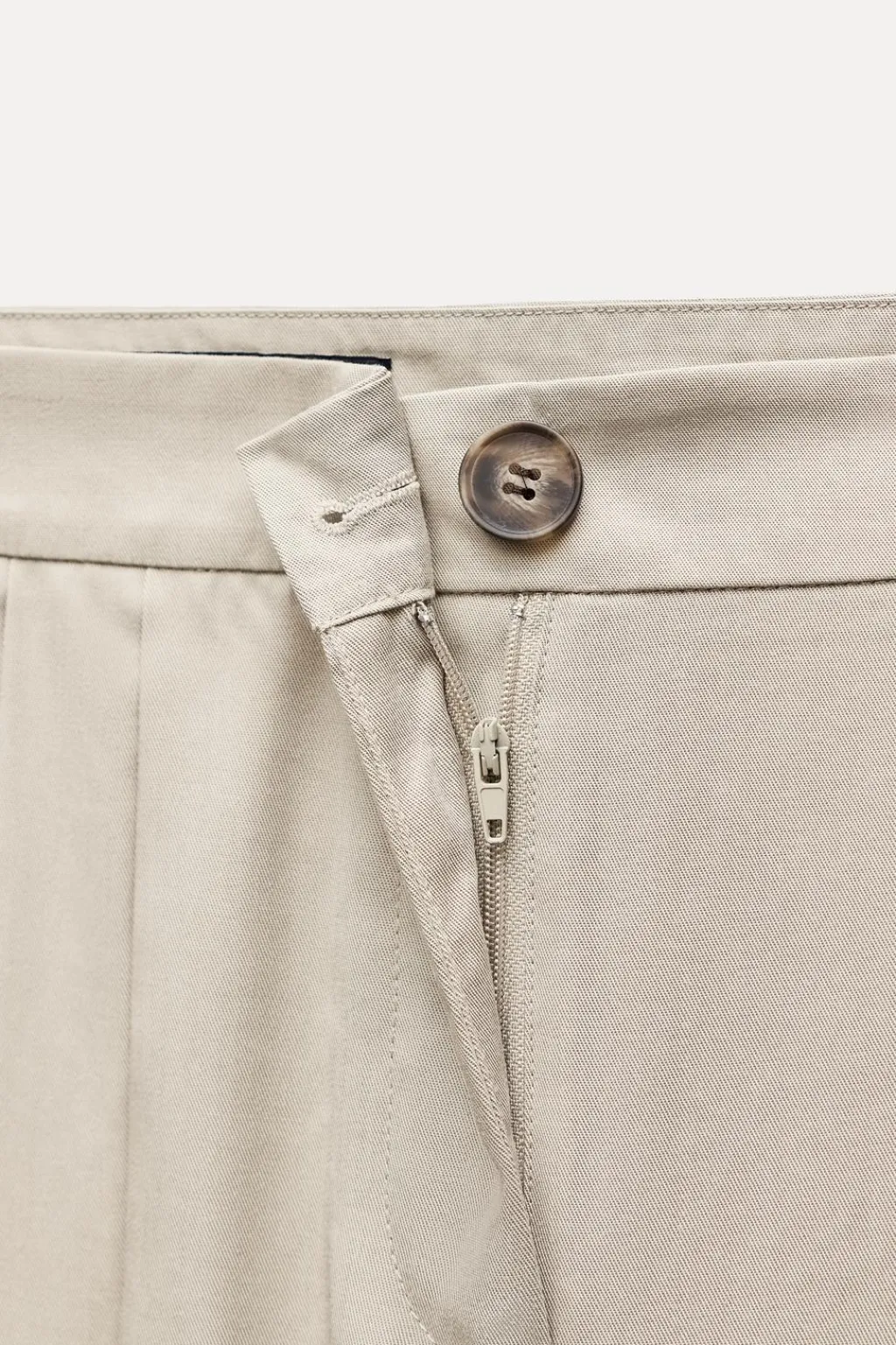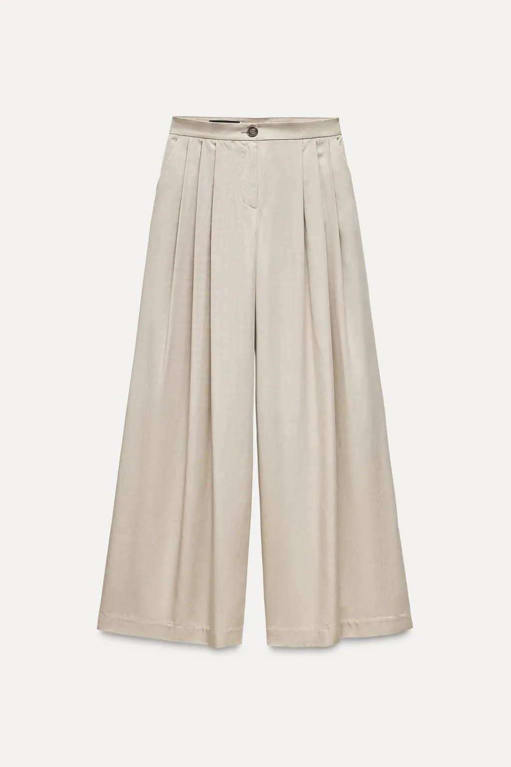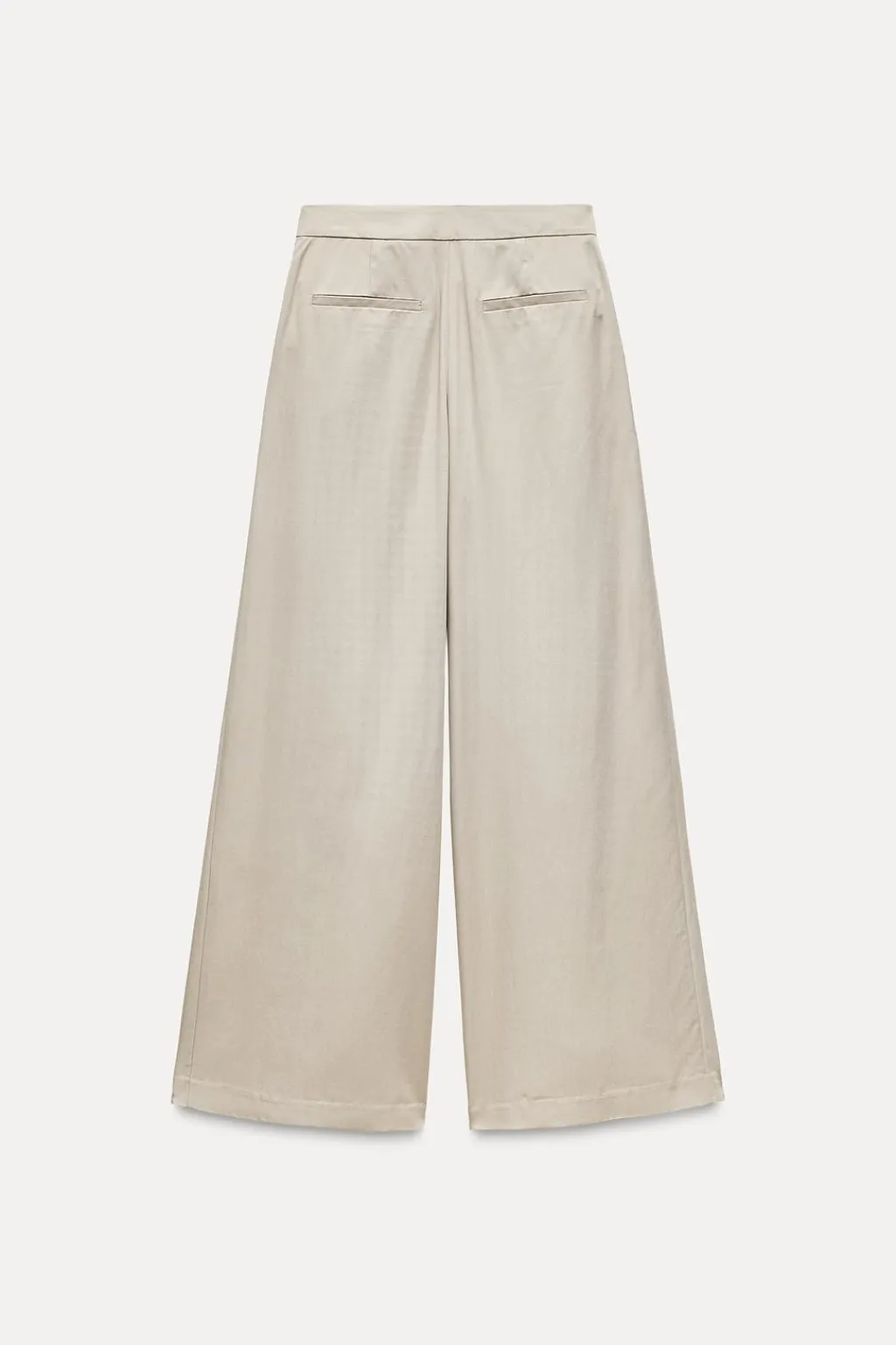 Pantalón de tiro alto con pliegues delanteros. Bolsillos frontales y falsos bolsillos de vivo en espada. Pernera ancha. Cierre frontal con cremallera y botón.