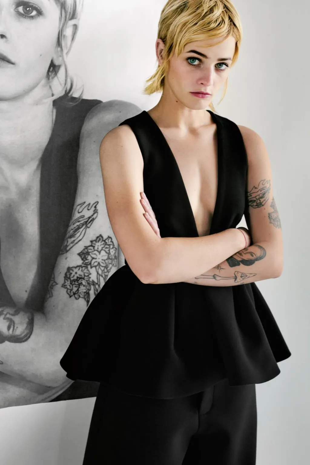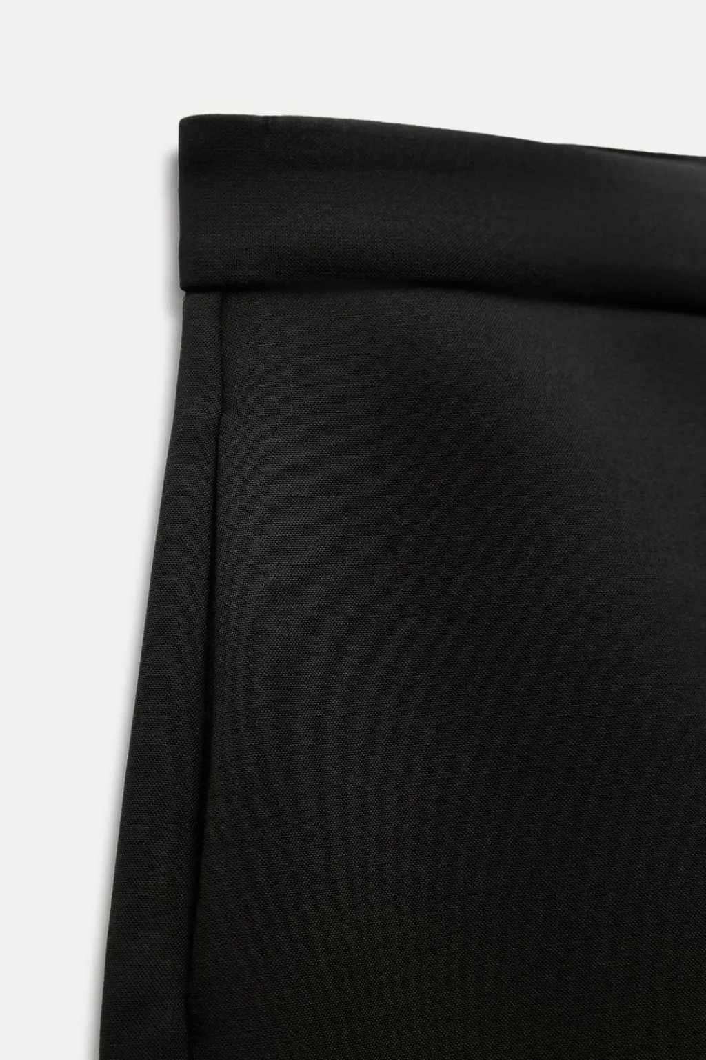 Pantalón de tiro alto. Bolsillos laterales ocultos en costura. Cierre frontal con cremallera, botón interior y ganchos metálicos.