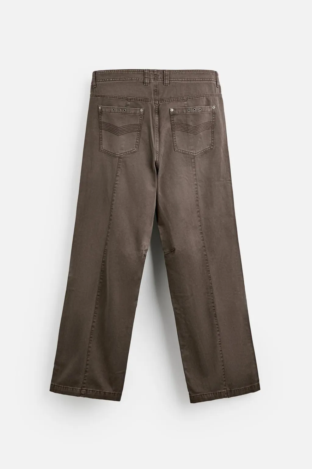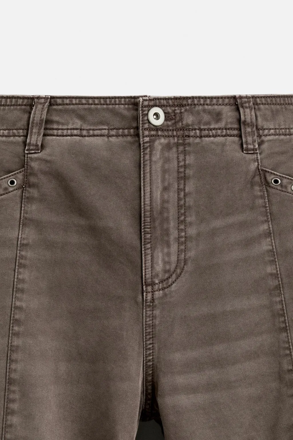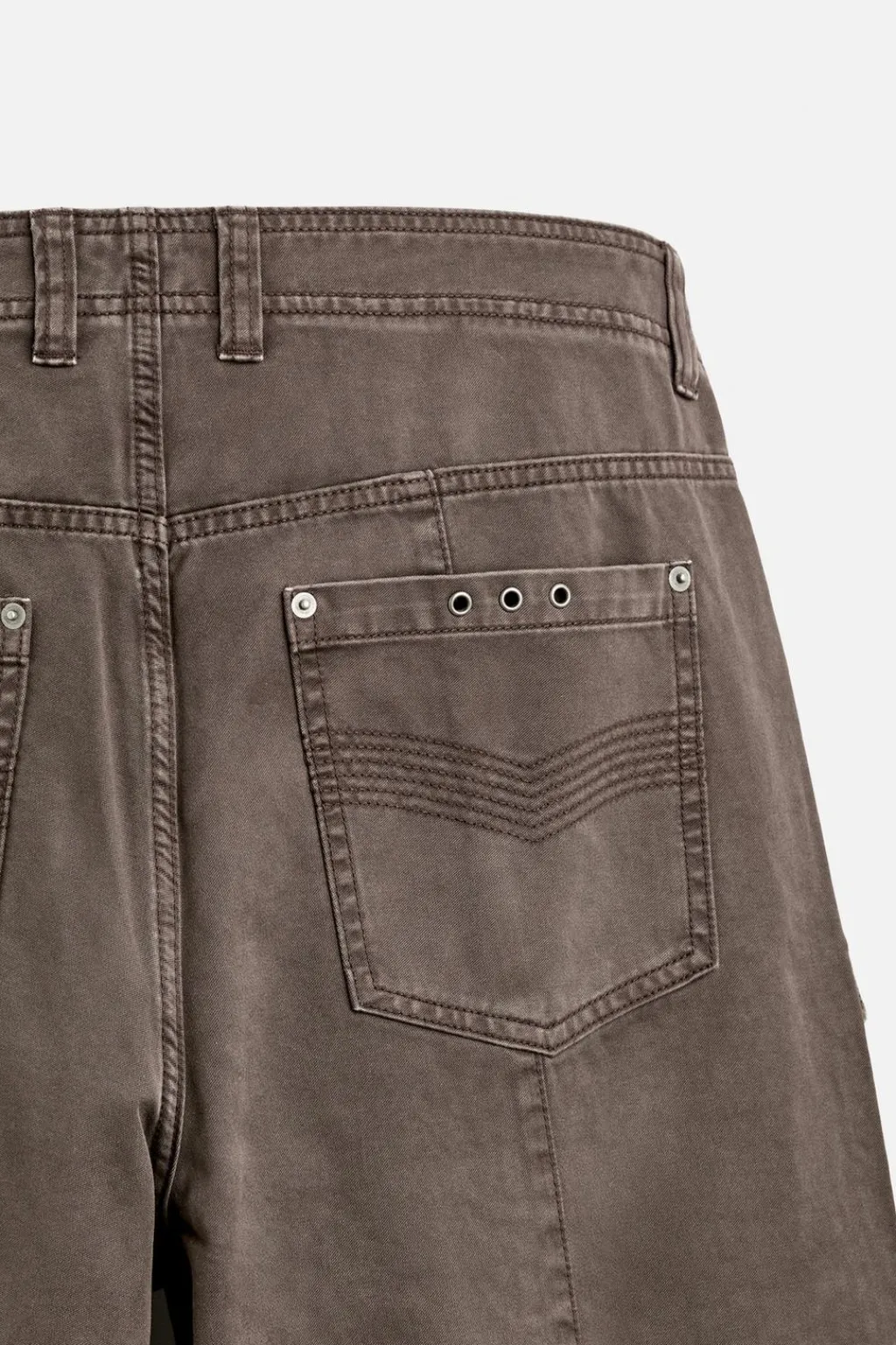 Pantalón wide fit confeccionado en tejido de algodón. Bolsillo en delantero y detalle de bolsillos plastrón en espalda acabados con detalle de ojales metálicos. Aplicación de bolsillo plastrón con solapa en pernera. Detalle de costuras en perneras. Efecto lavado. Cierre frontal con cremallera y botón.