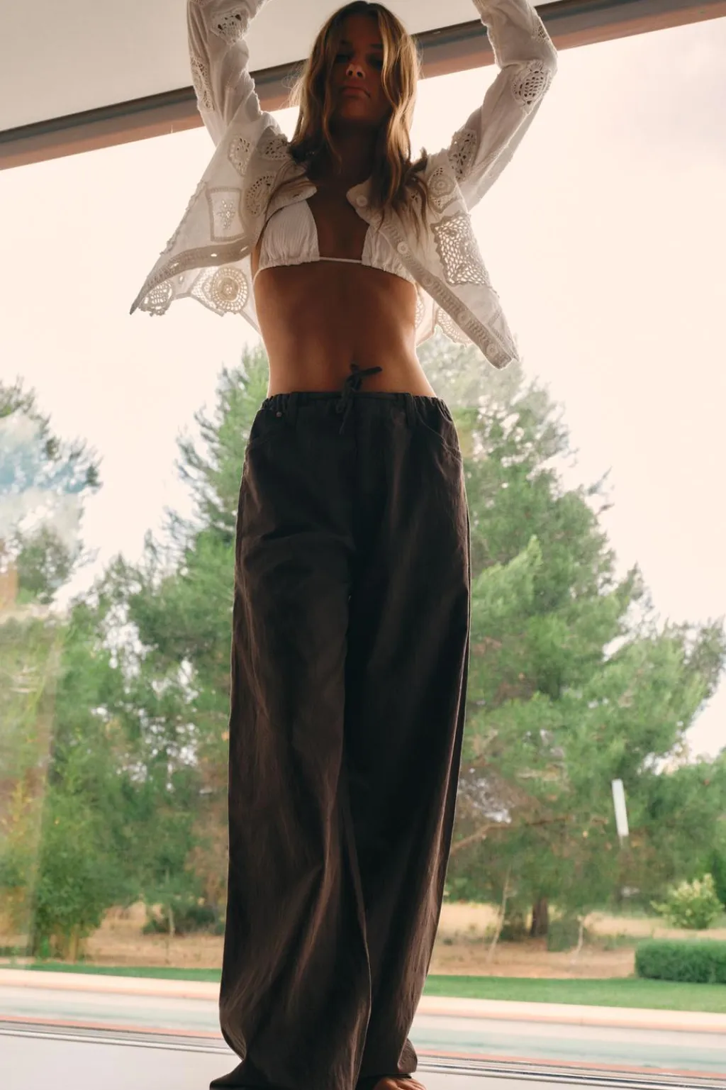 Pantalón de tiro medio con trabillas. Cintura elástica ajustable con cordón en mismo tejido. Bolsillos en delantero y de plastrón en espalda. Cierre frontal con cremallera y gancho metálico.