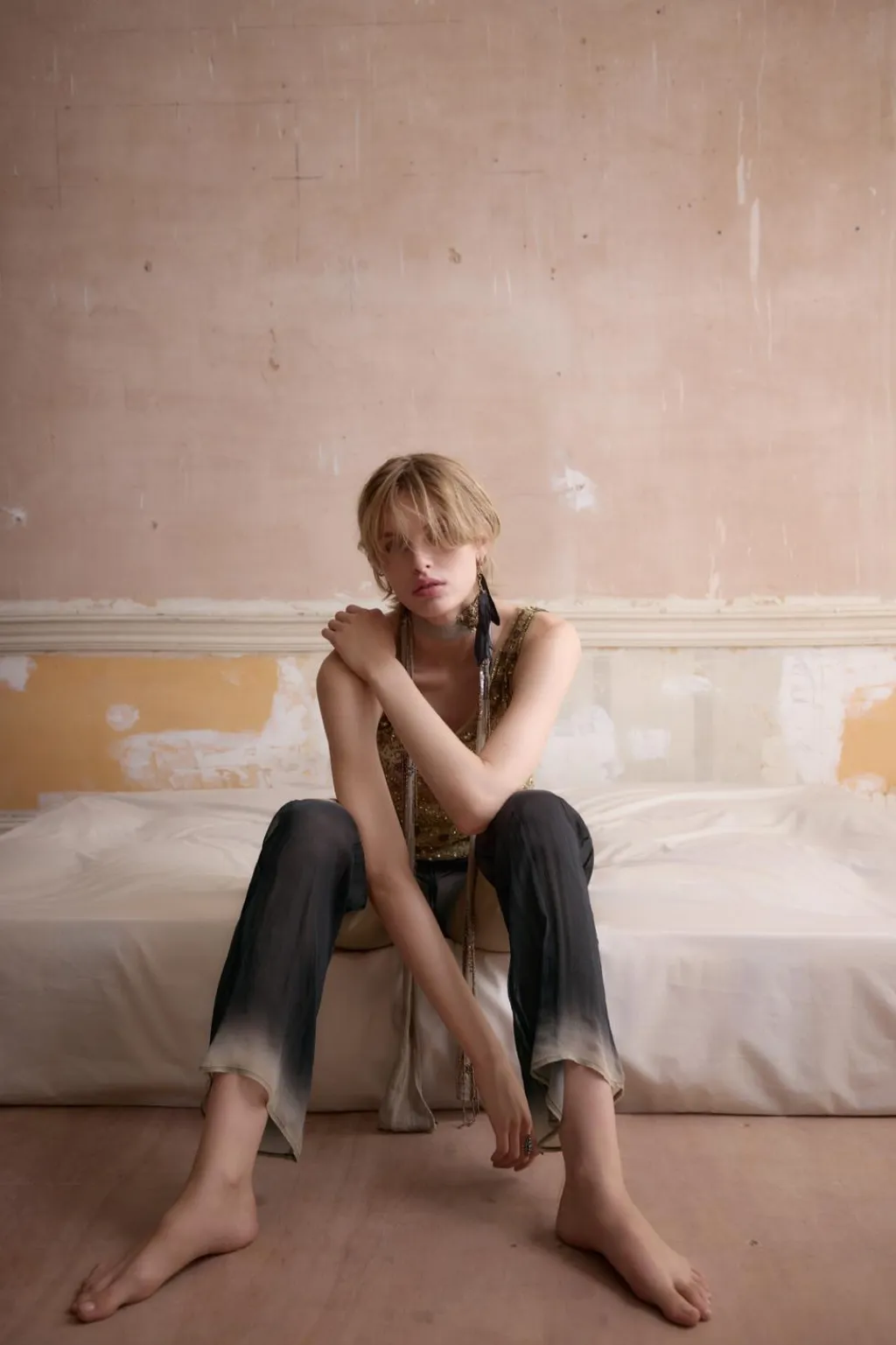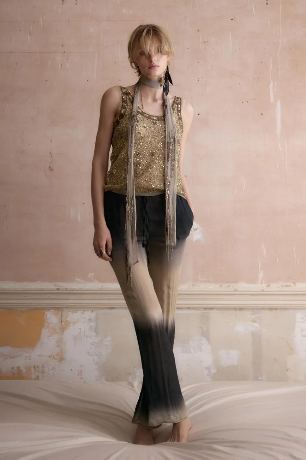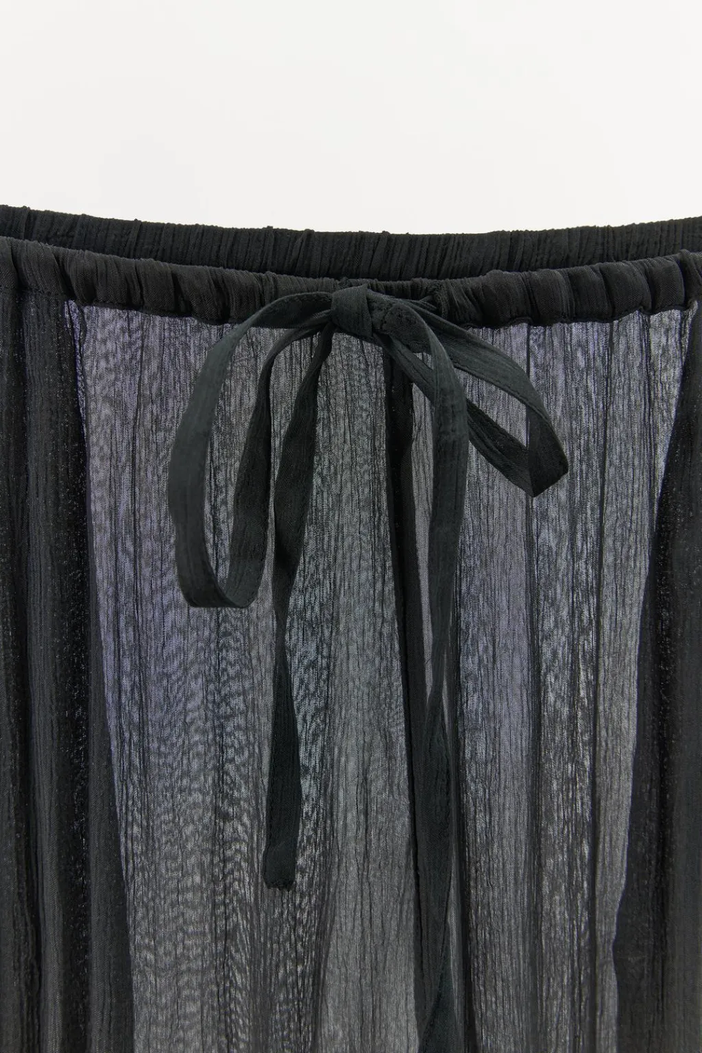 Pantalón fluído semitransparente confeccionado en hilatura de viscosa 100%. Tiro medio y cintura elástica ajustable con lazada. Bolsillos laterales ocultos en costura. Pierna ancha.