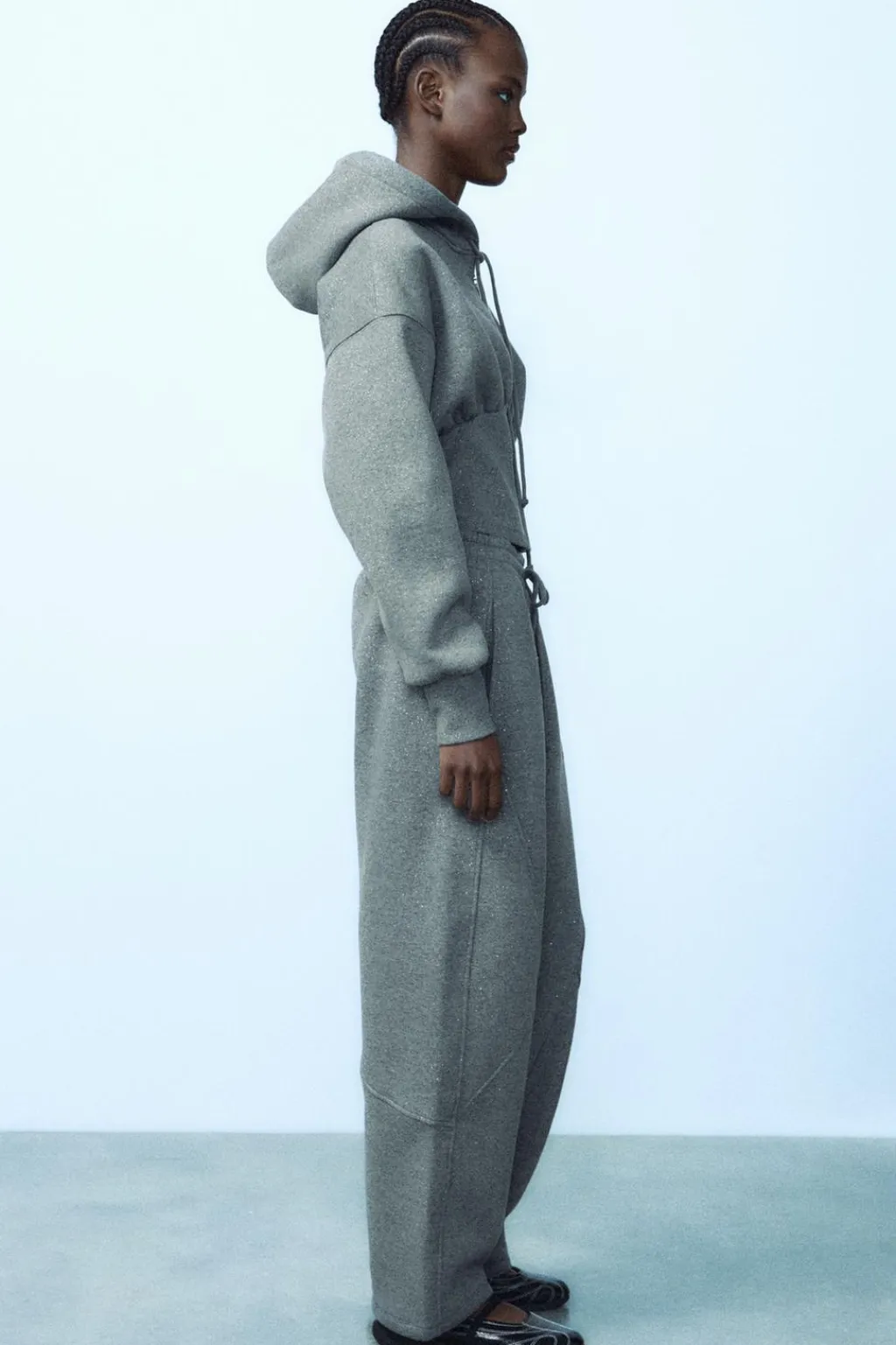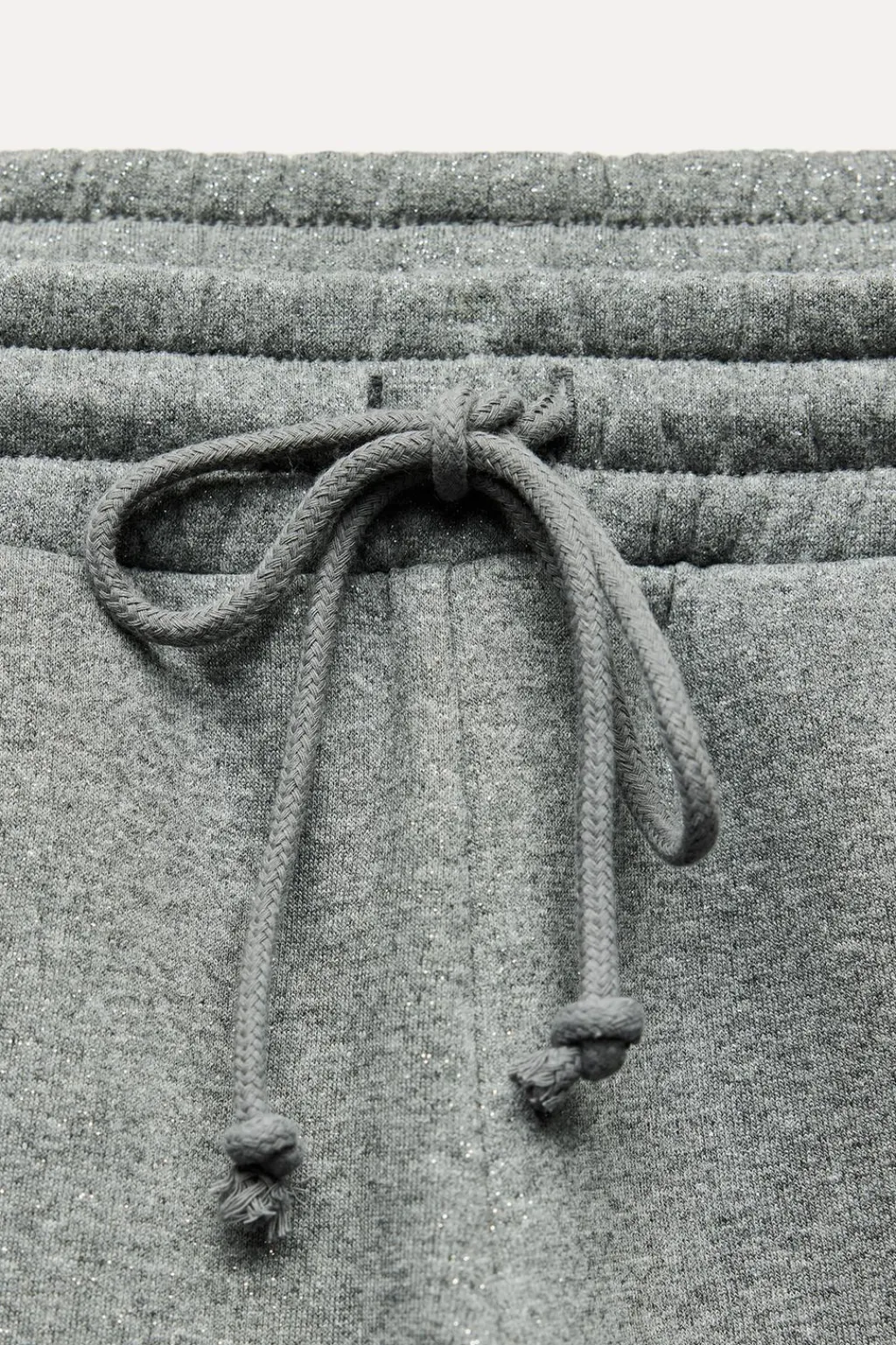Pantalón de tiro alto con cintura elástica ajustable con cordones. Bolsillos laterales. Detalle de texto en relieve y glitter.
