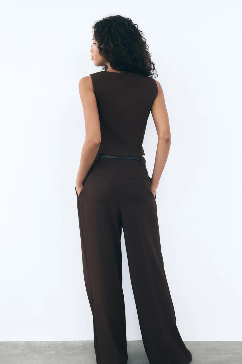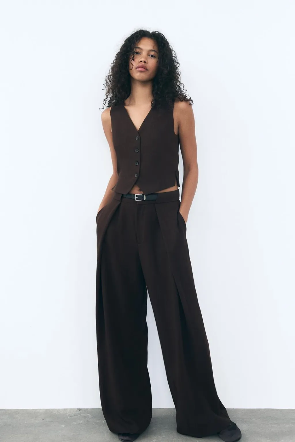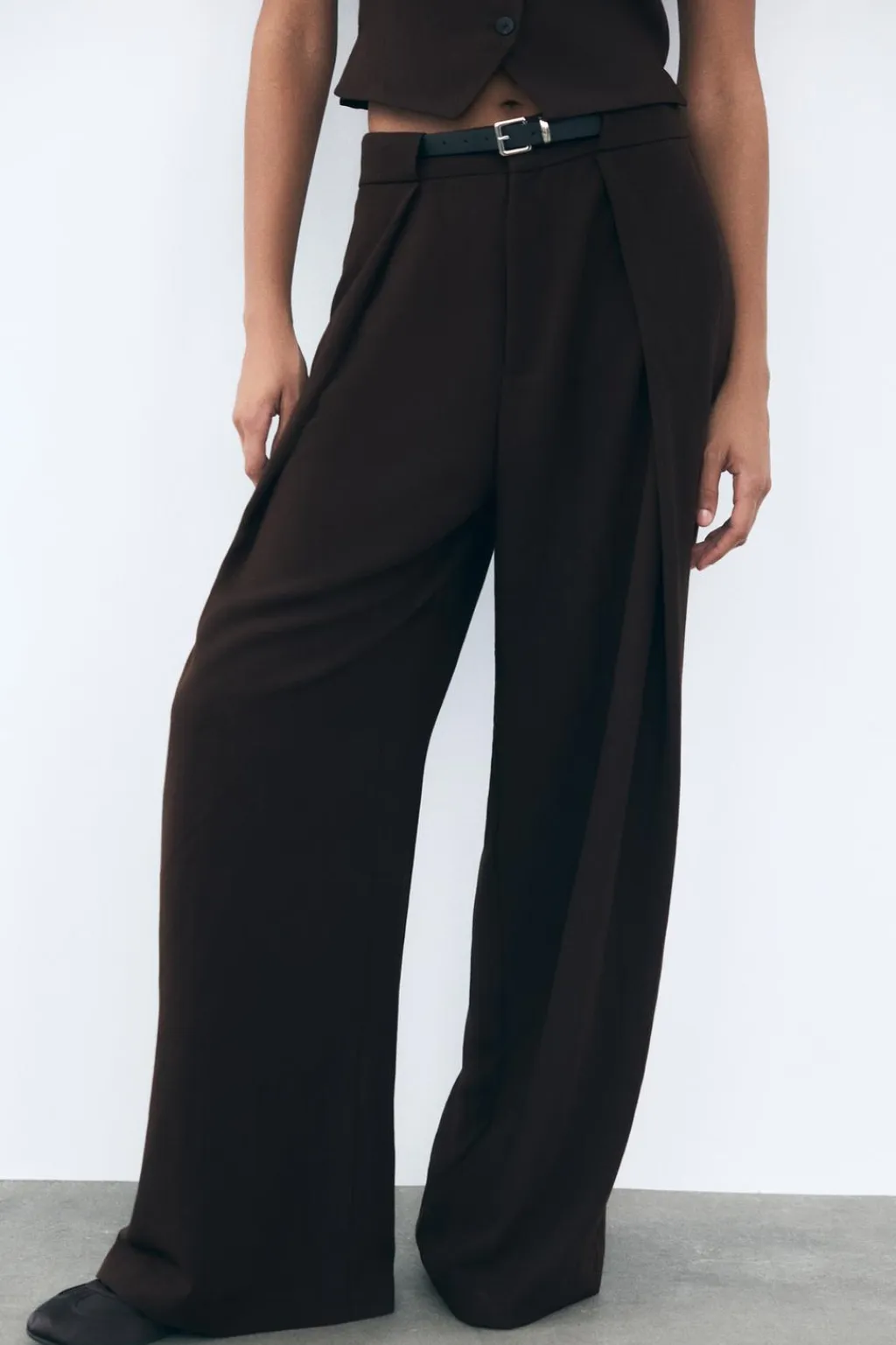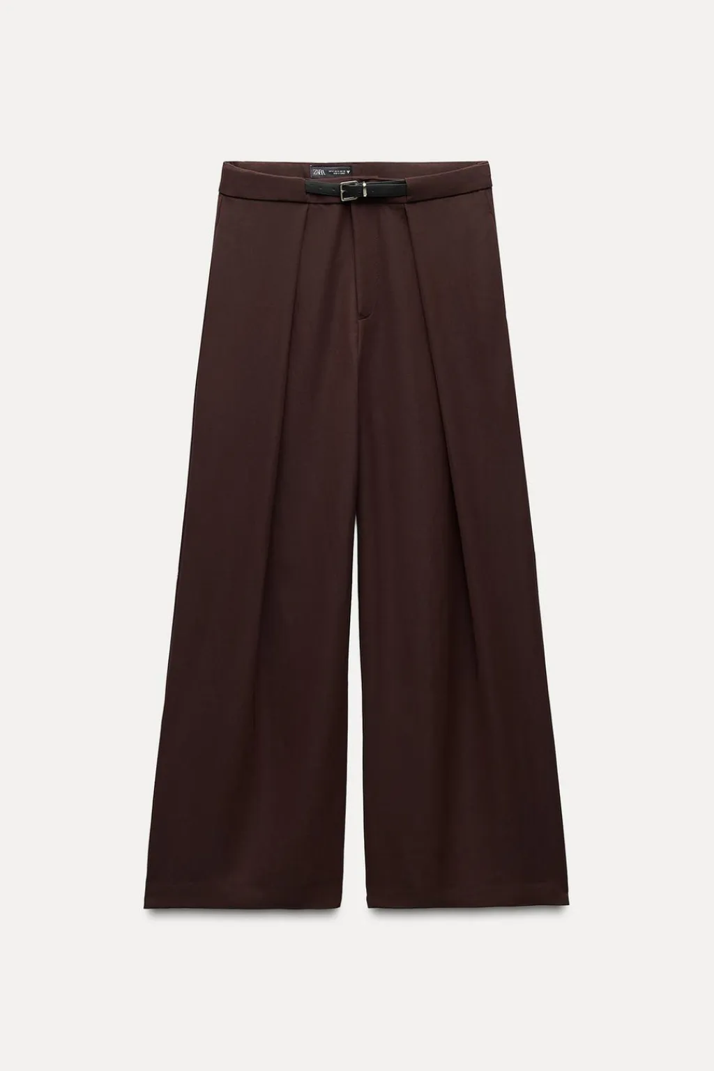 Pantalón de tiro alto con bolsillos laterales ocultos en costura y falsos bolsillos de vivo en espalda. Detalle de pliegues en delantero y cinturón combinado a contraste con hebilla metálica. Pierna ancha. Cierre frontal con cremallera y gancho metálico.