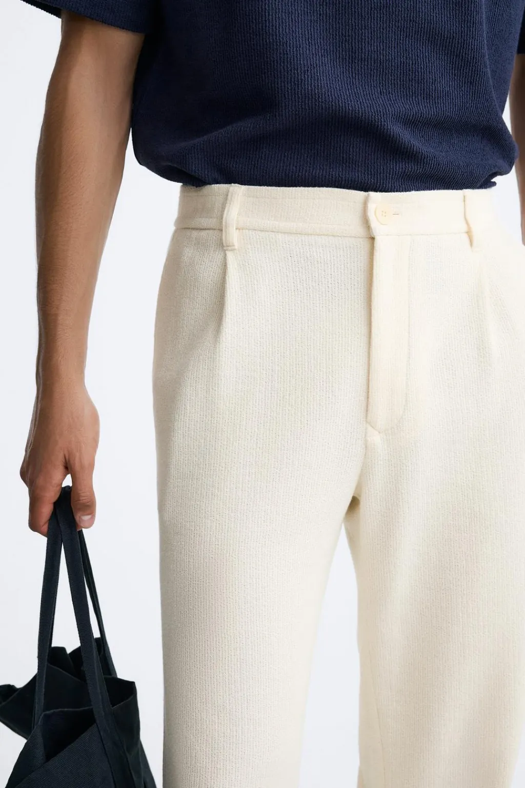 Pantalón slim fit confeccionado en tejido con mezcla de algodón. Cintura elástica con detalle de pliegues en delantero. Bolsillos frontales y detalle de bolsillos traseros de vivo. Bajo acabado con vuelta. Cierre frontal con cremallera y botón.