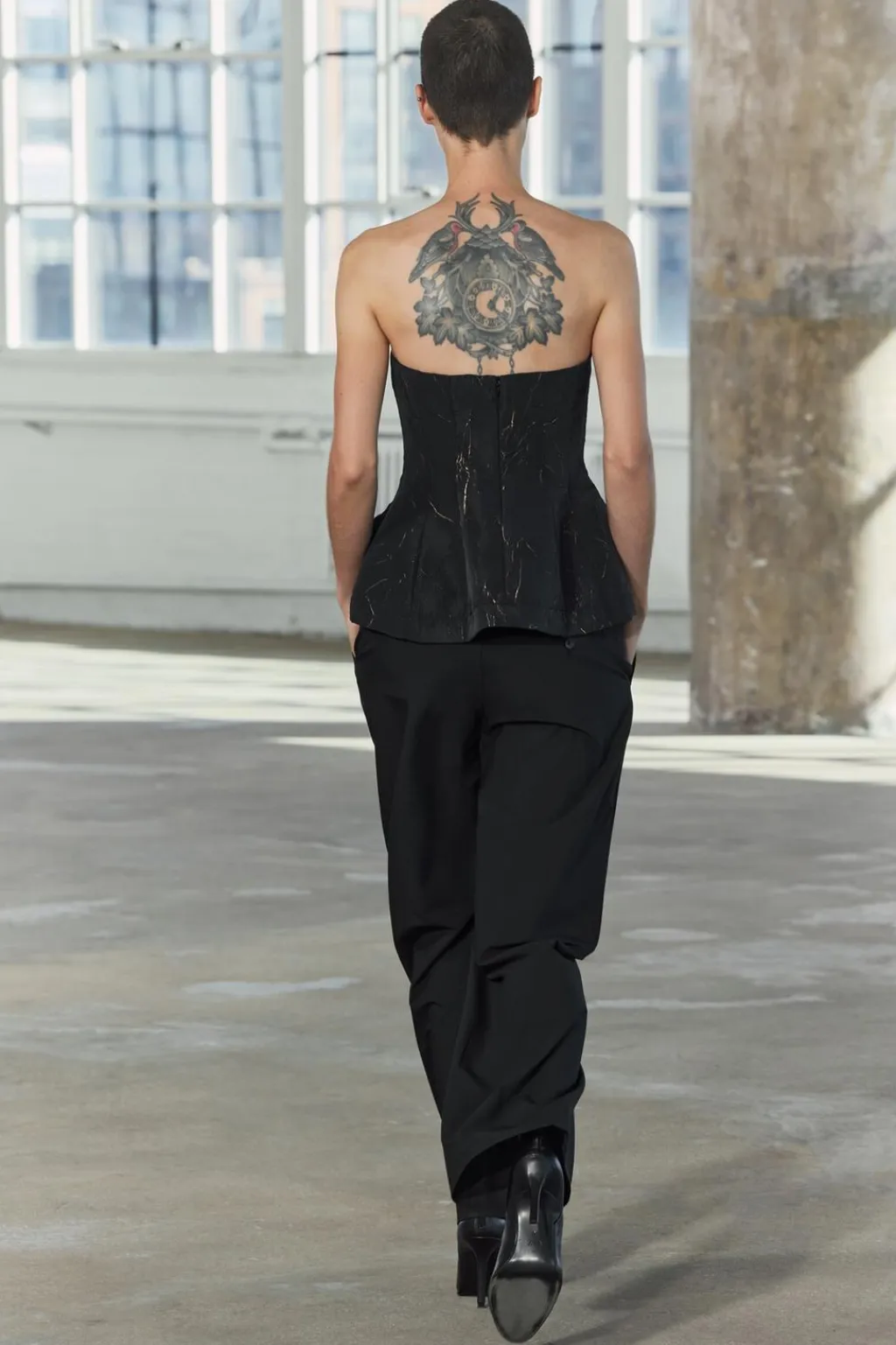 Pantalón de tiro medio y cintura con trabillas. Bolsillos delantero. Pierna recta. Cierre frontal con cremallera, botón y ganchos metálicos.