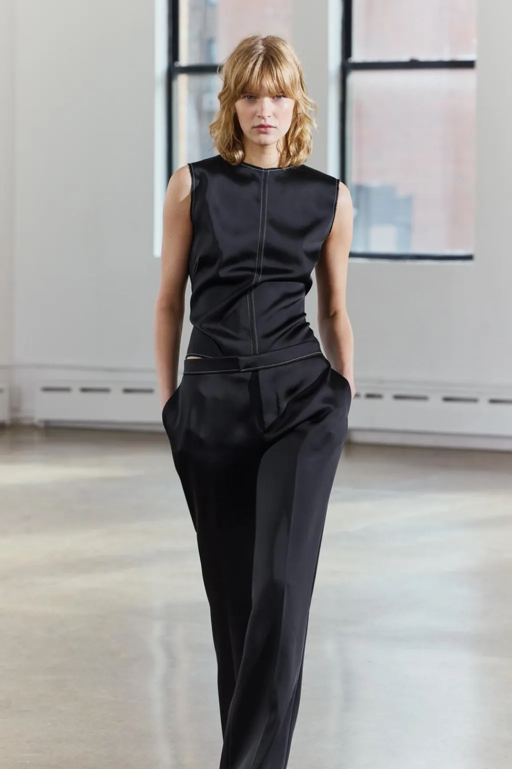 Pantalón de tiro medio confeccionado en satén pesado. Detalle de raya planchada en delantero y pespuntes a contraste. Cierre frontal con cremallera, botón y gancho metálico.