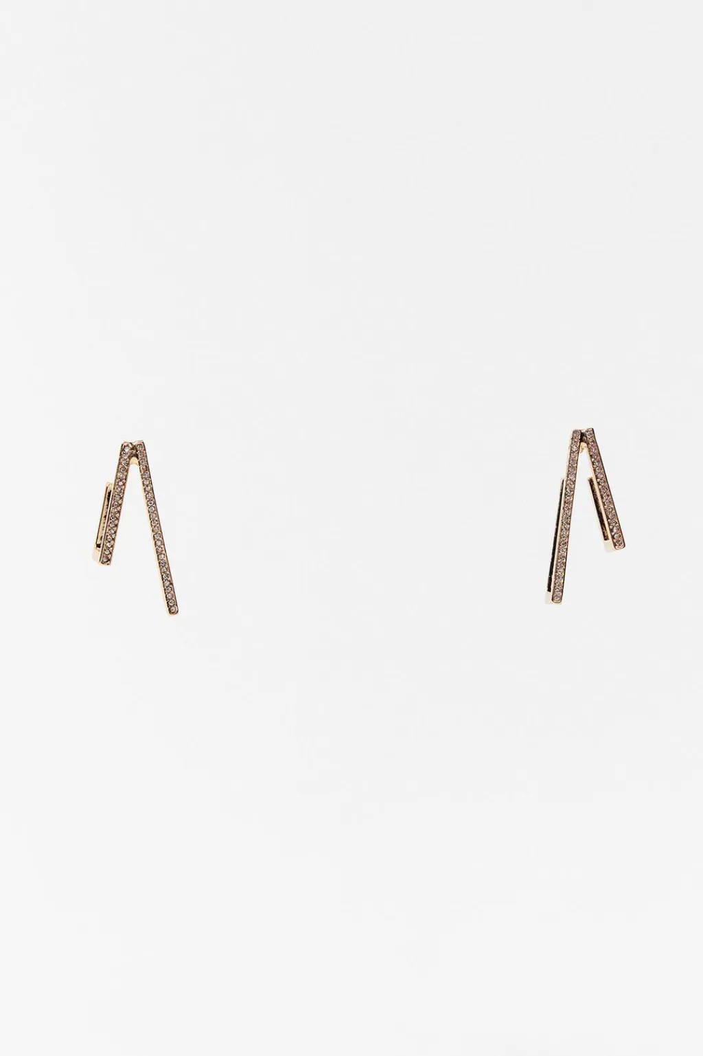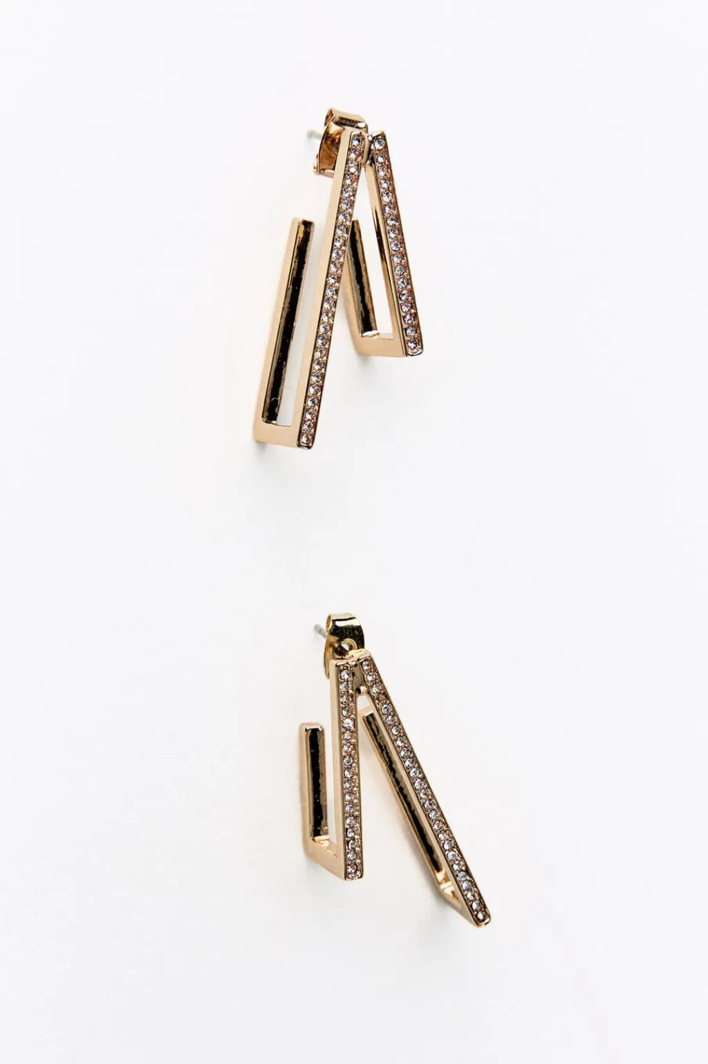 Pendientes metálicos en forma de rectángulo abierto doble en diferente tamaño. Detalle aplicación de brillos combinados a contraste. Cierre con tuerca.