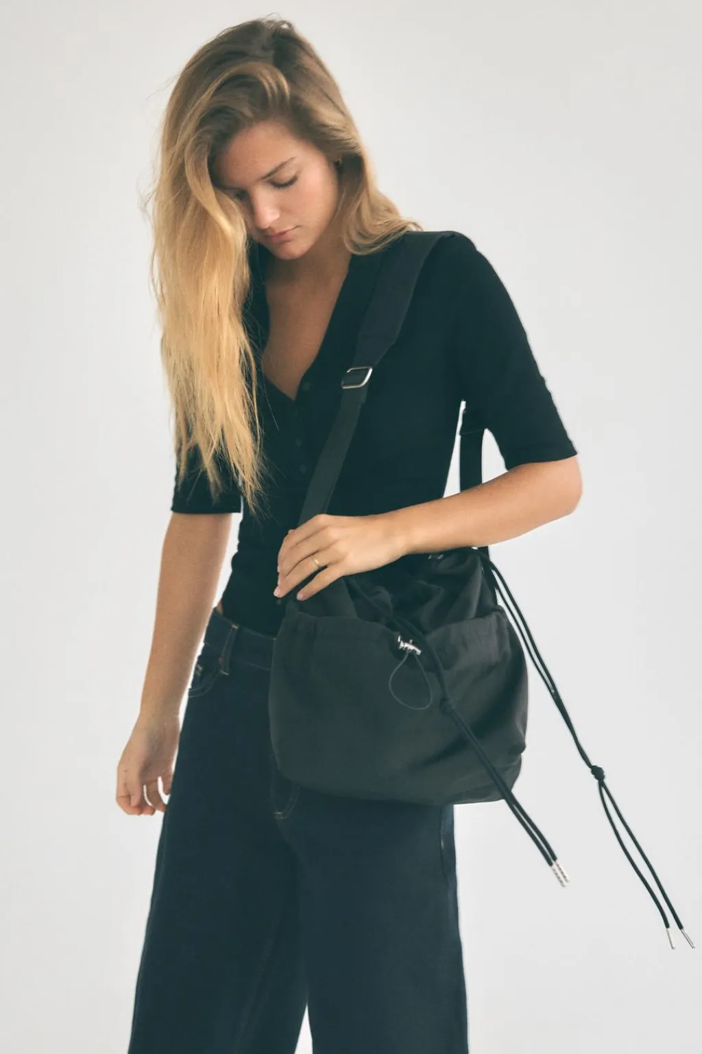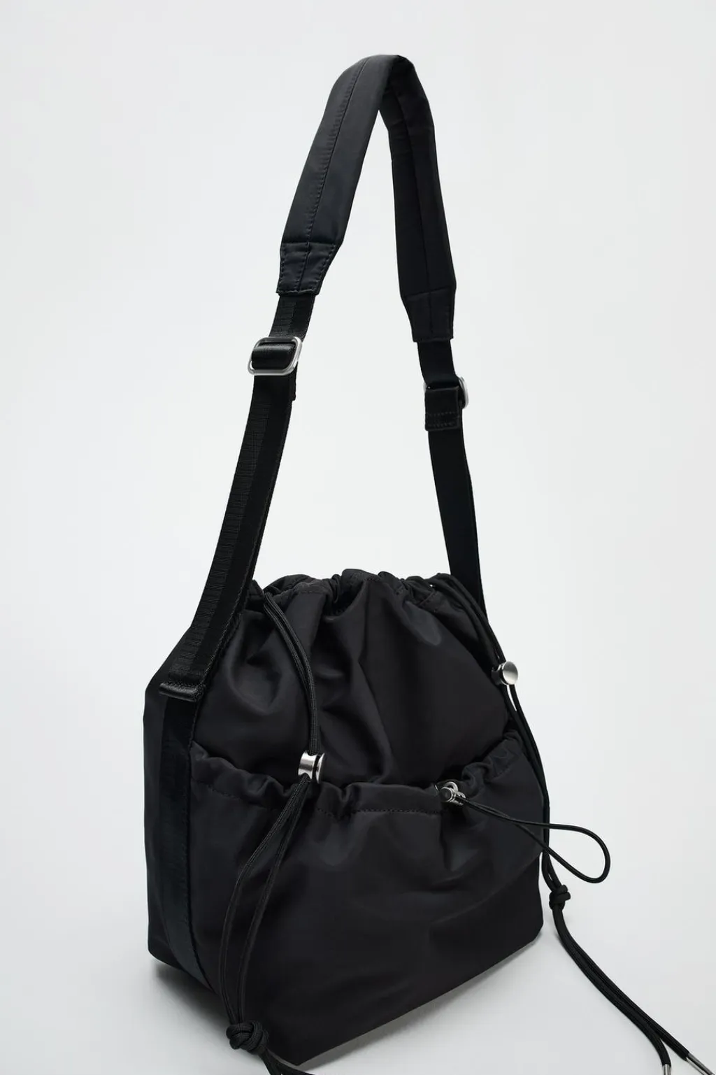Bolso tipo saca en nylon. Asa de hombro. Cierre mediante fruncido.