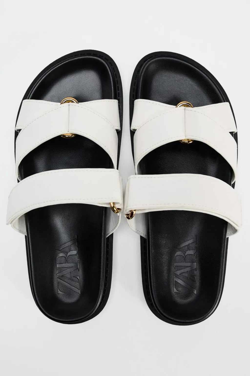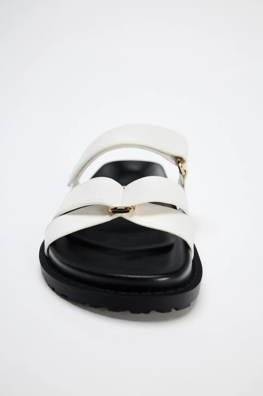 Zapato tipo sandalia plana. Multi tiras en la parte delantera. Detalle metálico en las tiras. Acabado en punta redonda.