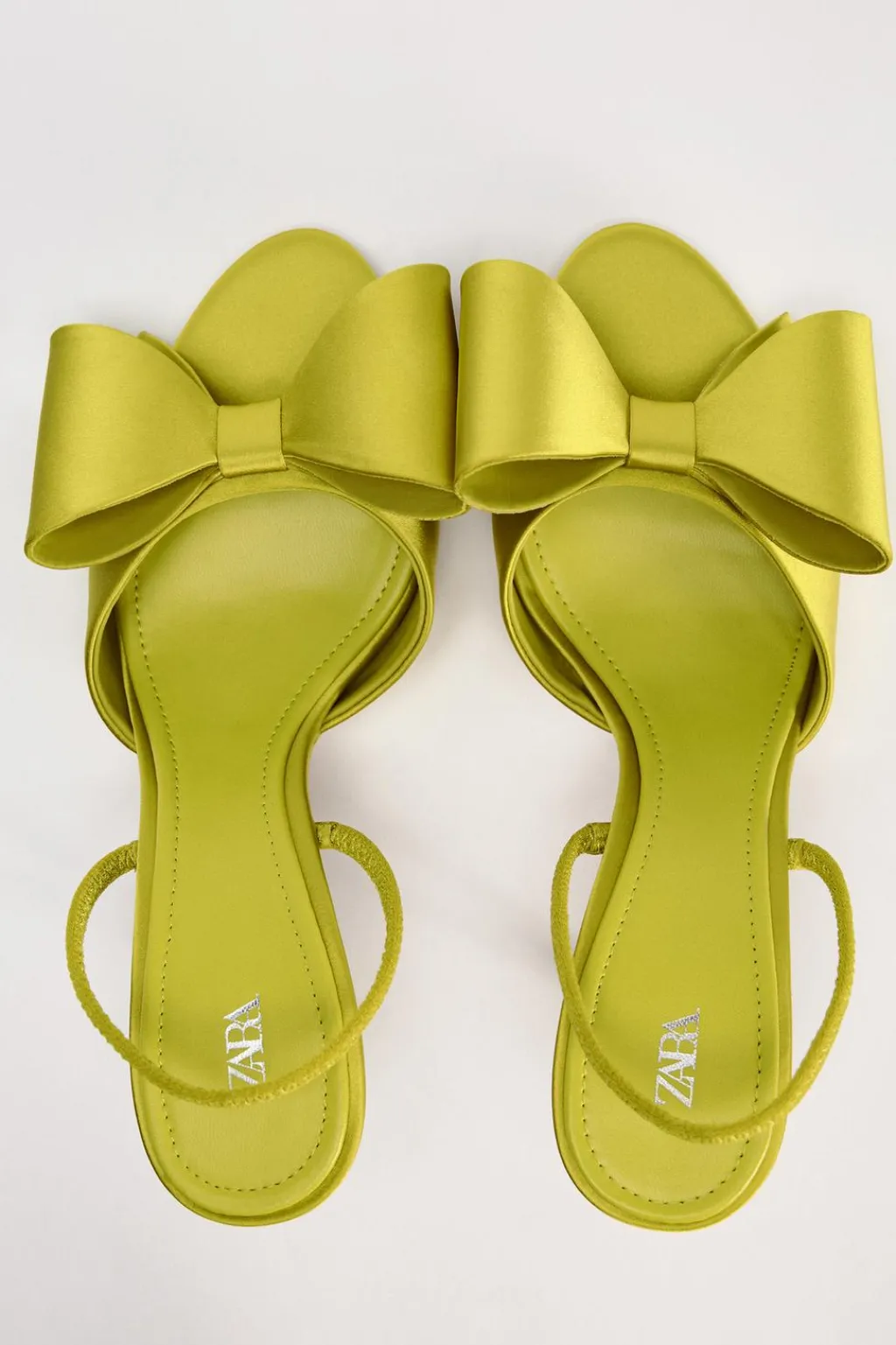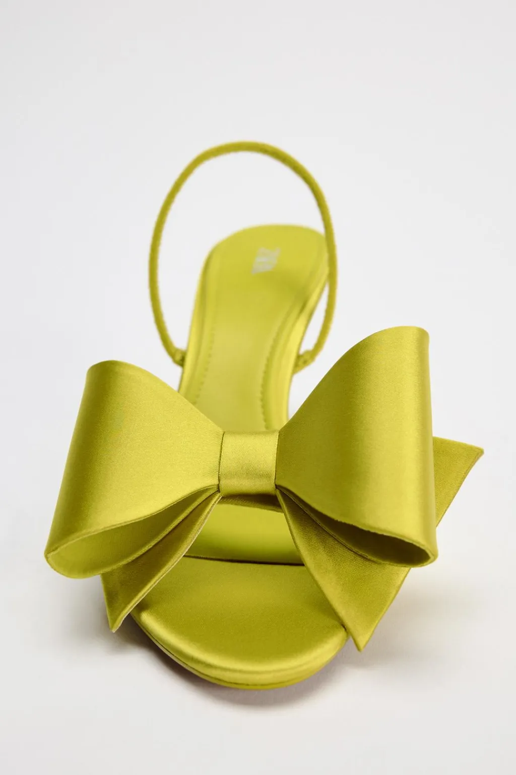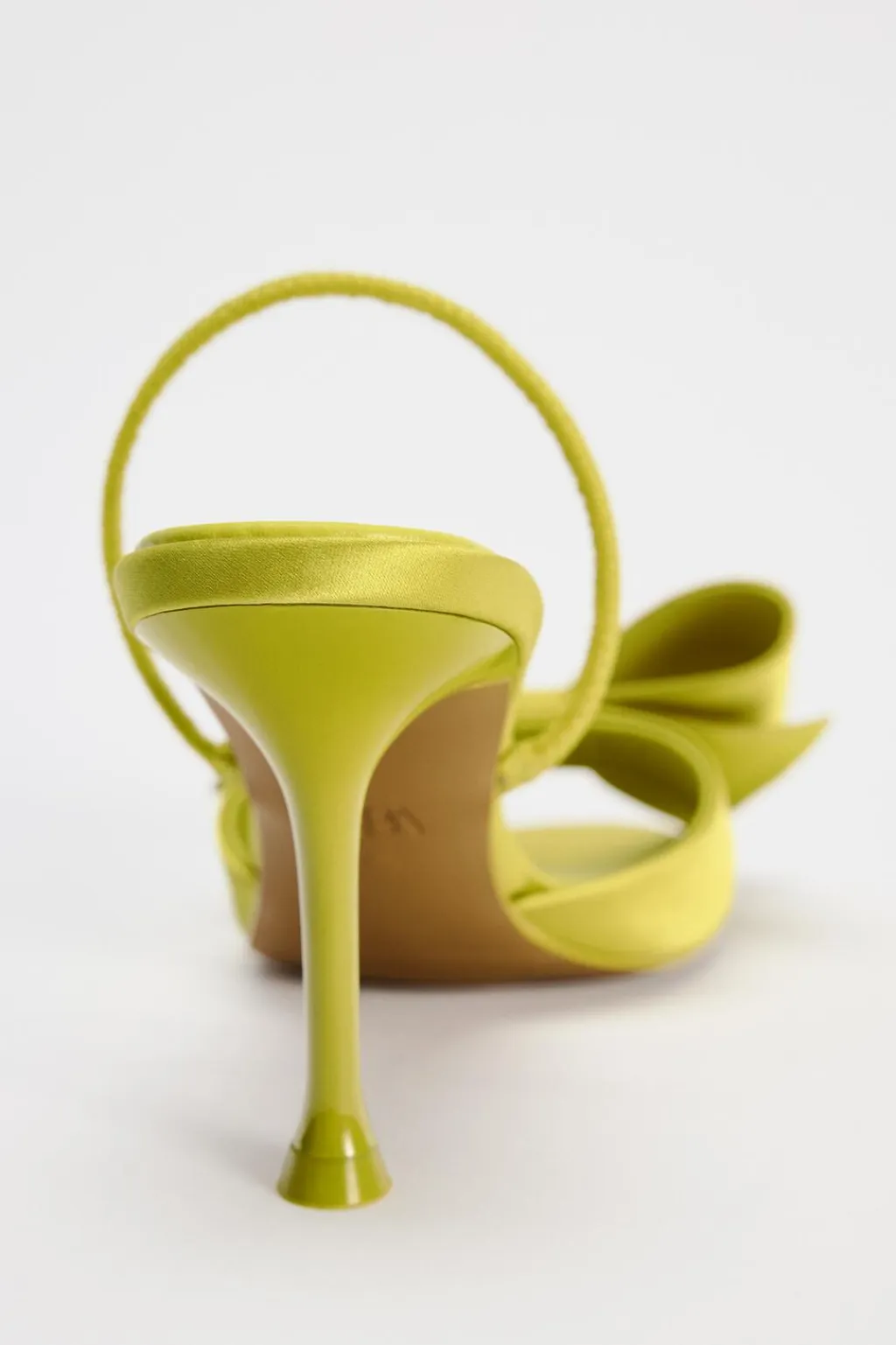 Zapato tipo sandalia de tacón alto y fino con efecto satinado. Detalle de lazo en la parte delantera. Tira trasera con pieza elástica.