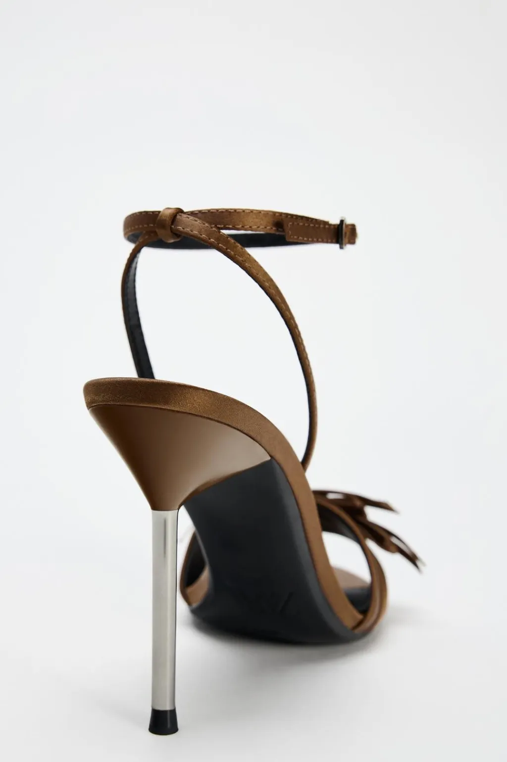 Zapato tipo sandalia de tacón metalizado. Detalle de tiras con lazos. Cierre mediante hebilla en la pulsera del tobillo.