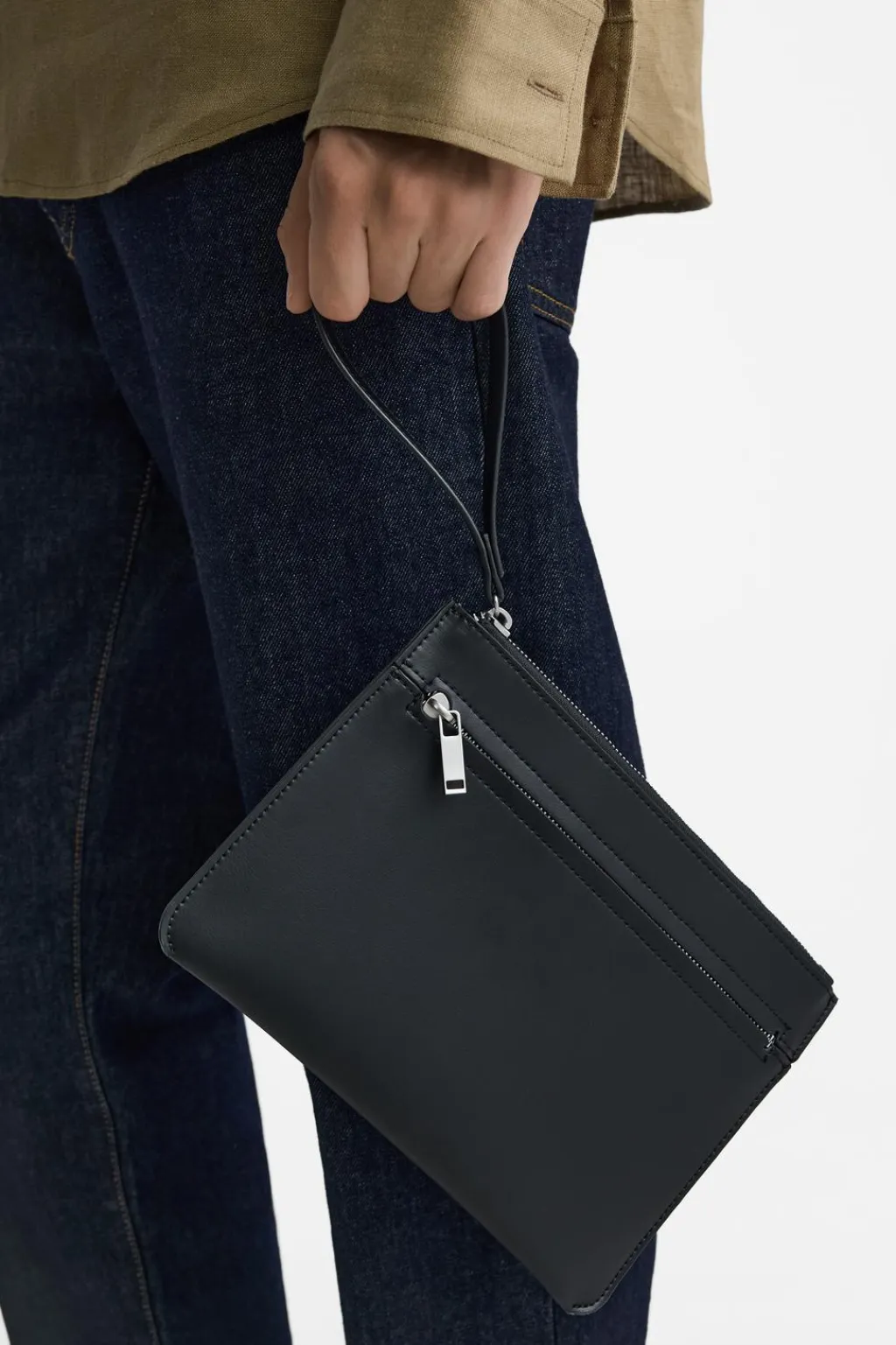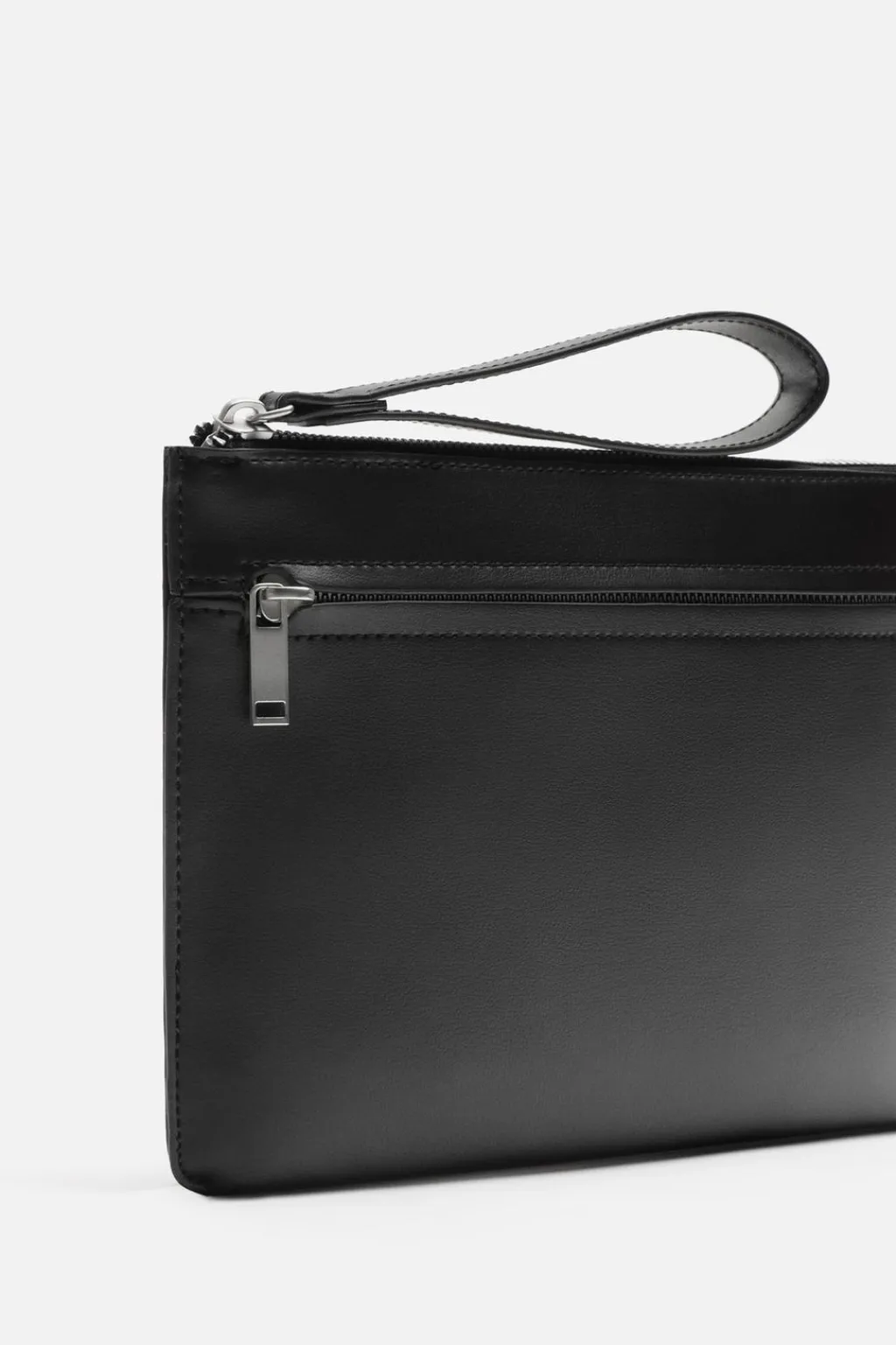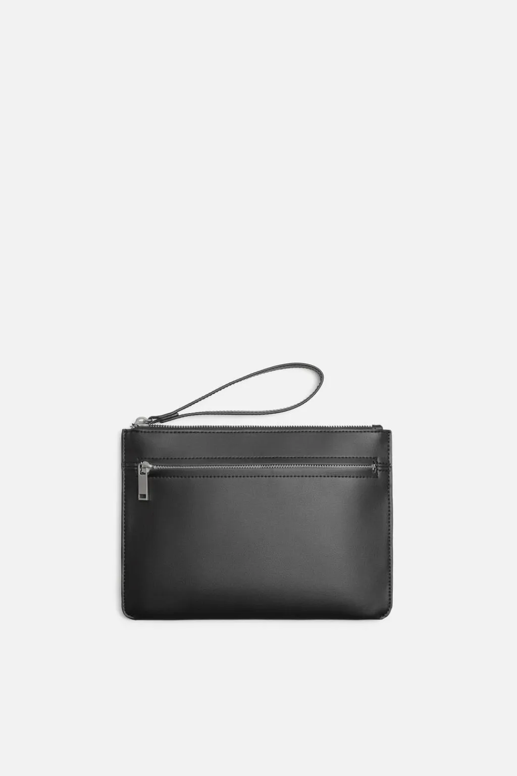 Sobre liso. Compartimento principal con cierre mediante cremallera. En su interior cuenta con un bolsillo plano. En la parte frontal cuenta con un bolsillo con cierre mediante cremallera. Dispone de un asa de mano.