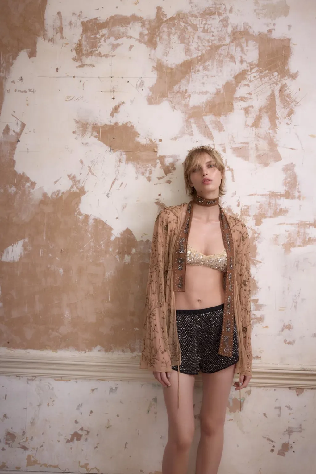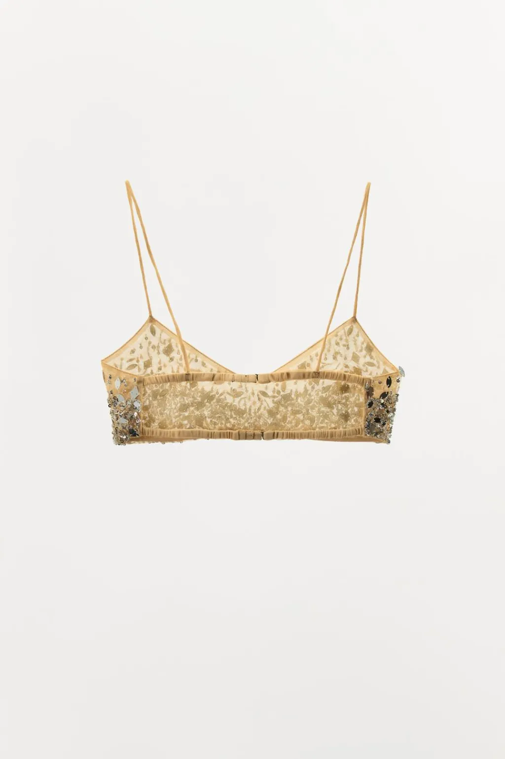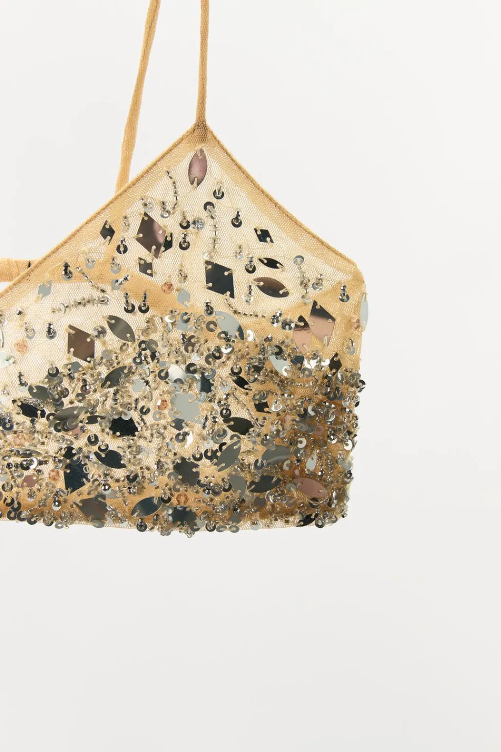 Top de escote pico y tirantes finos. Detalle aplicación de abalorios y lentejuelas combinados a contraste. Cierre en espalda con gancho metálico.