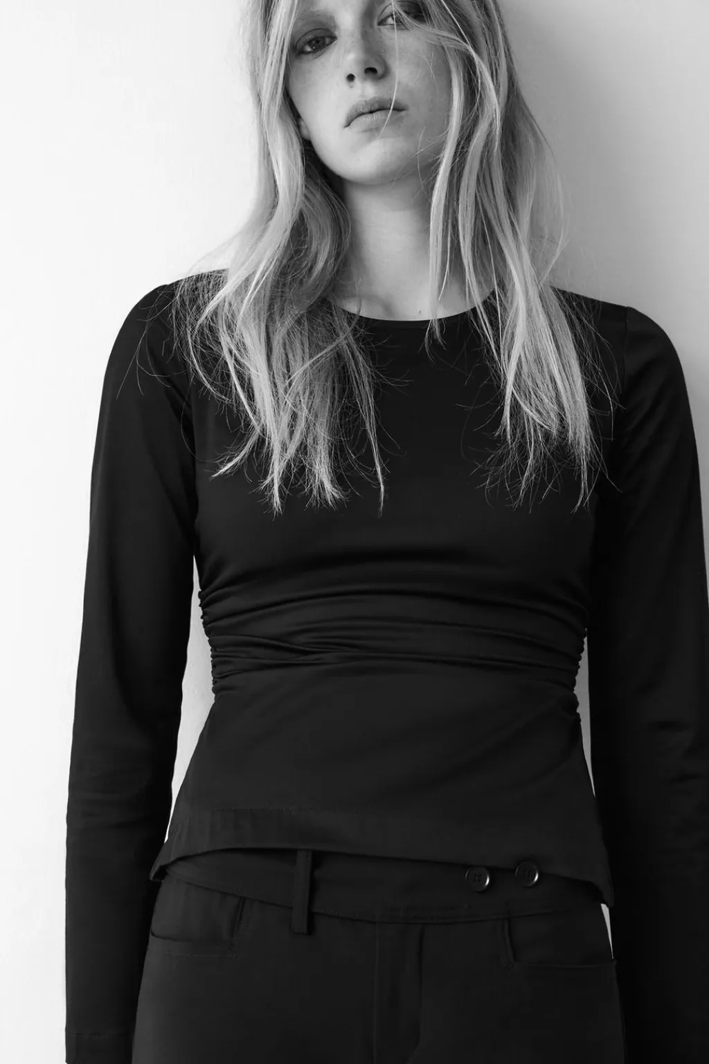 Top de cuello redondo y manga larga. Detalle de frunces laterales. Cierre en espalda con cremallera oculta en costura.