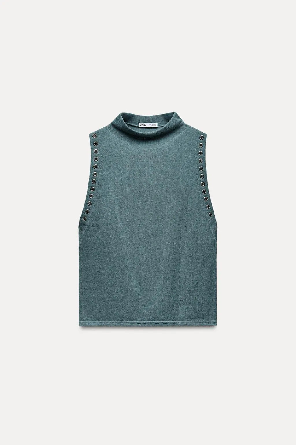 Top de cuello subido y manga sisa. Detalle de arandelas metálicas.