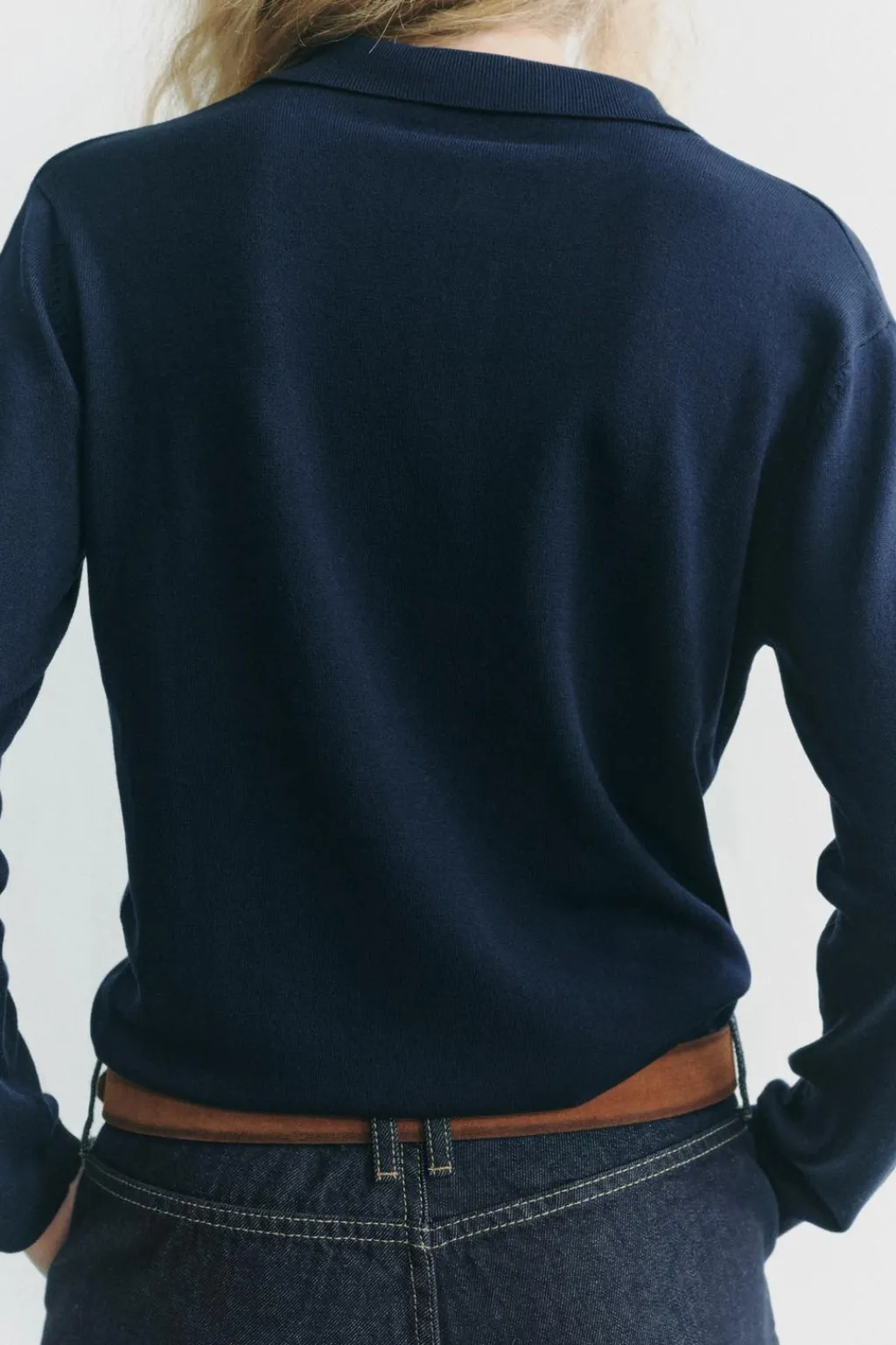 Top de punto liso con cuello solapa y manga larga. Botones delanteros.