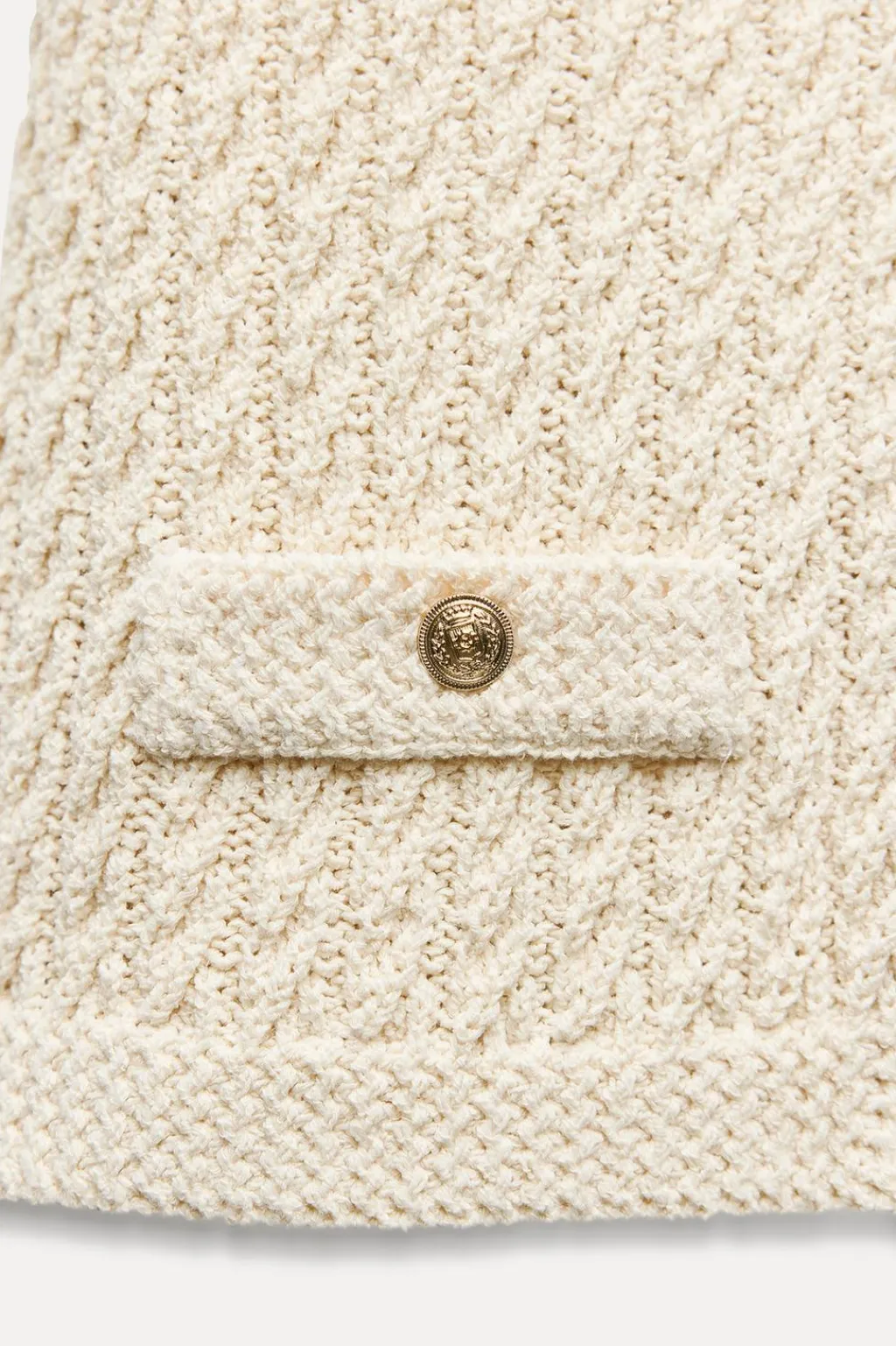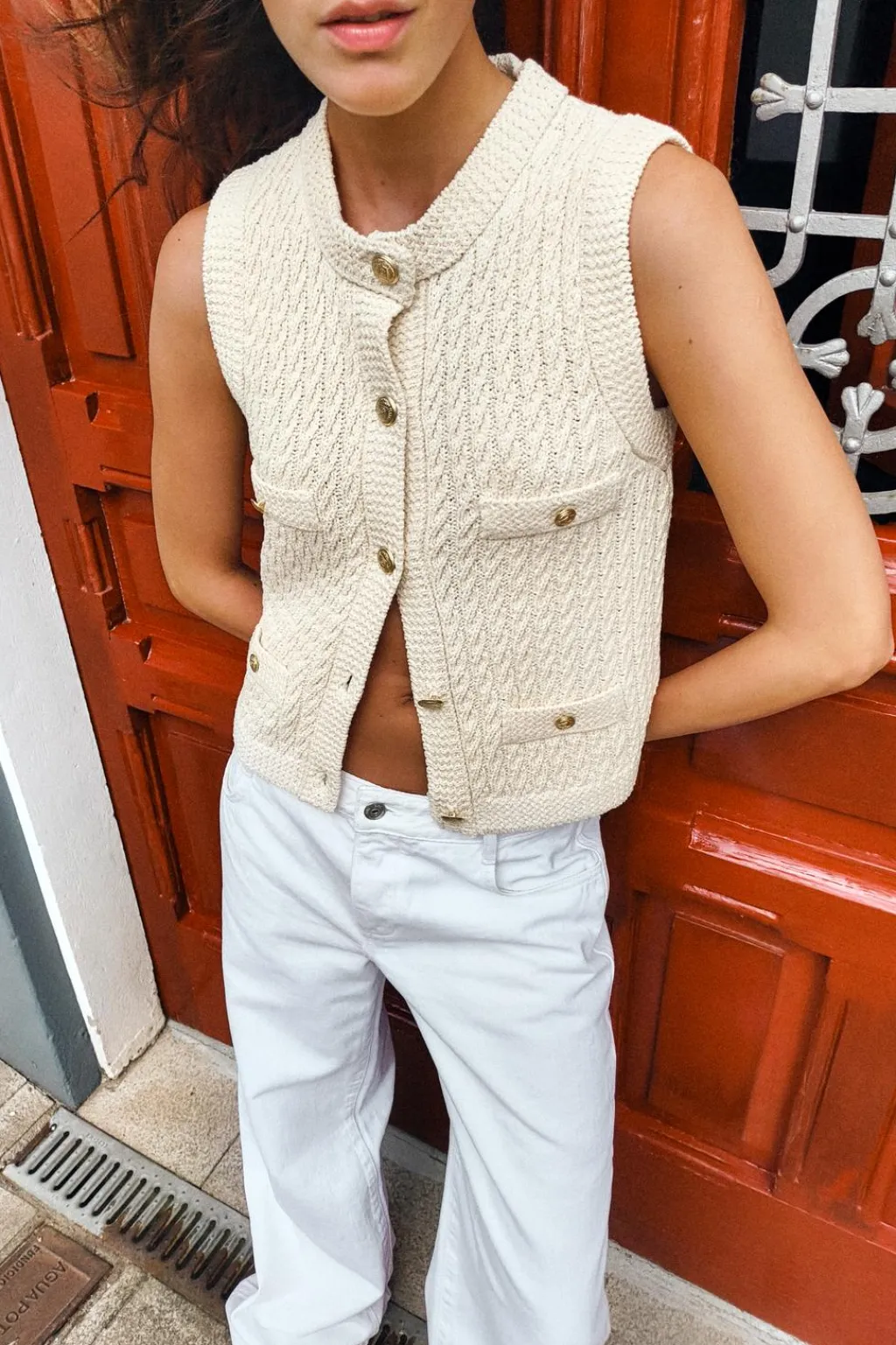 Top de cuello redondo y manga sisa. Detalle de falsos bolsillos de vivo delanteros. Cierre frontal con botones dorados con relieve.