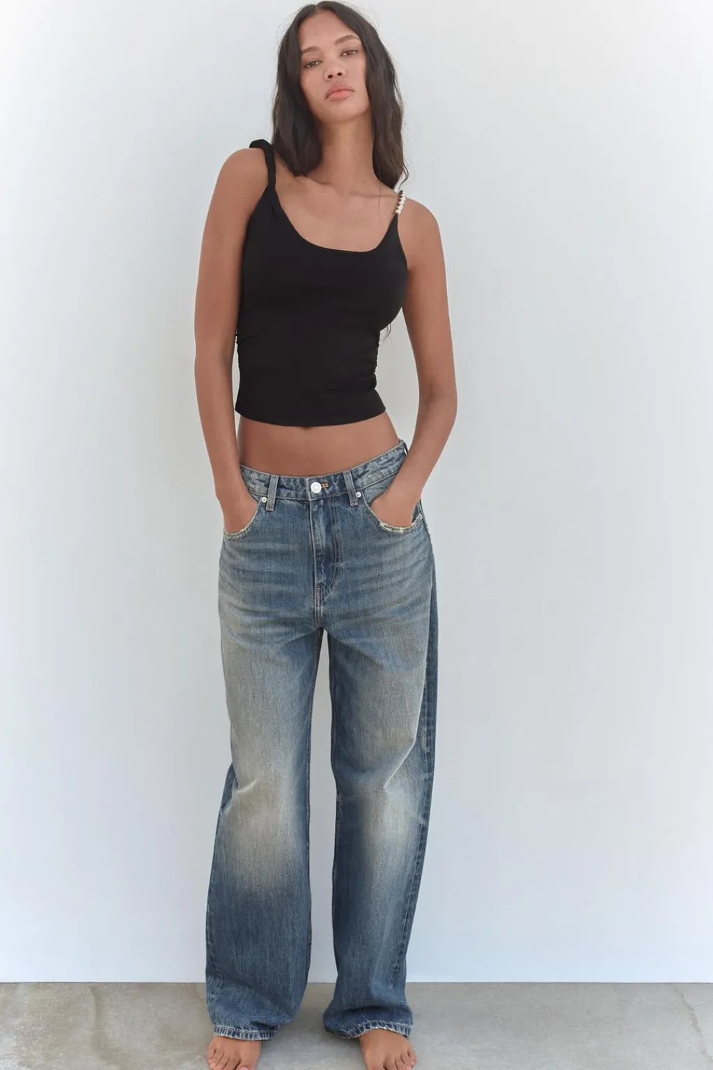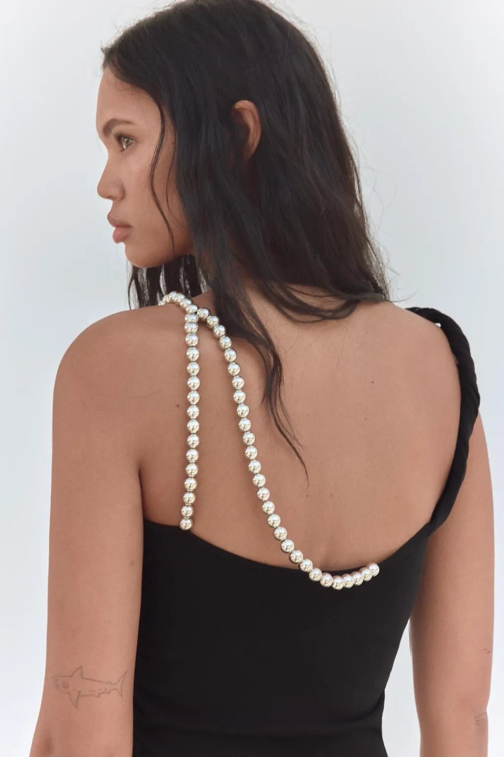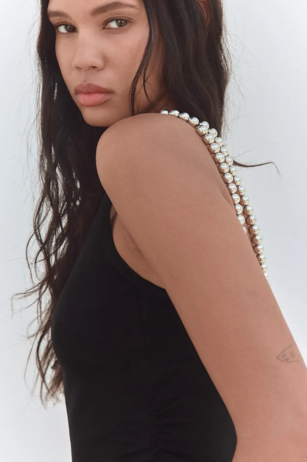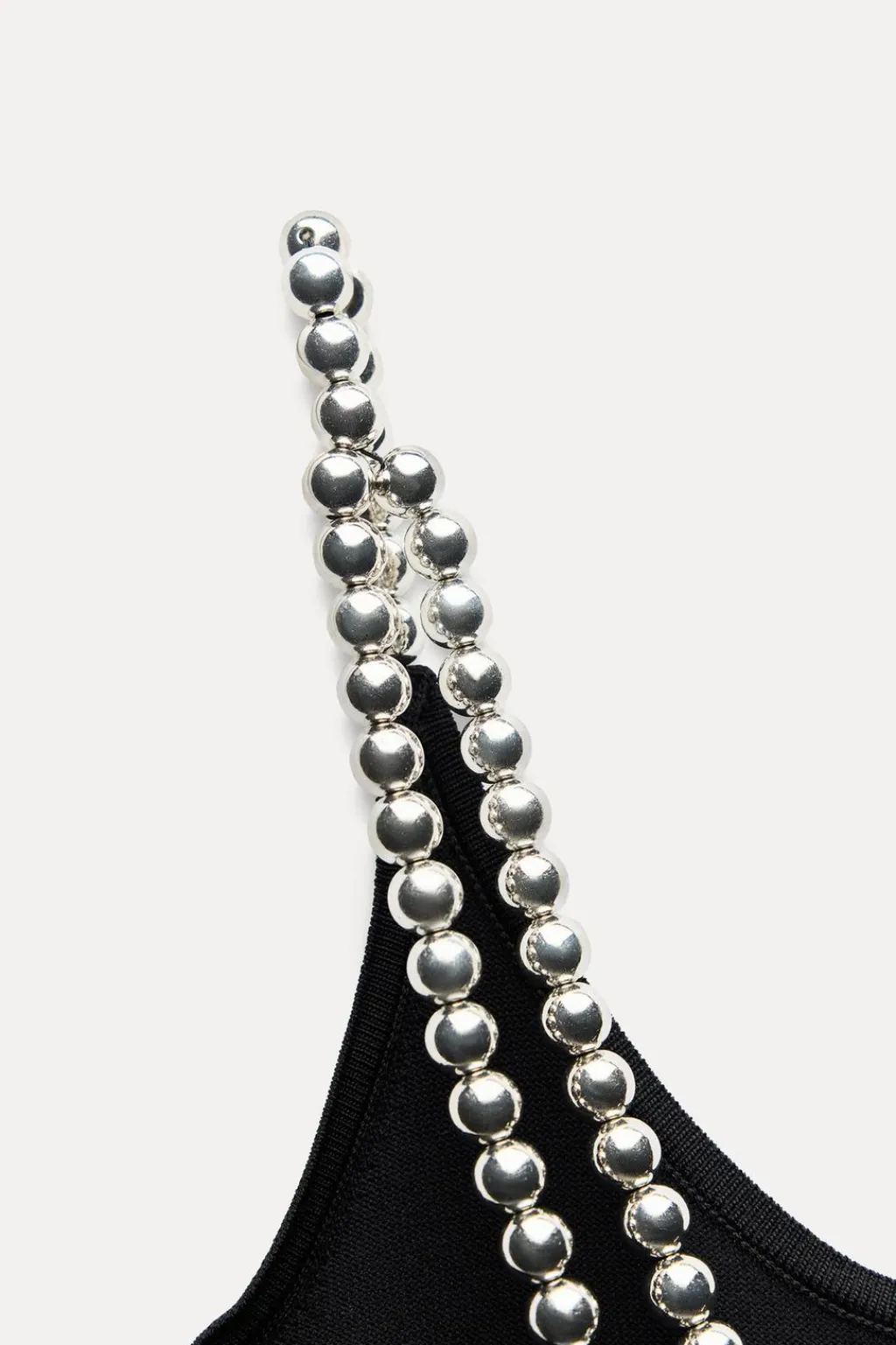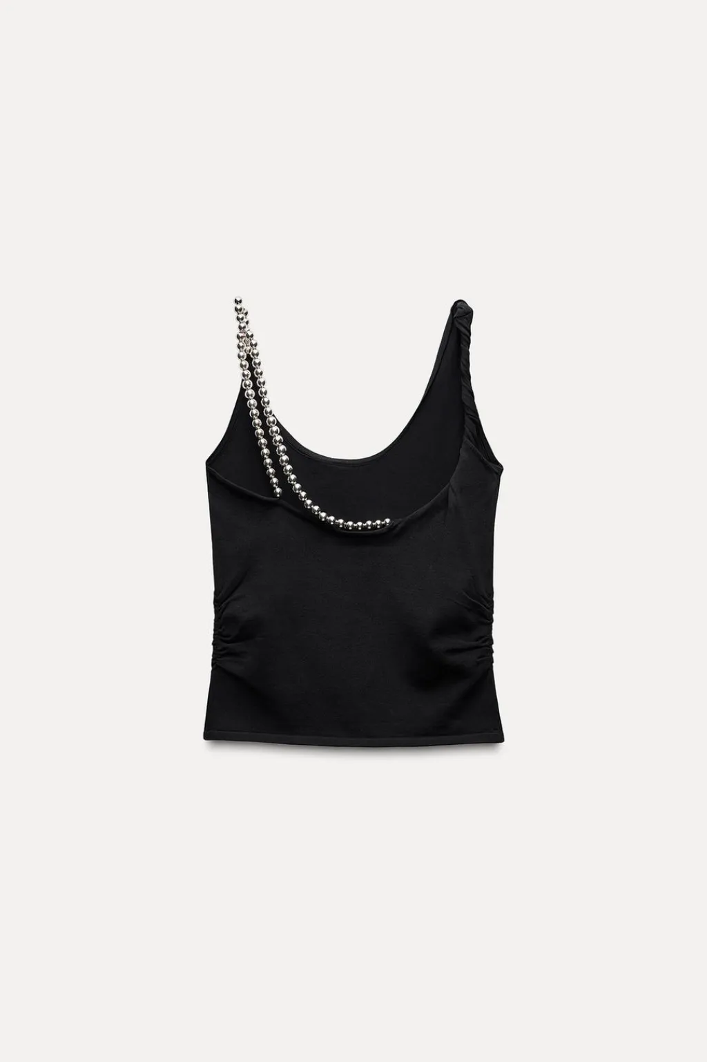 Top de escote redondo. Detalle de un tirante enroscado y el otro con aplicación de bolas metálicas.
