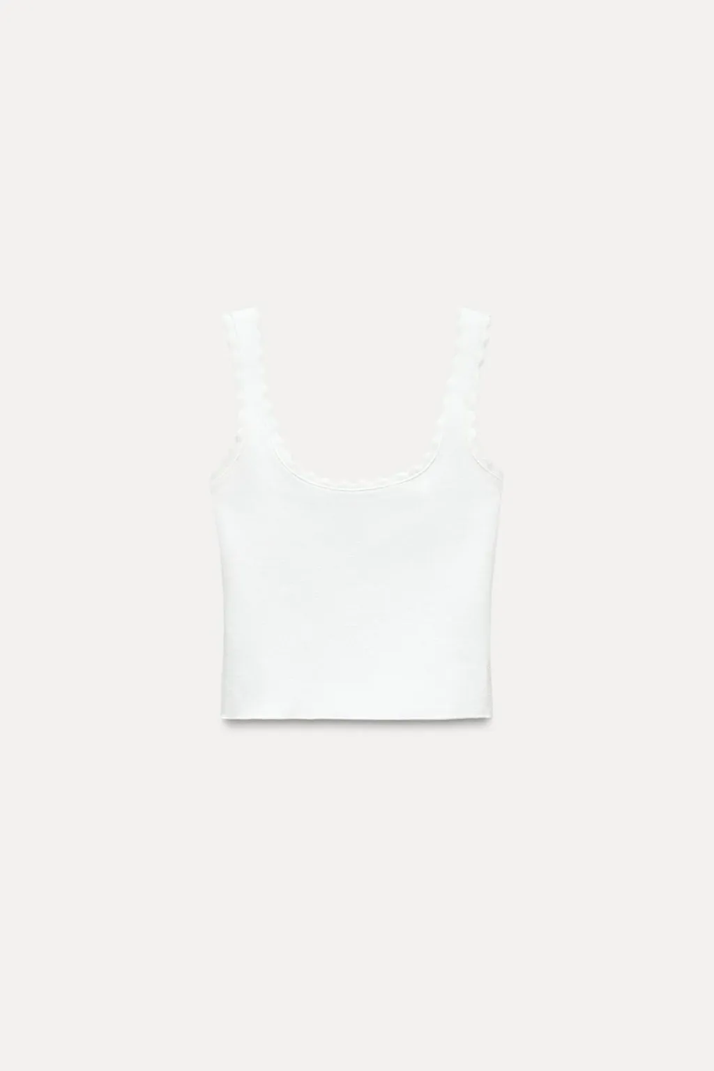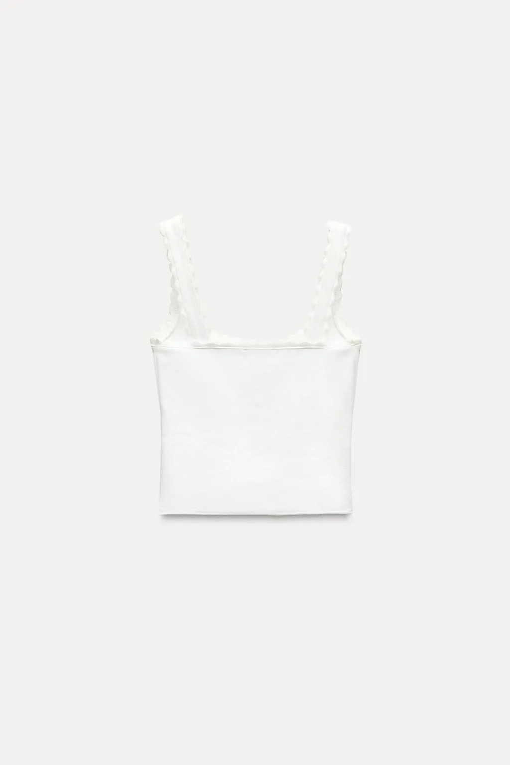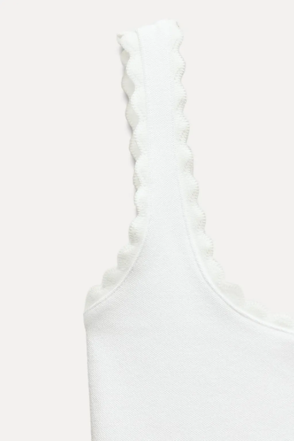 Top entallado confeccionado en tejido tipo punto. Escote recto y tirantes anchos con acabados en ondas.
