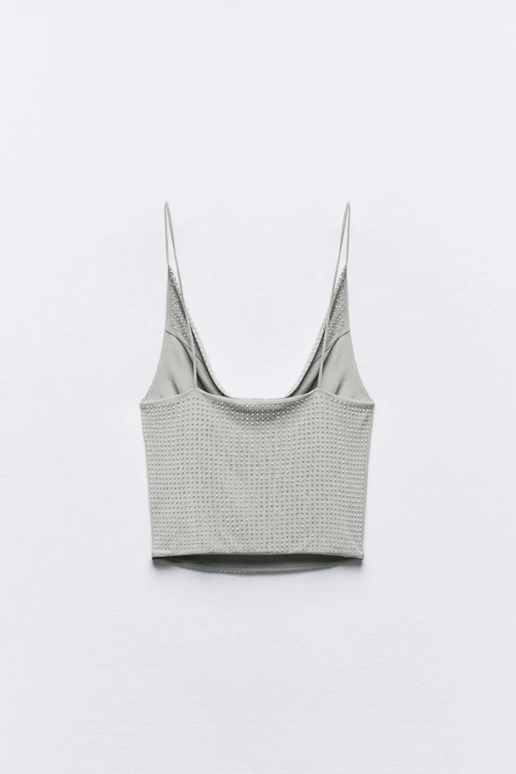 Top de escote fluido drapeado y tirantes finos. Detalle de aplicación brillos combinados.