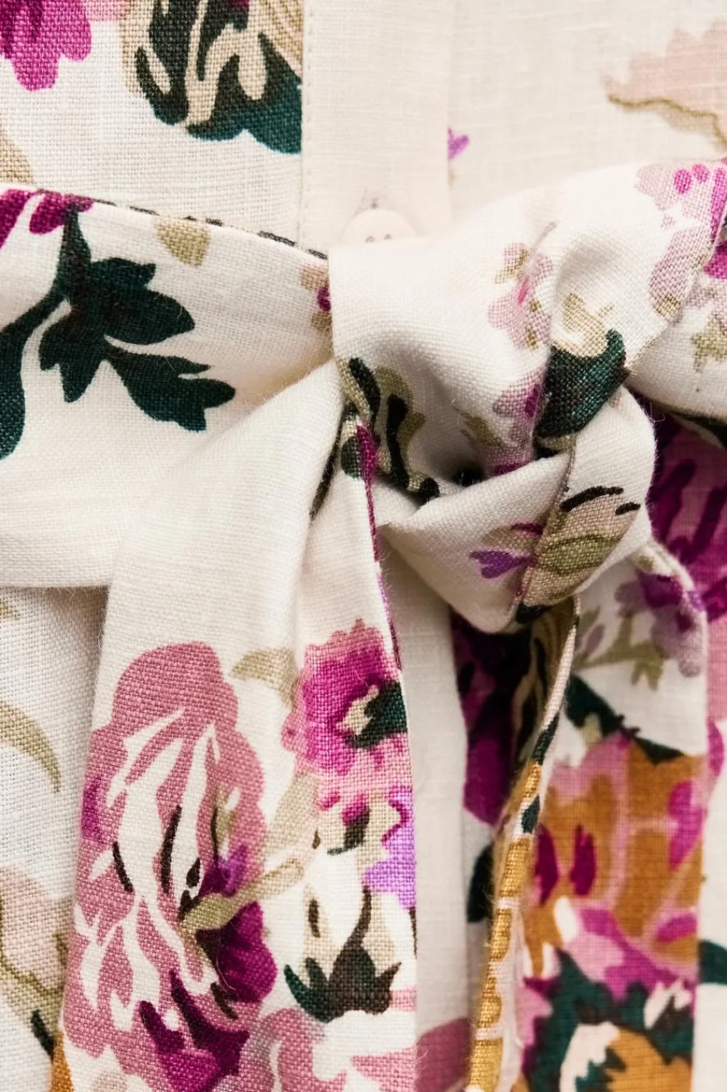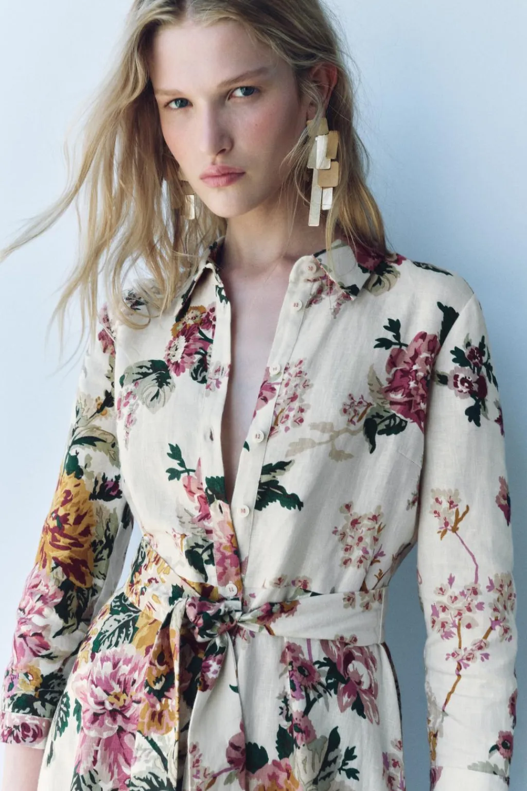 Vestido midi confeccionado en hilatura de lino 100%. Cuello solapa y manga larga acabada en puño. Cinturón en mismo tejido ajustable con lazadas. Cierre frontal con botones.