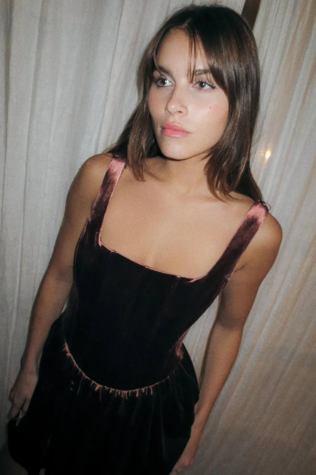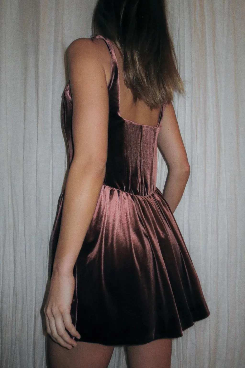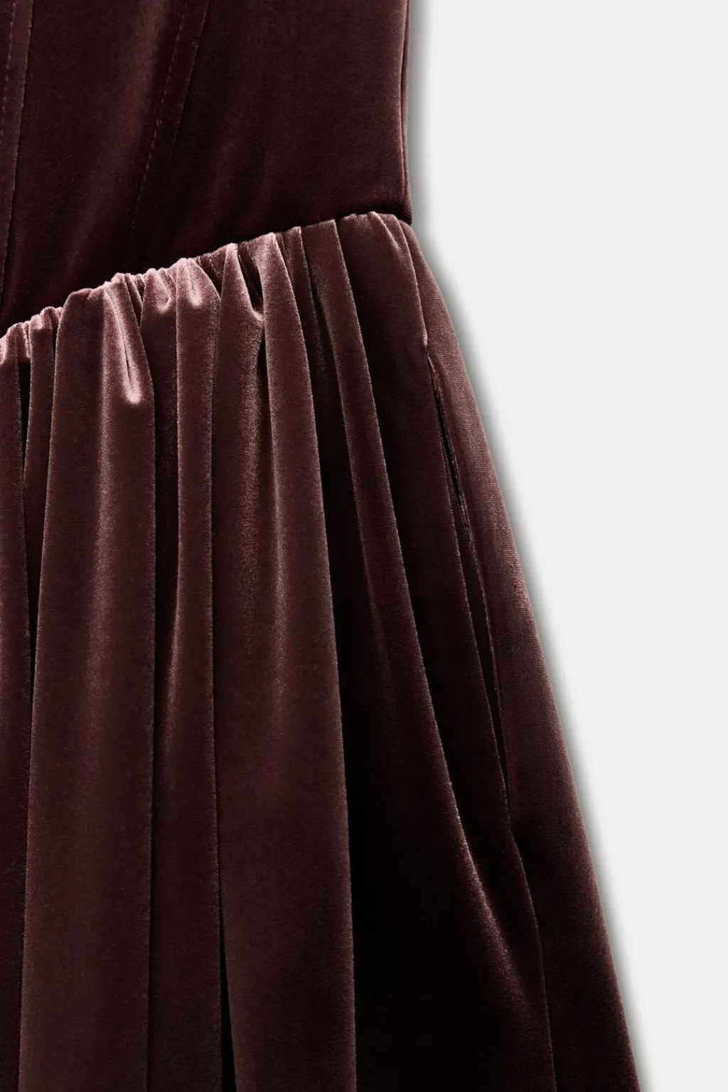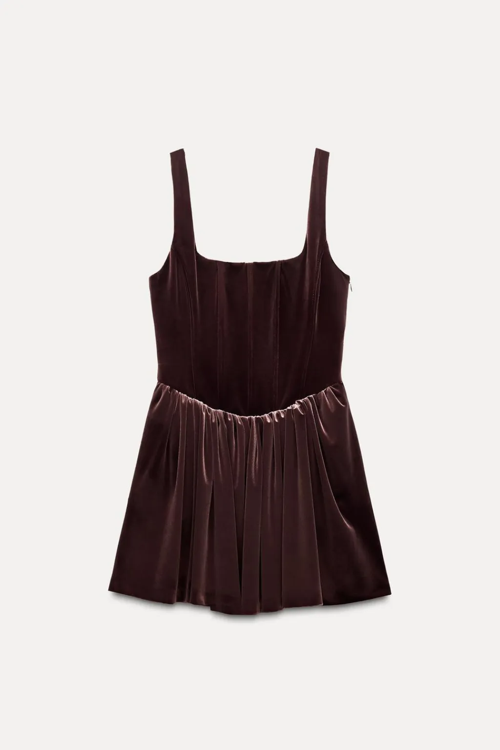 Vestido corto de escote cuadrado y tirantes. Bolsillos laterales ocultos en costura. Detalle de pliegues en cintura. Cierre lateral con cremallera oculta en costura.