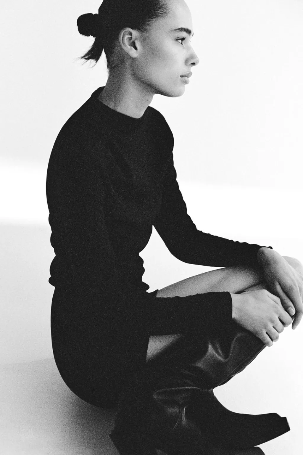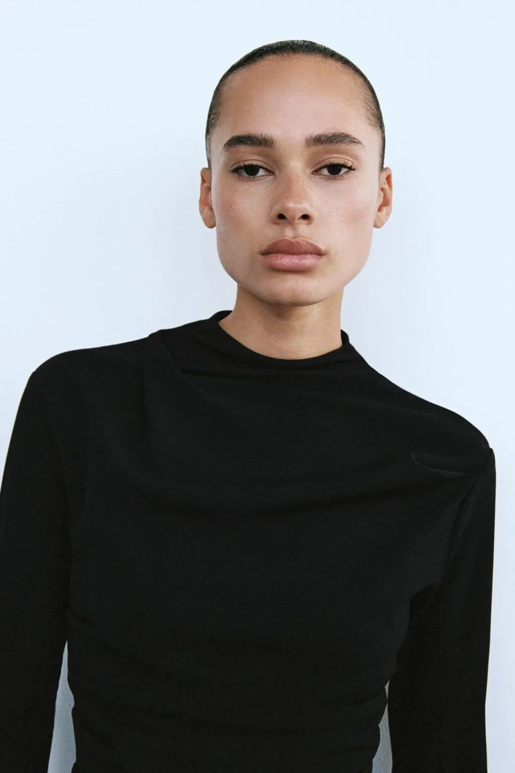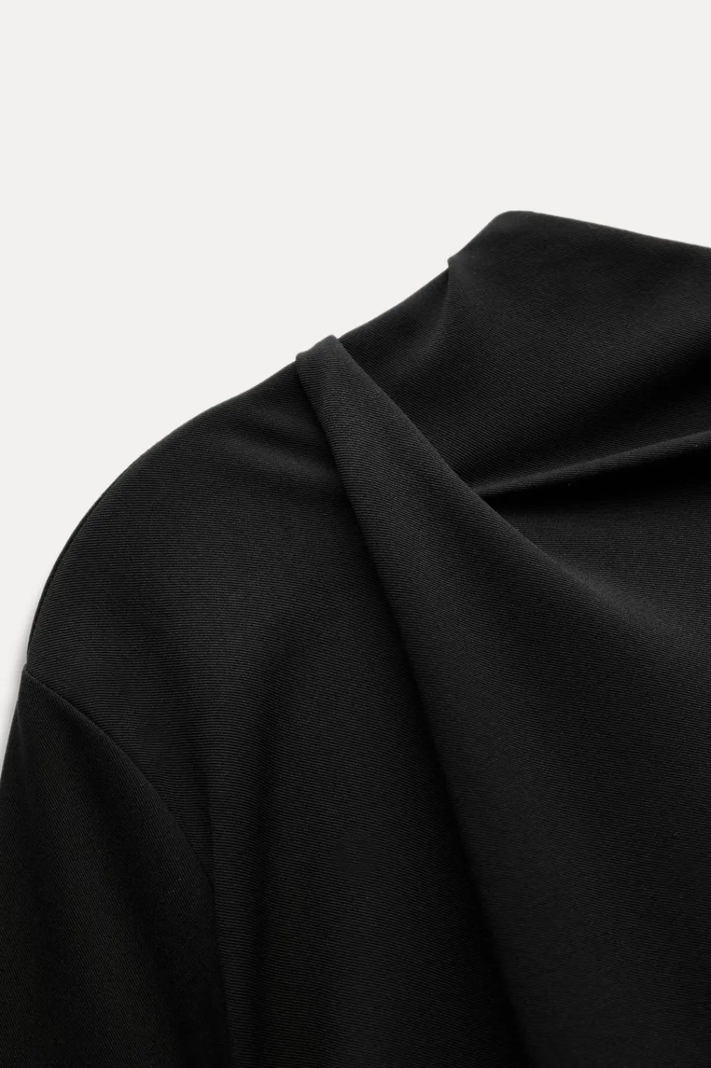 Vestido corto de cuello subido y manga larga acabada en abertura y botón. Detalle de pliegues. Cierre en espalda con cremallera oculta en costura.