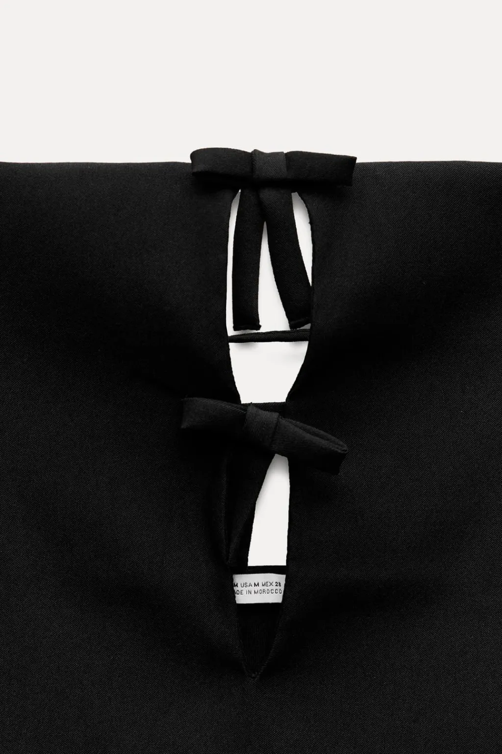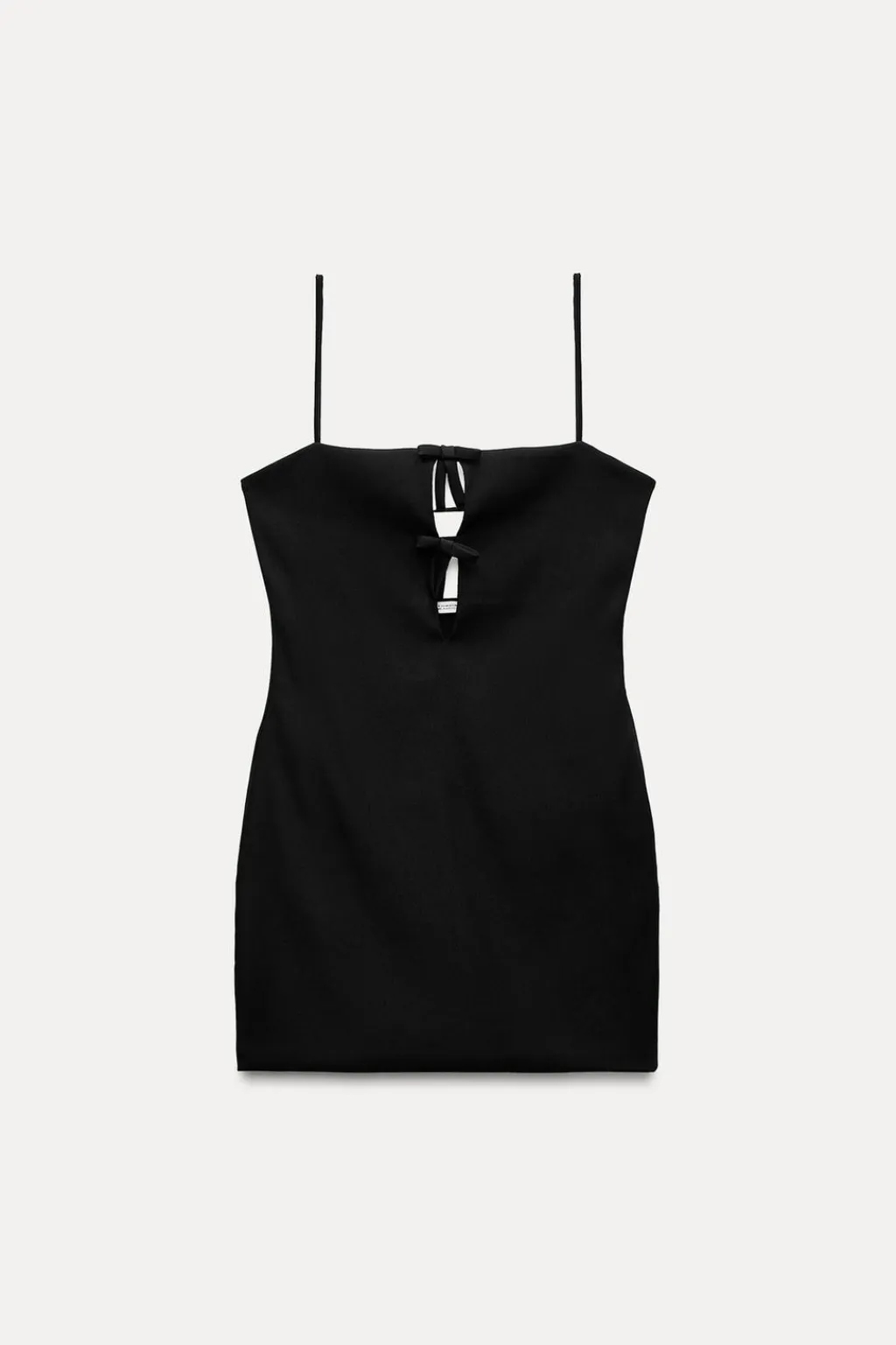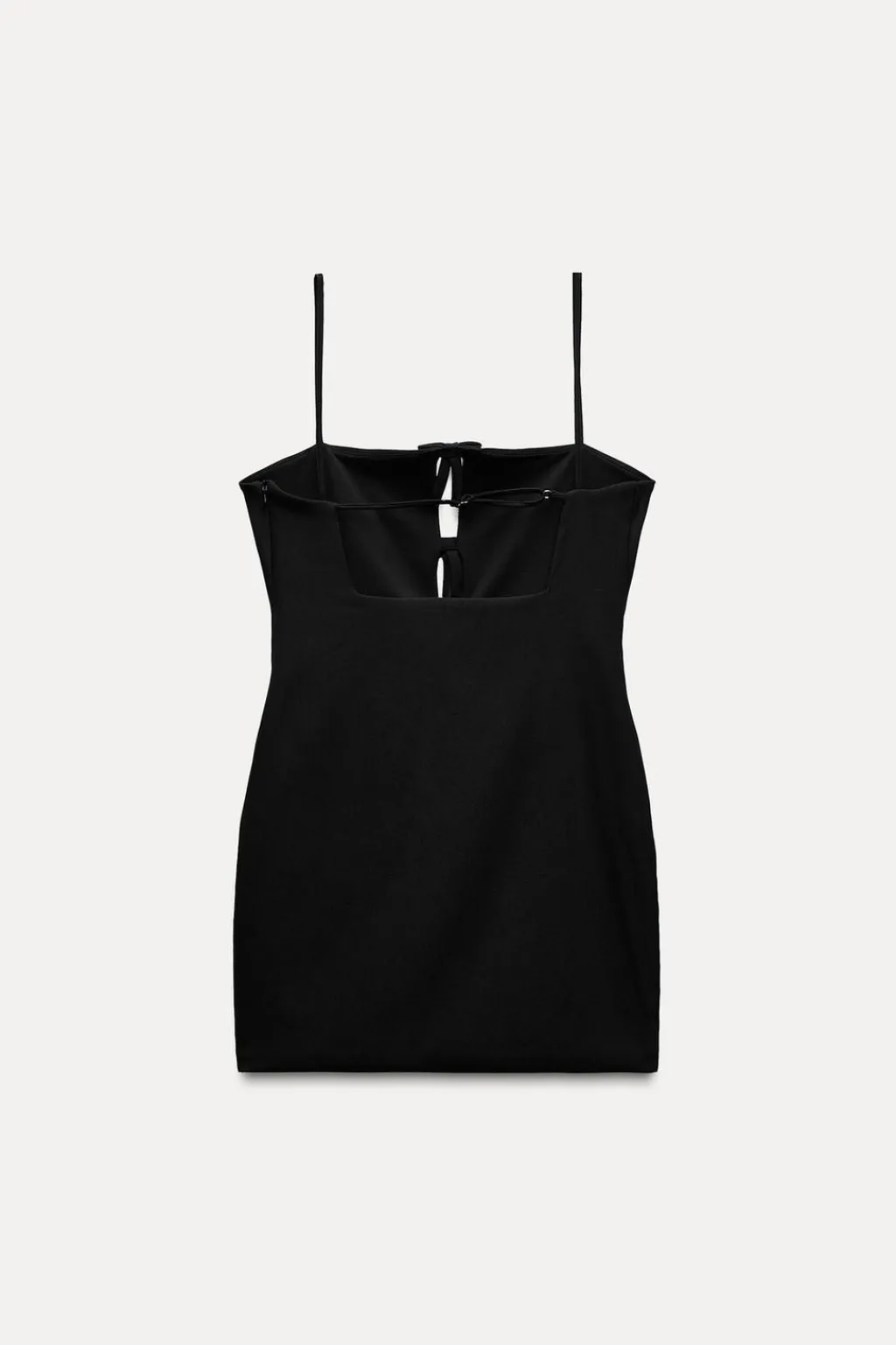 Vestido corto entallado de escote recto y tirantes finos. Detalle de aberturas y lazos en delantero. Tira ajustable en espalda. Forro interior combinado a tono. Cierre lateral con cremallera oculta en costura.
