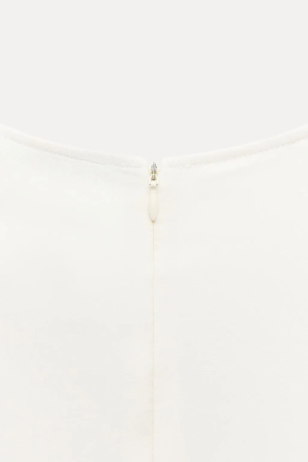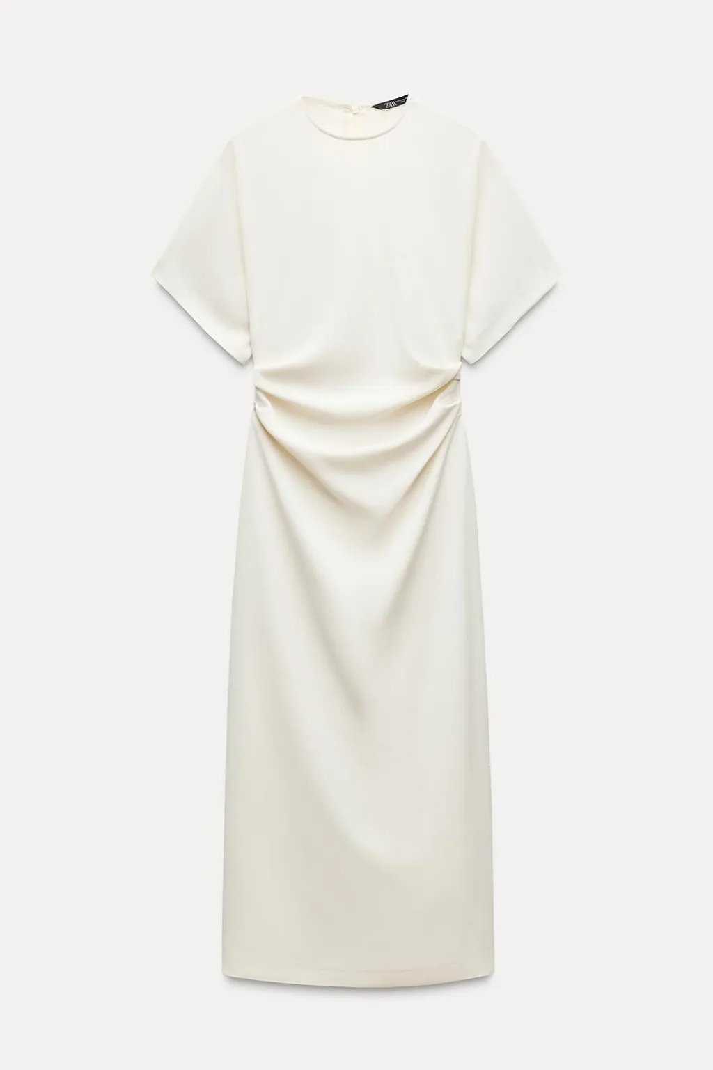Vestido midi de cuello redondo y manga corta. Tejido drapeado en cintura. bajo con abertura en espalda. Cierre en espalda con cremallera oculta en costura.