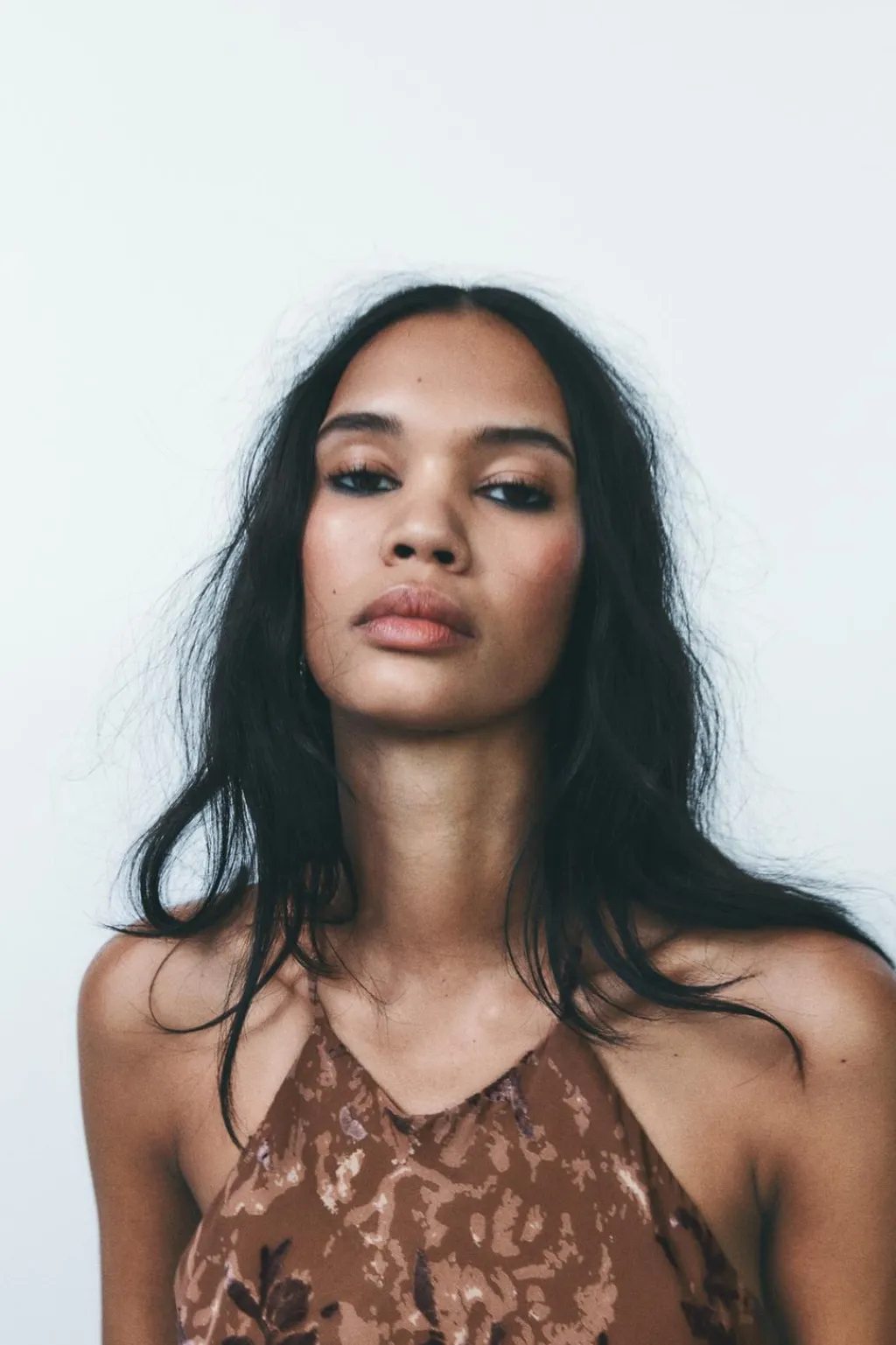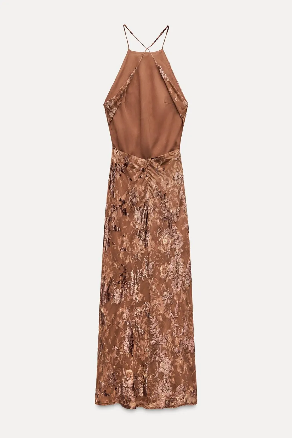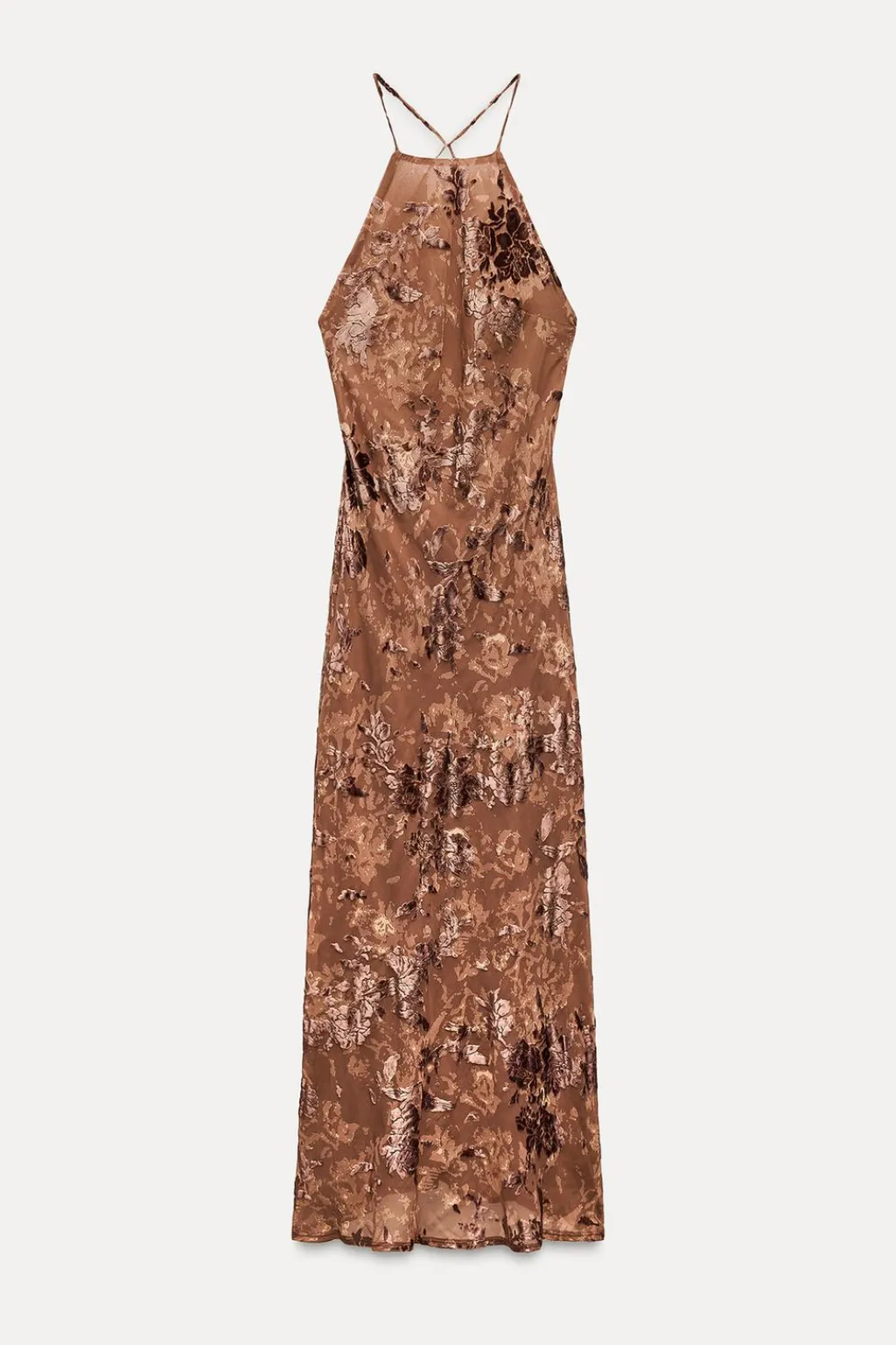 Vestido midi de cuello halter. Espalda descubierta con tiras. Detalle de flores en terciopelo. Forro interior combinado a tono. Cierre en espalda con cremallera oculta en costura.