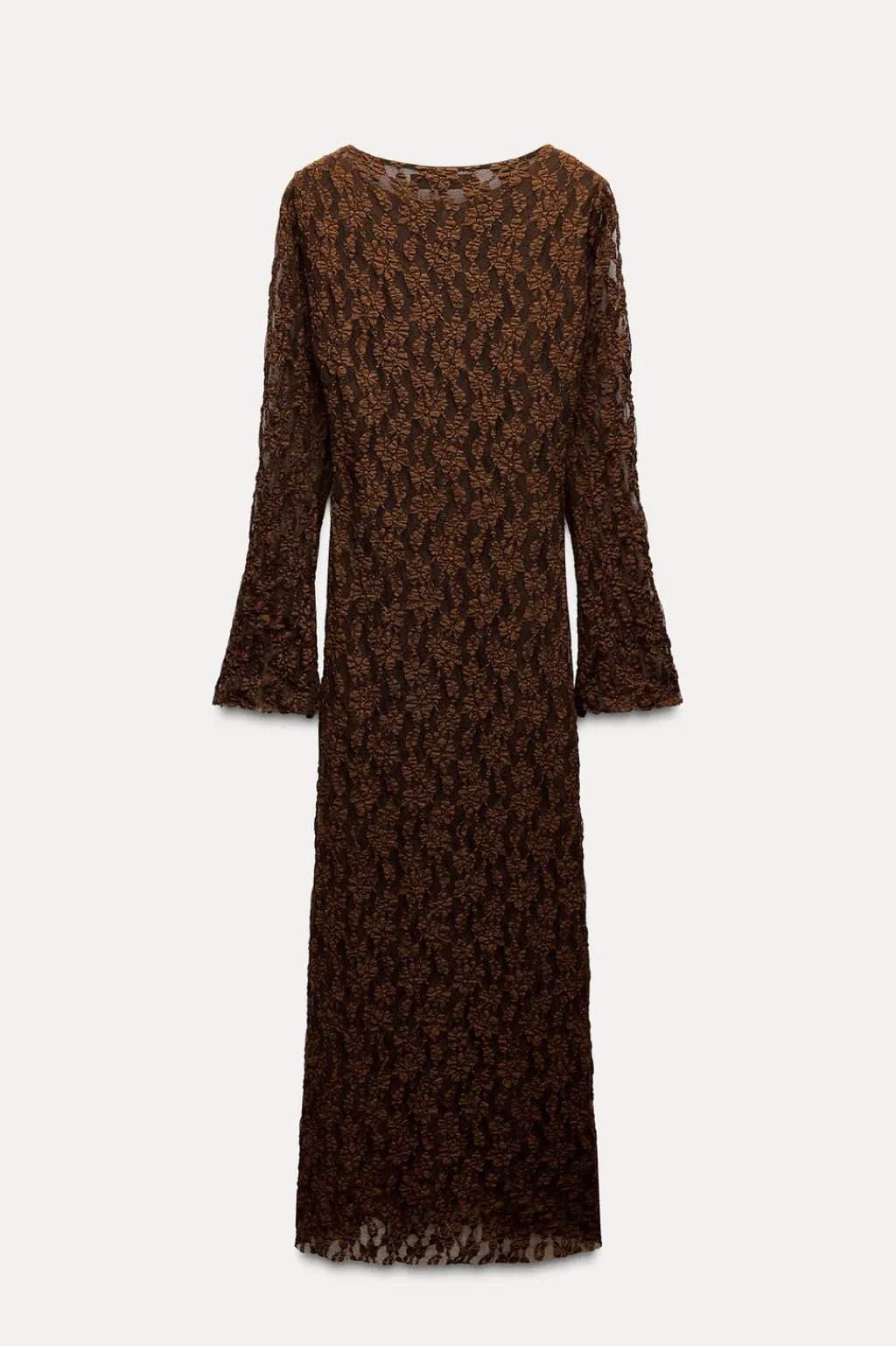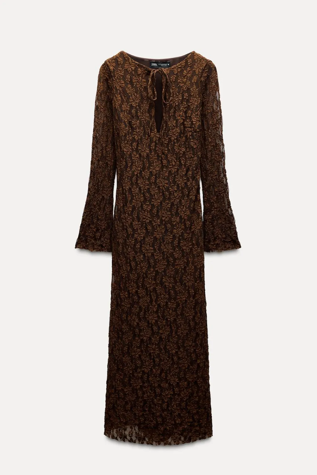Vestido largo de cuello redondo y escote pico con lazada. Manga larga semitransparente acabada en línea evasé. Forro interior combinado a tono. Cierre lateral con cremallera oculta en costura.