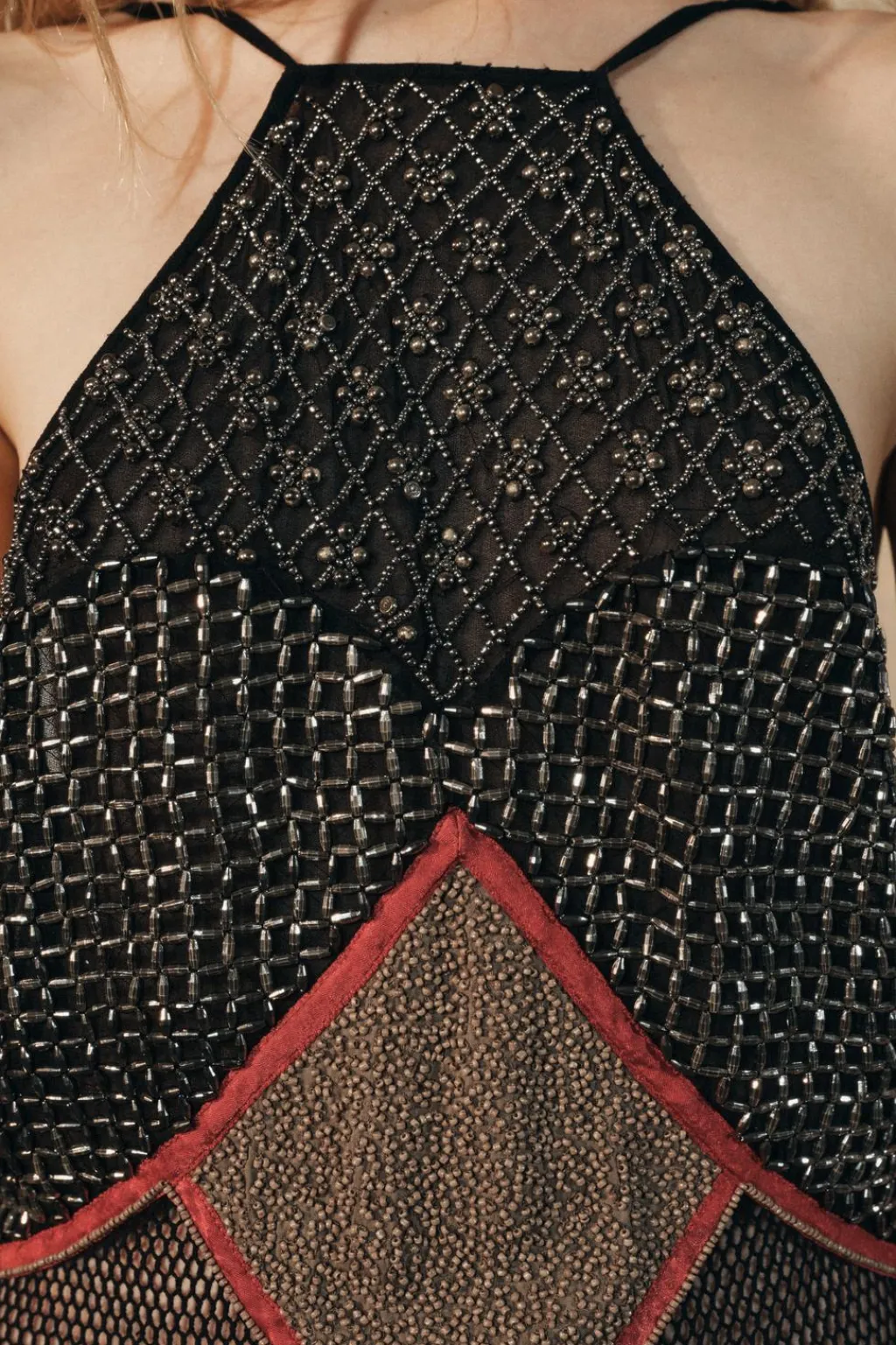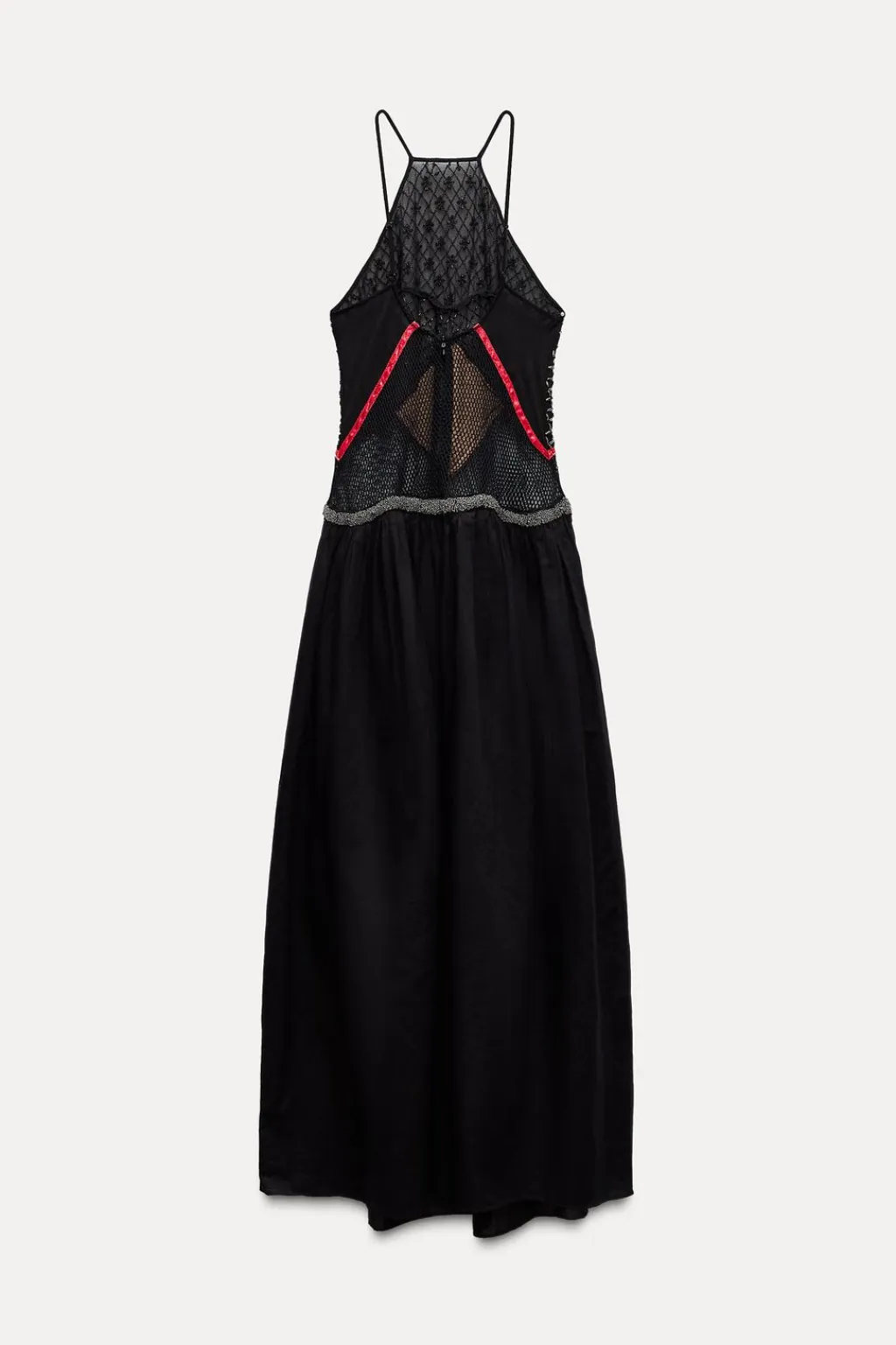 Vestido midi confeccionado en mezcla de algodón y con lino. Cuello halter y tirantes finos ajustables. Detalle de bordados con aplicación de abalorios. Forro interior.