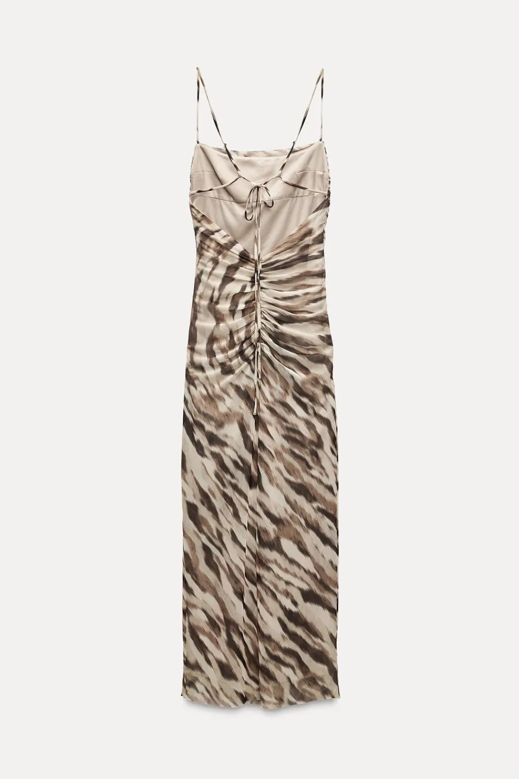 Vestido midi de escote recto y tirantes finos ajustables. Detalle de lazada en espalda. Tejido drapeado. Forro interior. Cierre en espalda con cremallera oculta en costura.