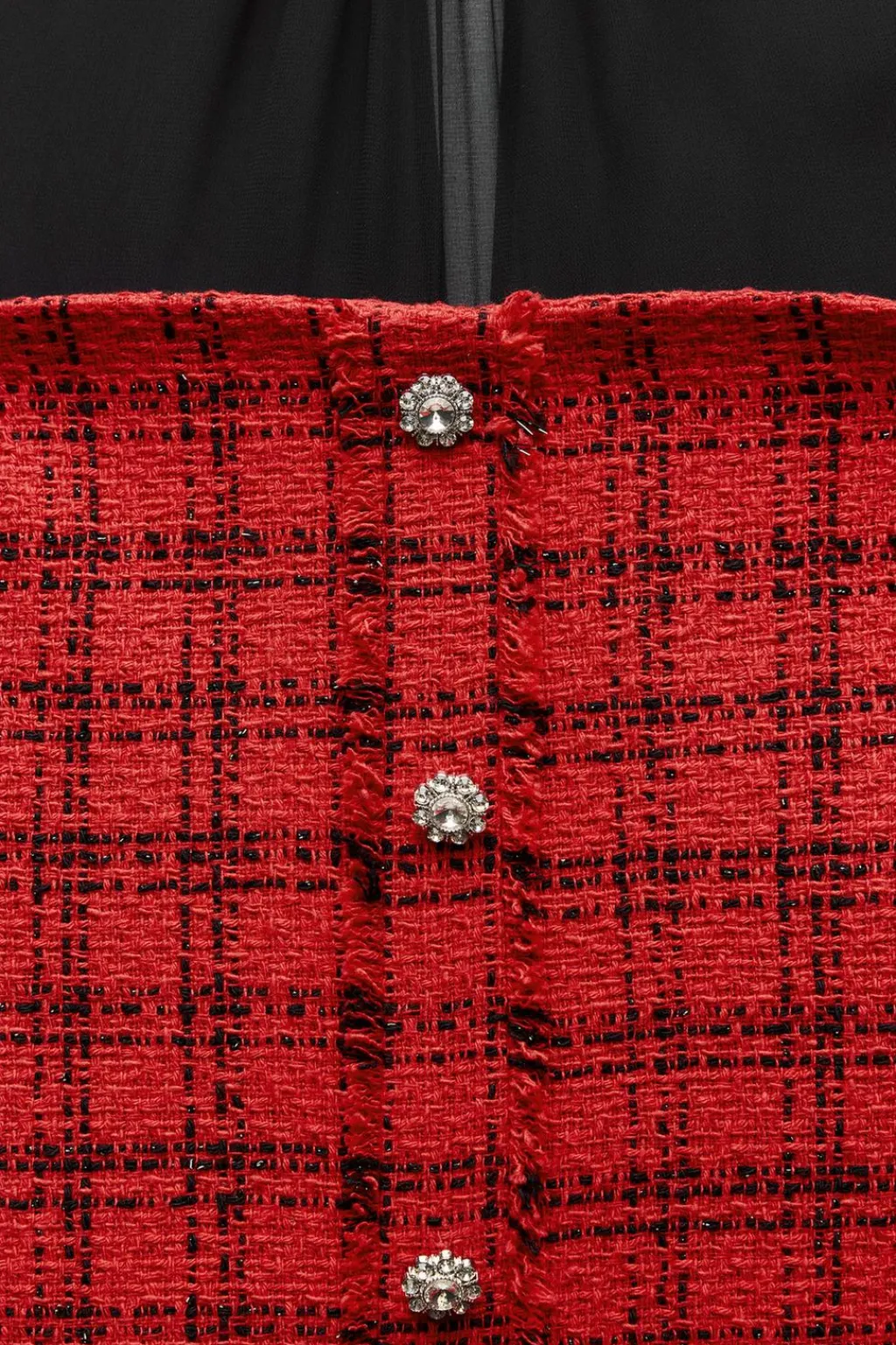 Vestido de cuello subido y manga larga. Detalle de tejido combinado semitransparente y falsos botones joya delanteros. Cierre en espalda con cremallera oculta, abertura y botones.