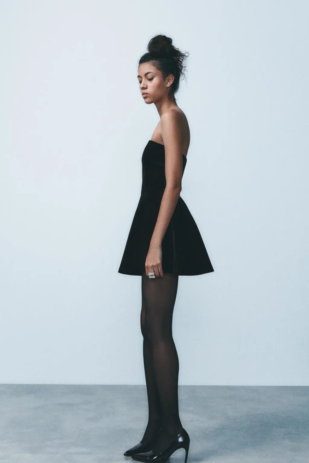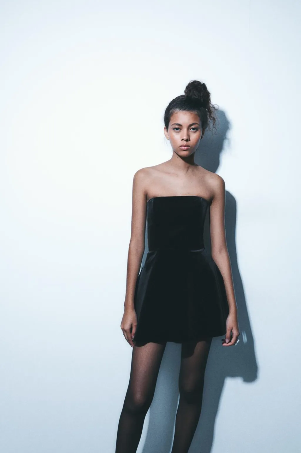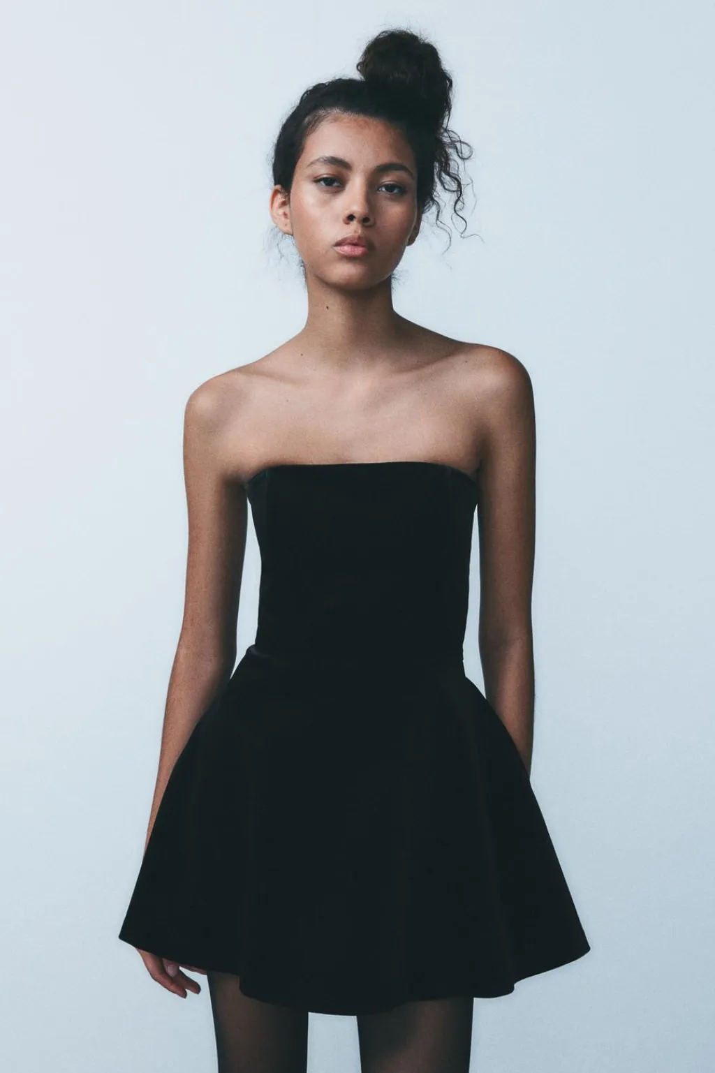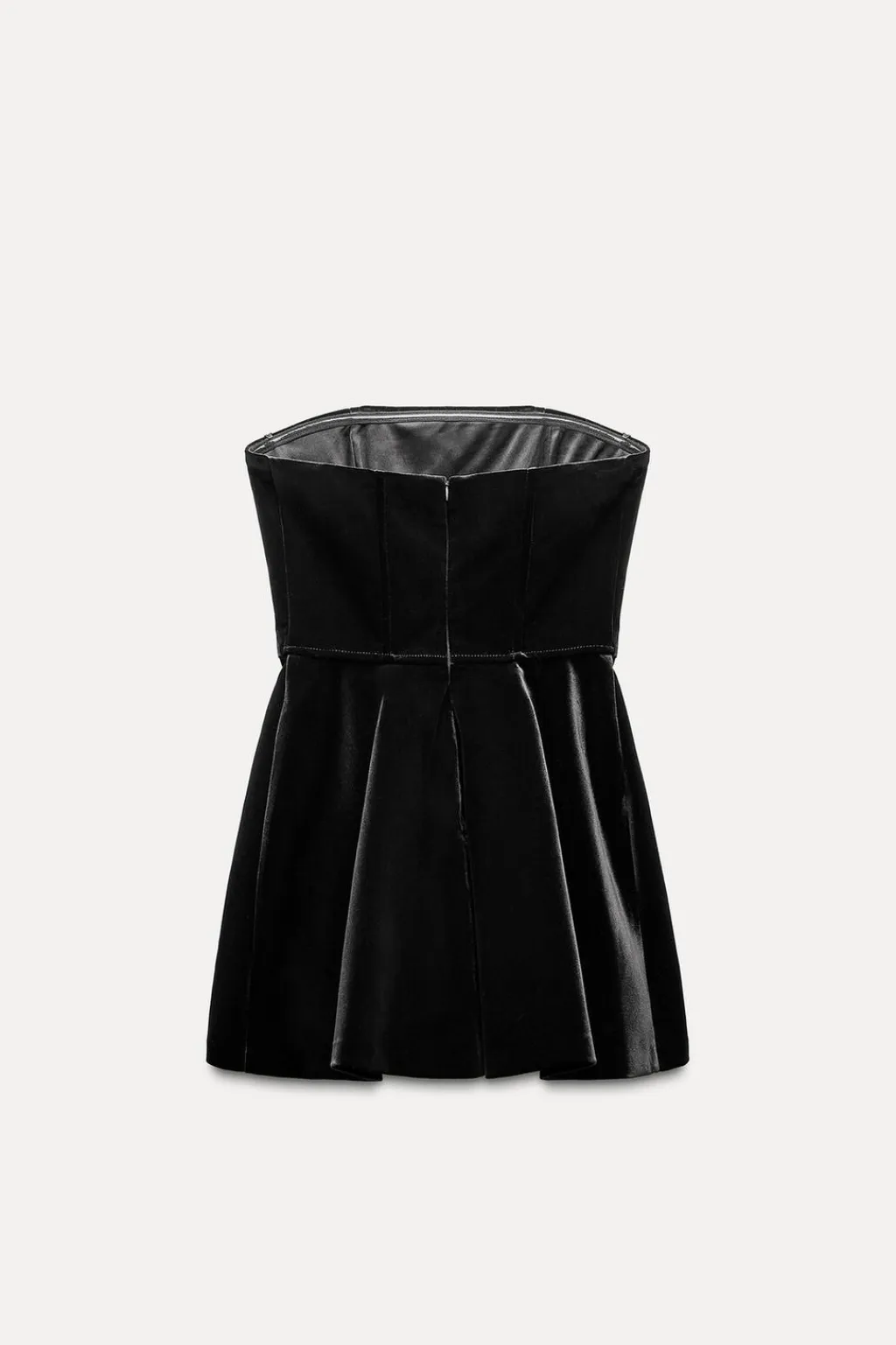 Vestido mono de escote recto y hombros descubiertos. Forro interior tipo shorts. Cierre en espalda con cremallera oculta en costura.
