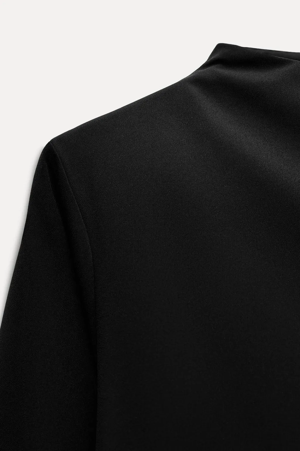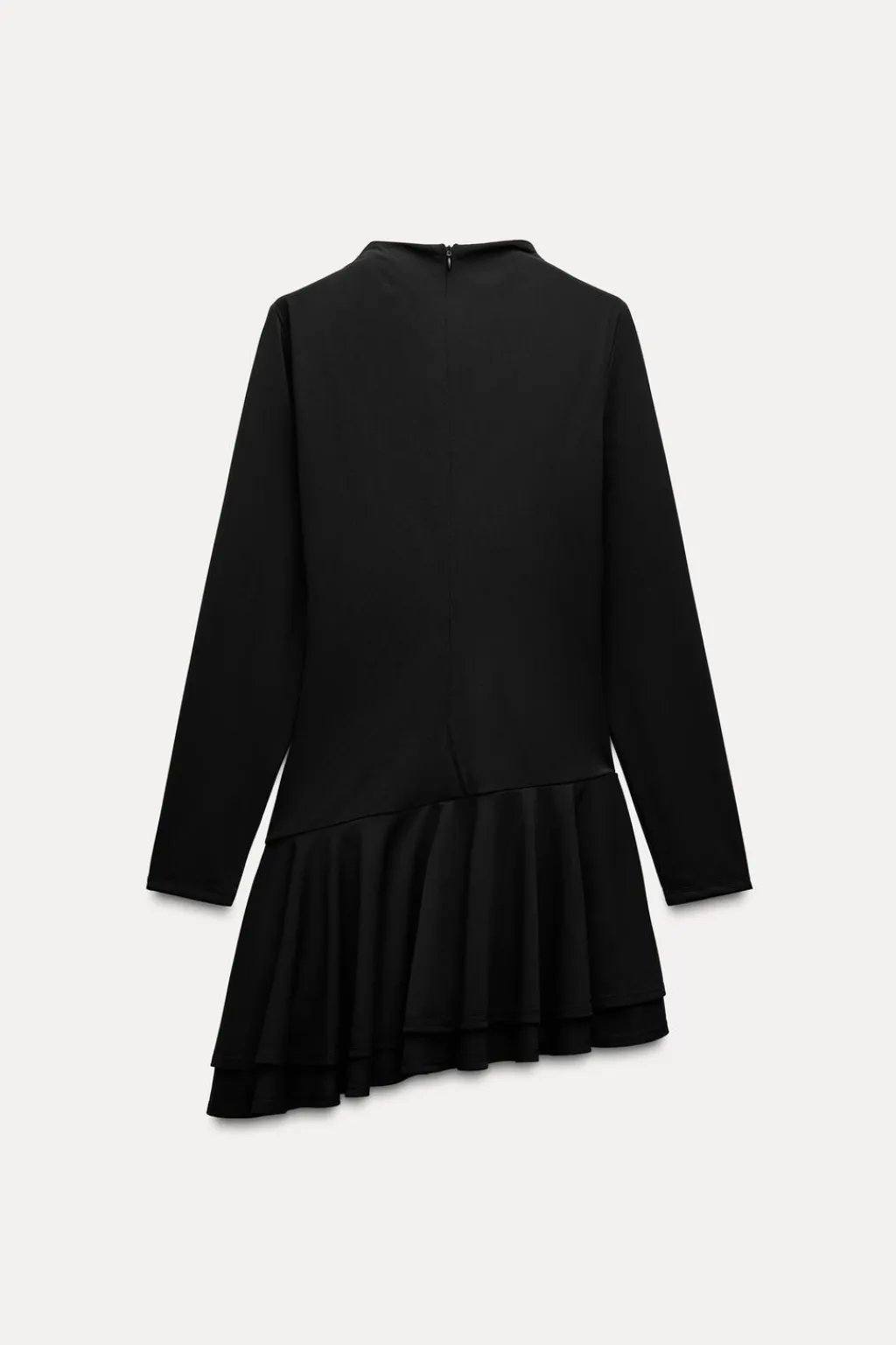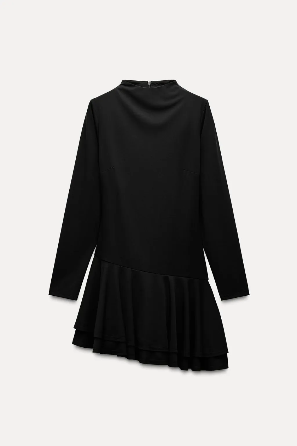 Vestido de cuello subido y manga larga. Detalle de volantes acabados asimétricos en bajo. Forro interior tipo shorts. Cierre en espalda con cremallera oculta en costura.