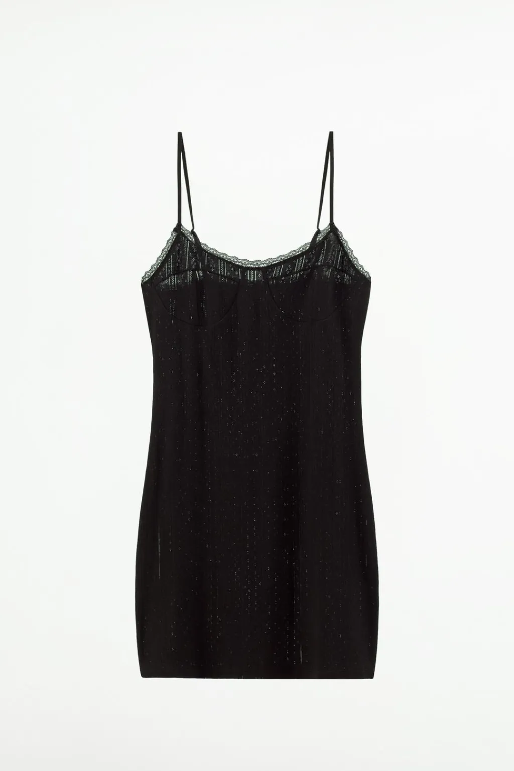 Vestido midi confeccionado en hilatura de algodón 100%. Escote redondo y tirantes finos ajustables. Detalle de costuras marcadas en pecho. Acabados en puntilla.