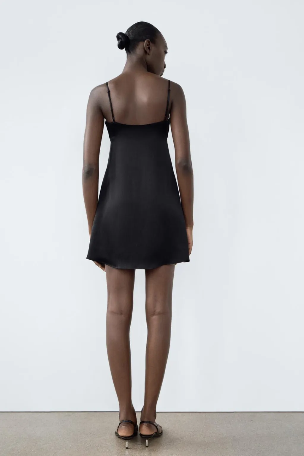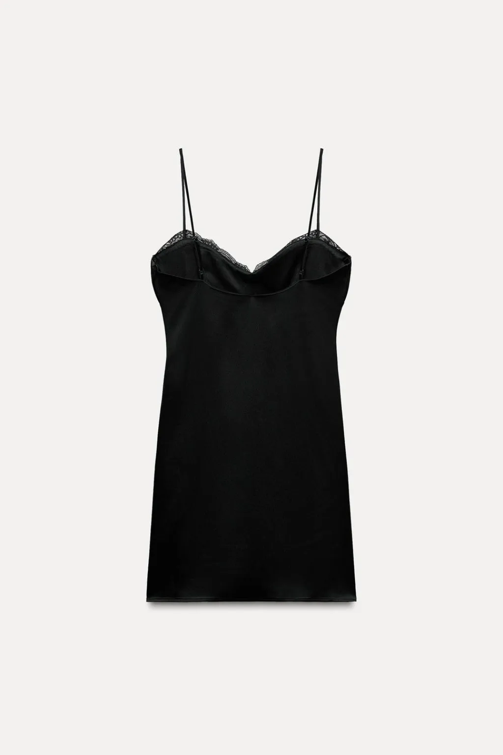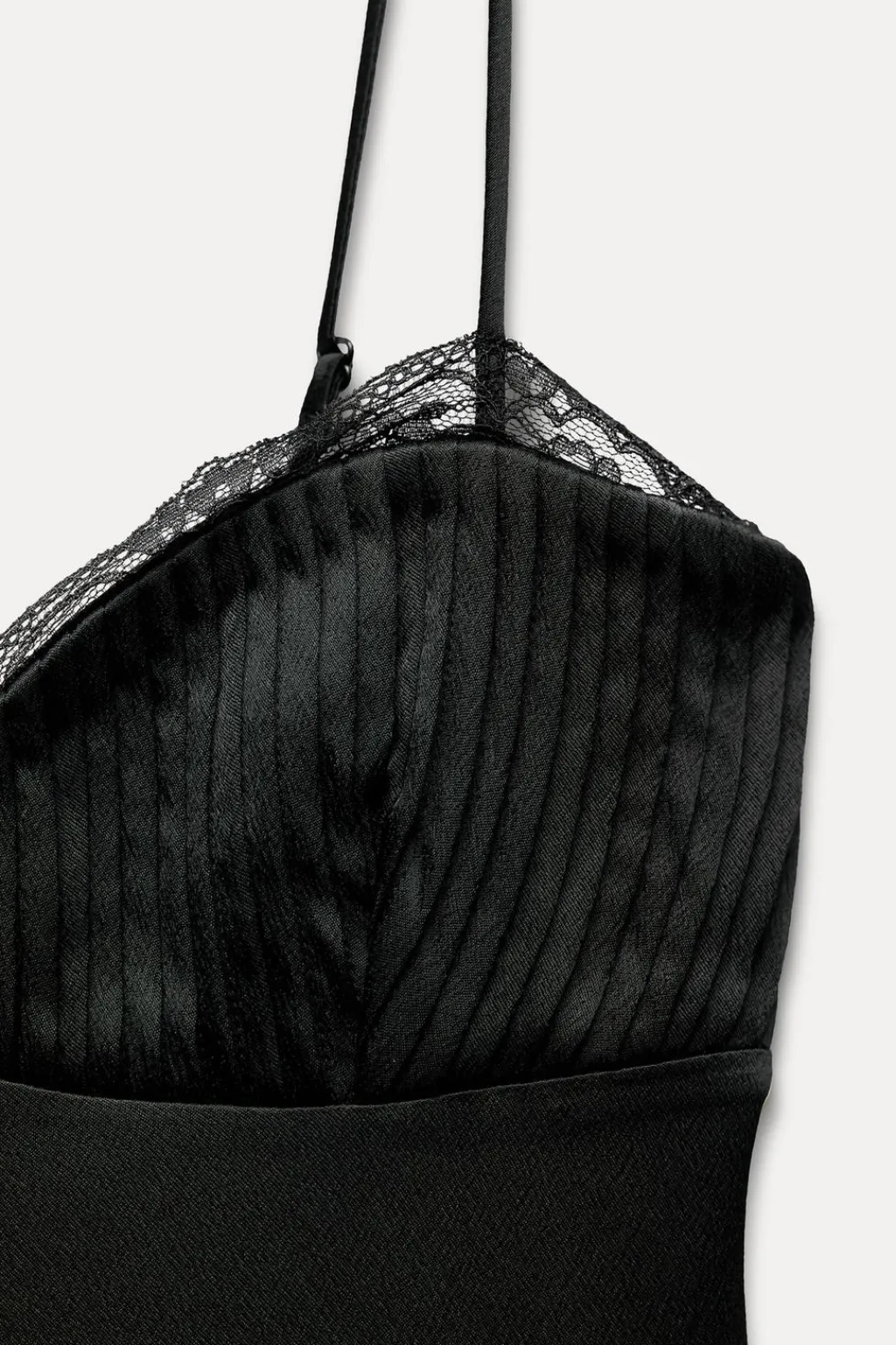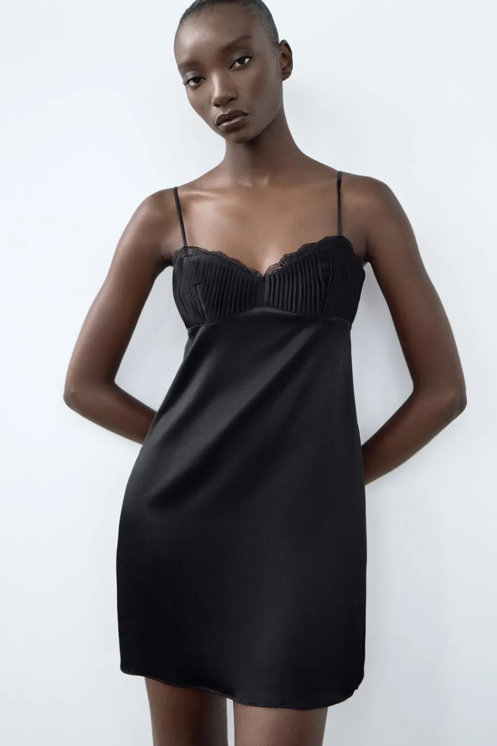 Vestido corto de escote pico y tirantes finos ajustables. Acabados en encaje a tono. Detalle de tejido plisado en pecho. Cierre lateral con cremallera oculta en costura.