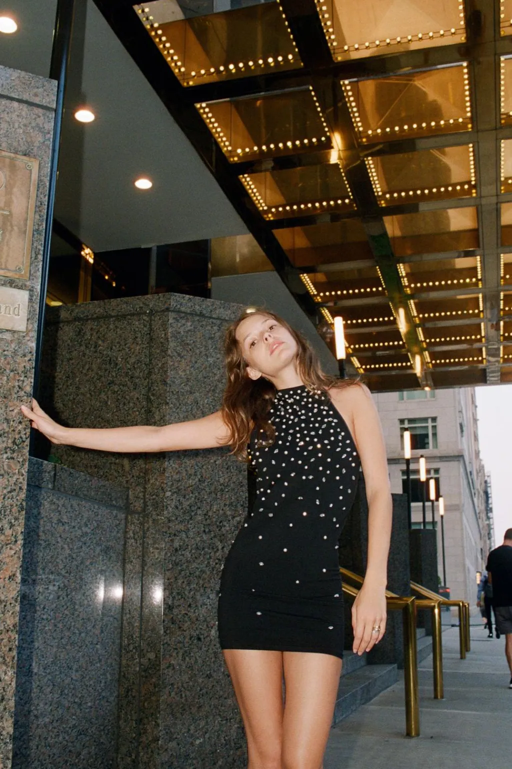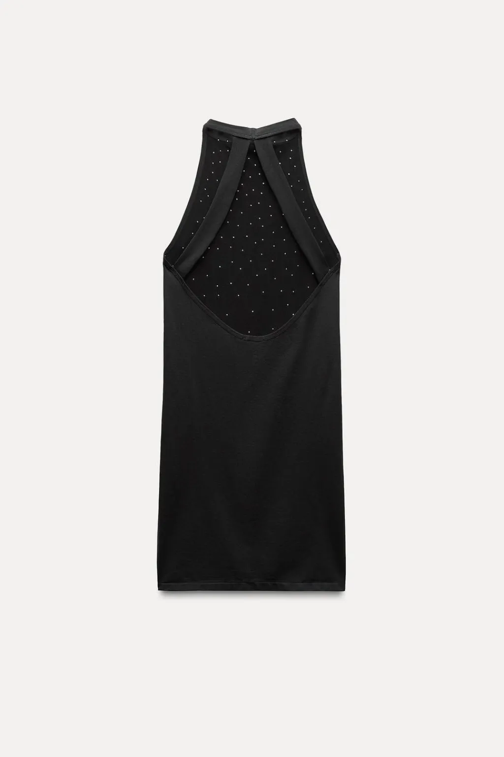 Vestido entallado de cuello halter. Tirantes en espalda. Detalle de aplicación joyas.
