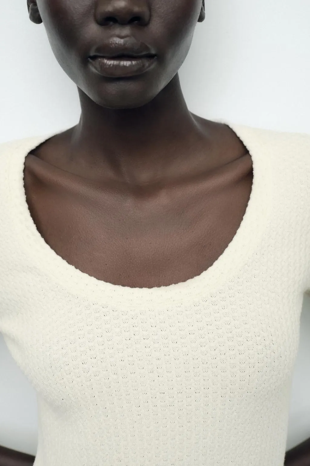 Vestido midi de escote redondo y manga por debajo del codo. Detalle de tejido con textura.