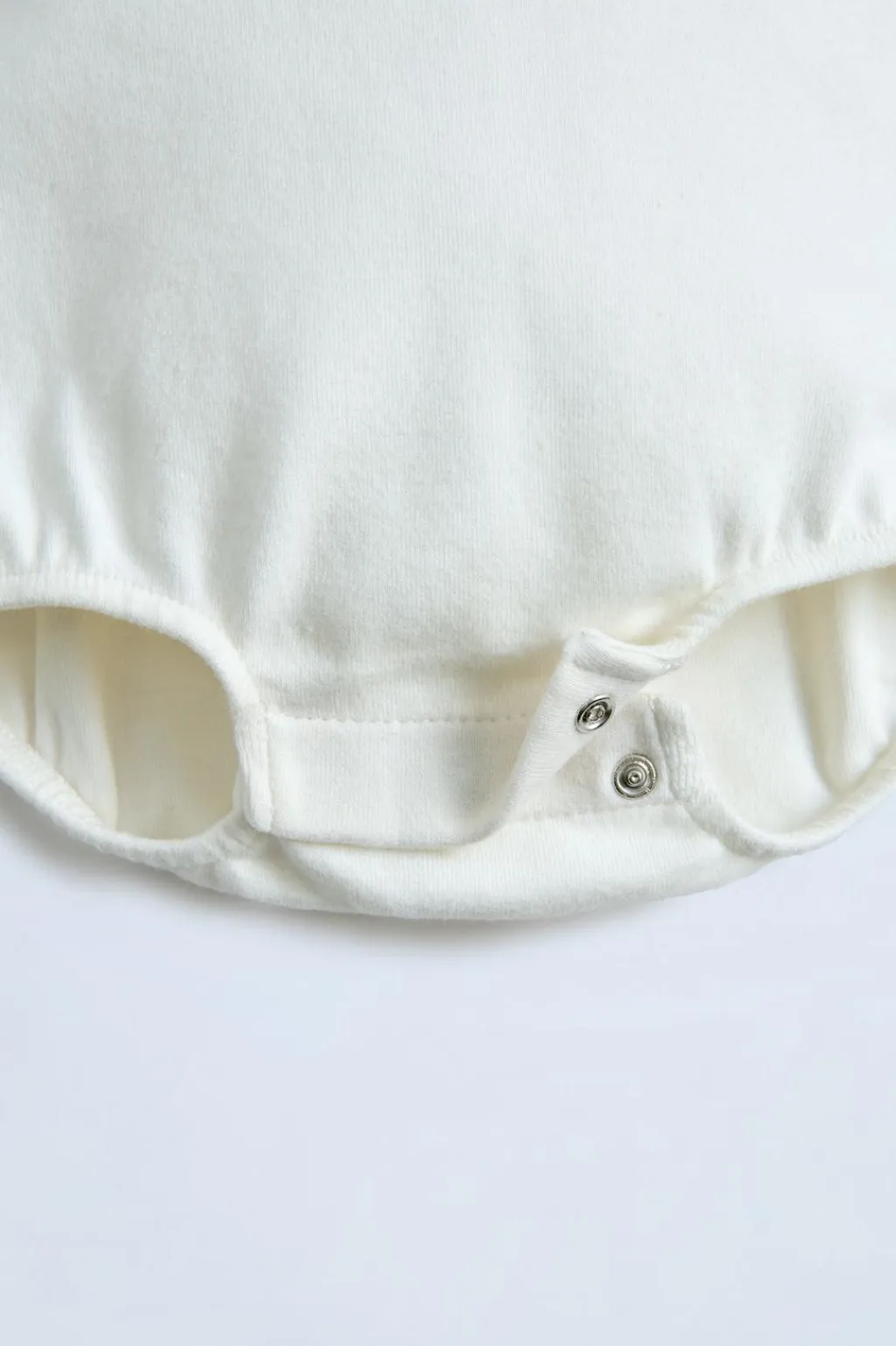 Body con cuello tipo bobo bordado y manga larga. Cierre con botones tipo presión en espalda y bajo.