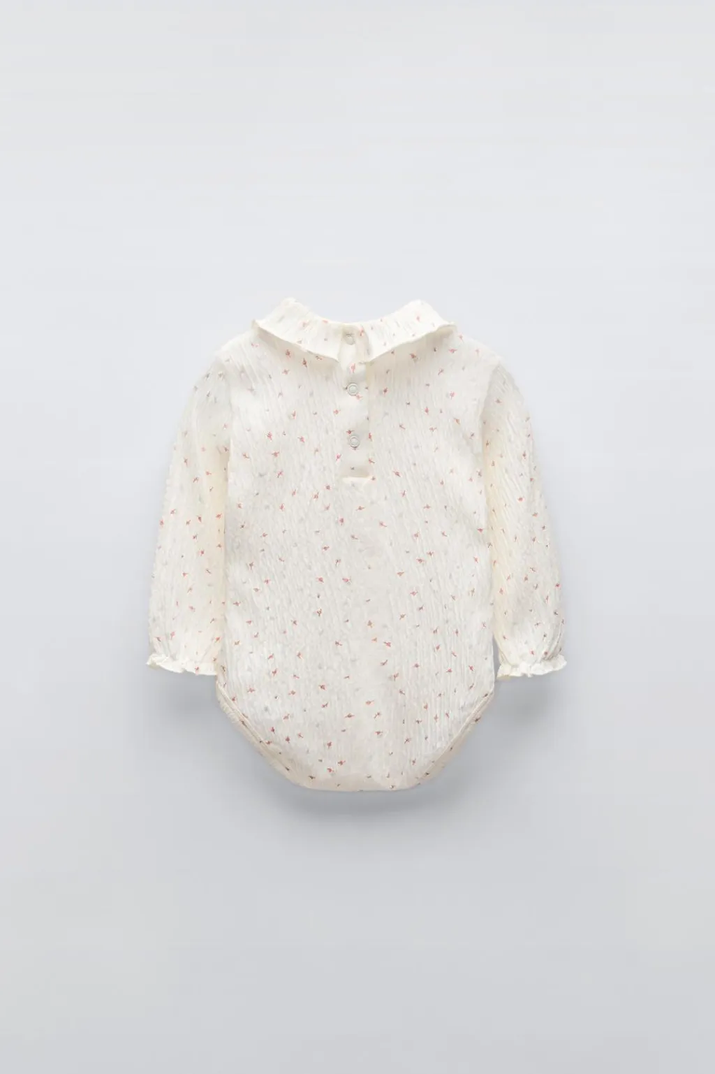 Body con cuello redondo y manga larga acabada en goma. Aplique volante en cuello. Cierre con botones tipo presión en espalda y bajo.
