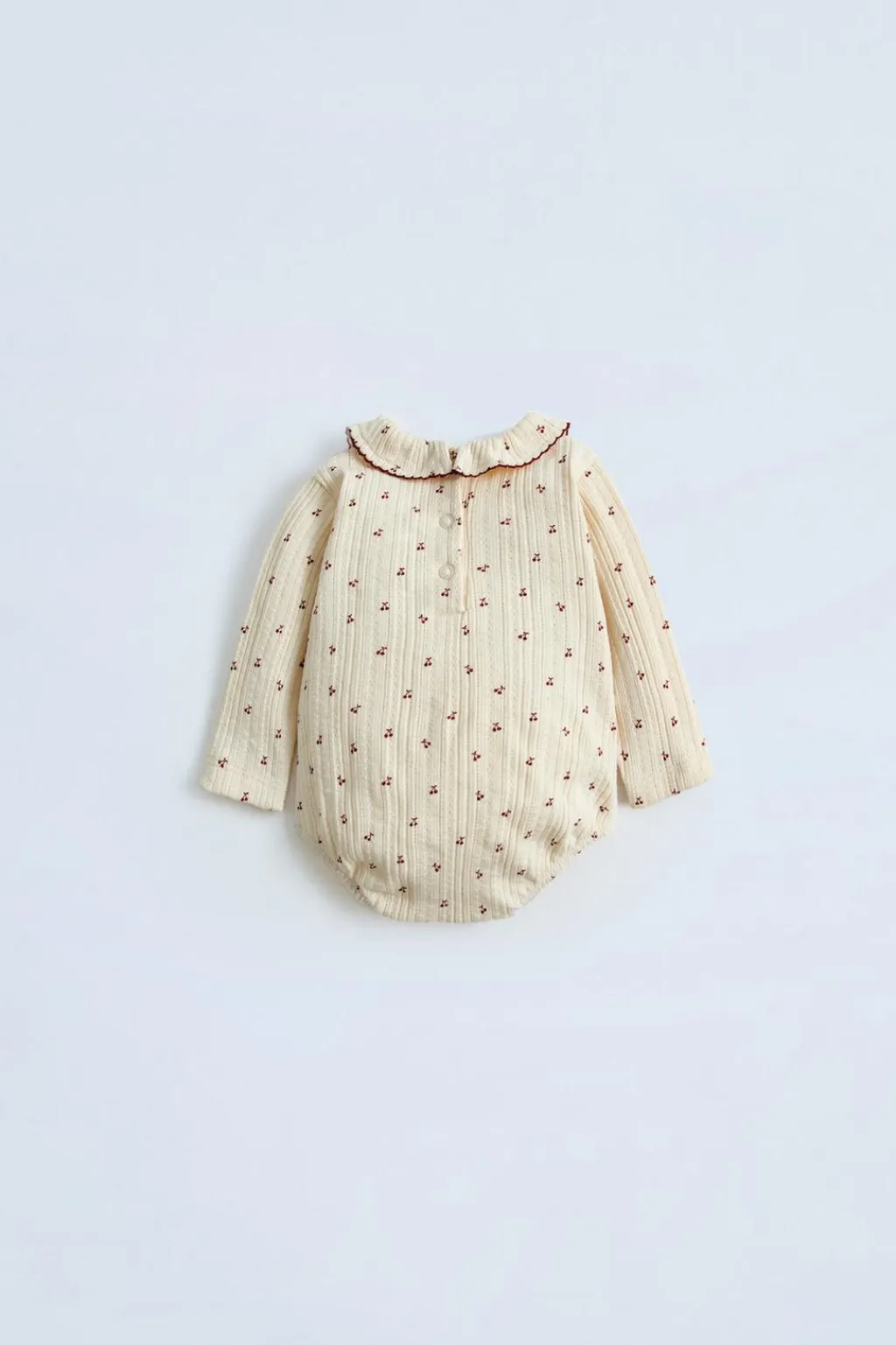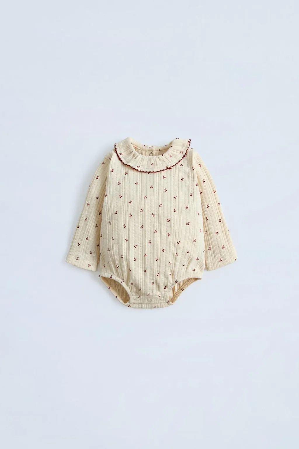 Body con cuello redondo con aplique volante y manga larga. Cierre con botones tipo presión en espalda y bajo. Estampado cerezas.