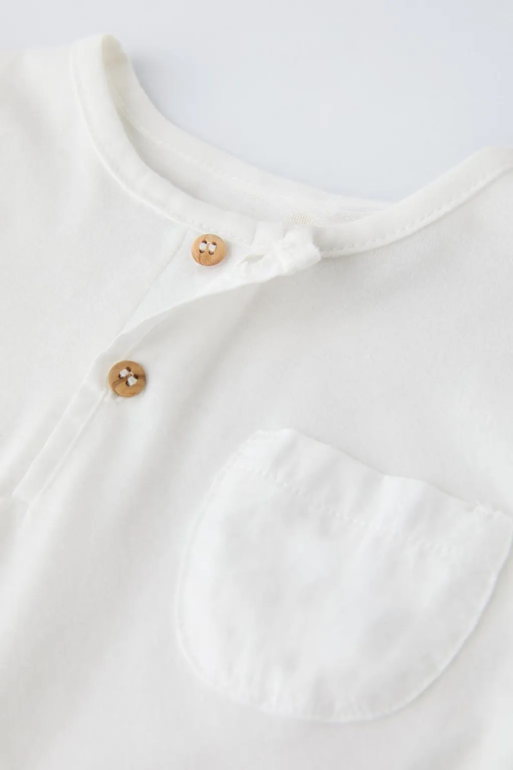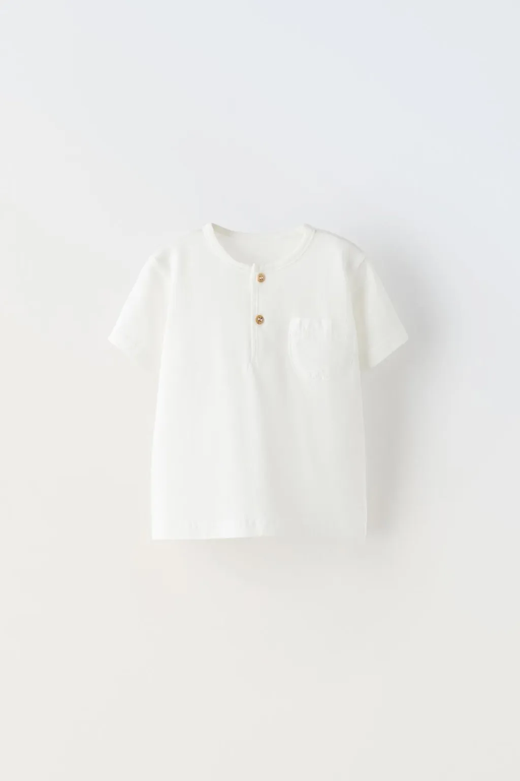 Camiseta con cuello redondo y manga corta. Cierre botones frontal en canesú. Bolsillo de tipo palstrón en pechera.