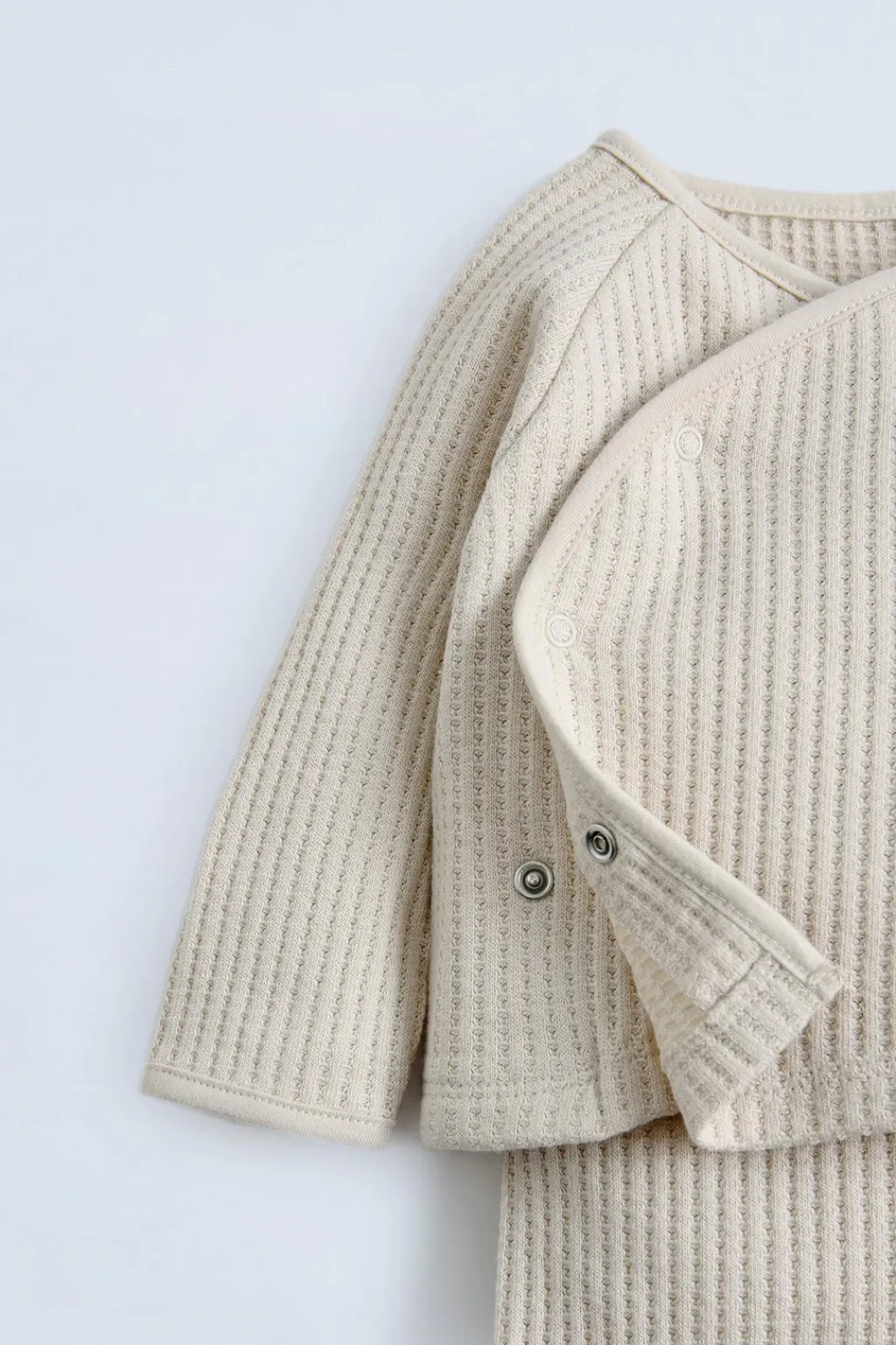 Conjunto de dos piezas. Camiseta con cuello redondo y manga larga. Cierre cruzado con botones tipo snap. Poilana con cinturilla elástica.